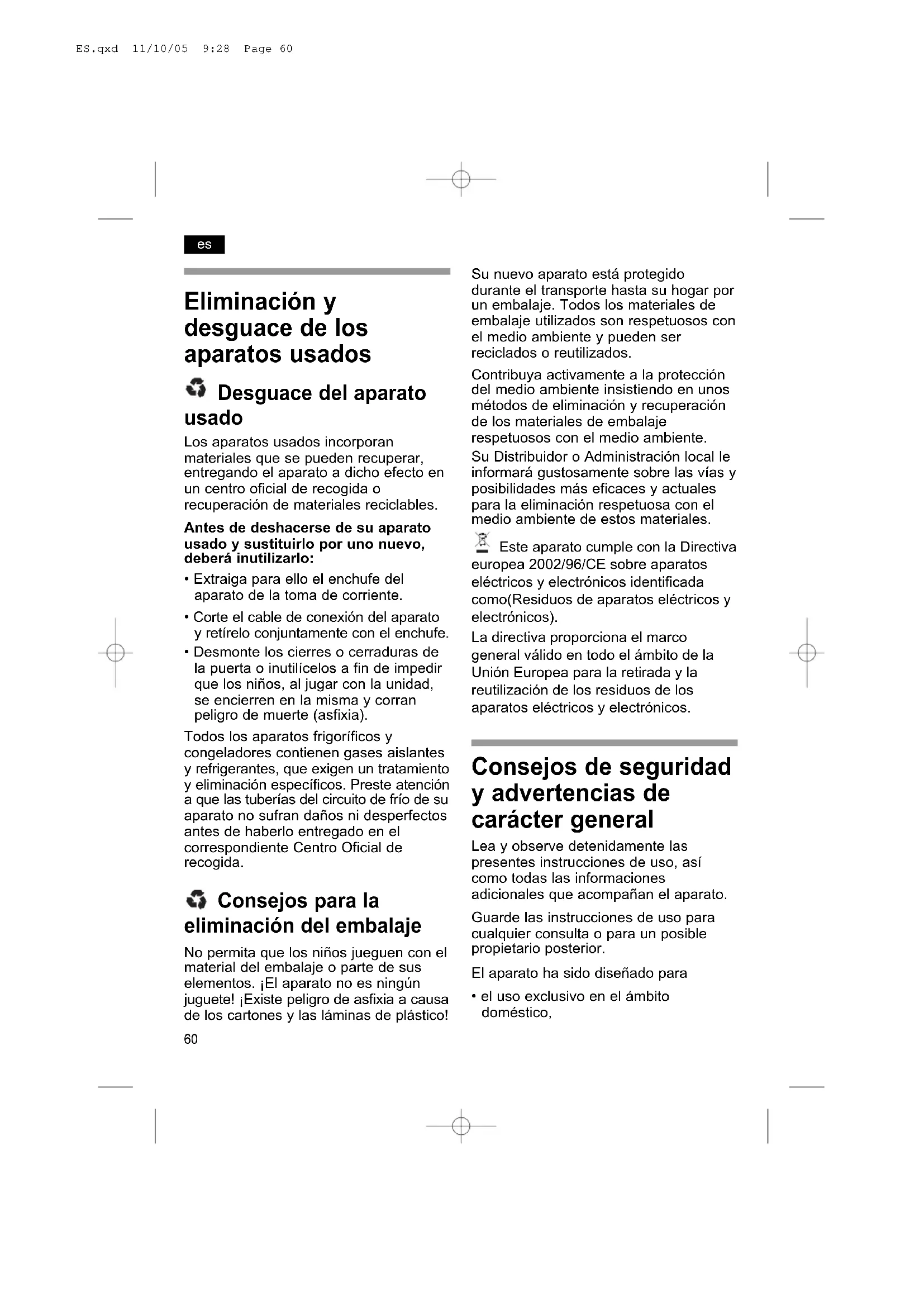 - Desmonte los cierres o cerraduras de la puerta o inutilícelos a fin de impedir que los niños, al jugar con la unidad, se encierren en la misma y corran peligro de muerte (asfixia). Todos los aparatos frigoríficos y congeladores contienen gases aislantes y refrigerantes, que exigen un tratamiento y eliminación específicos. Preste atención a que las tuberías del circuito de frío de su aparato no sufran daños ni desperfectos antes de haberlo entregado en el correspondiente Centro Oficial de recogida. Consejos para la eliminación del embalaje No permita que los niños jueguen con el material del embalaje o parte de sus elementos. ¡El aparato no es ningún juguete! ¡Existe peligro de asfixia a causa de los cartones y las láminas de plástico! Su nuevo aparato está protegido durante el transporte hasta su hogar por un embalaje. Todos los materiales de embalaje utilizados son respetuosos con el medio ambiente y pueden ser reciclados o reutilizados. Contribuya activamente a la protección del medio ambiente insistiendo en unos métodos de eliminación y recuperación de los materiales de embalaje respetuosos con el medio ambiente. Su Distribuidor o Administración local le informará gustosamente sobre las vías y posibilidades más eficaces y actuales para la eliminación respetuosa con el medio ambiente de estos materiales. Este aparato cumple con la Directiva europea 2002/96/CE sobre aparatos eléctricos y electrónicos identificada como(Residuos de aparatos eléctricos y electrónicos). La directiva proporciona el marco general válido en todo el ámbito de la Unión Europea para la retirada y la reutilización de los residuos de los aparatos eléctricos y electrónicos. Consejos de seguridad y advertencias de carácter general Lea y observe detenidamente las presentes instrucciones de uso, así como todas las informaciones adicionales que acompañan el aparato. Guarde las instrucciones de uso para cualquier consulta o para un posible propietario posterior. El aparato ha sido diseñado para
