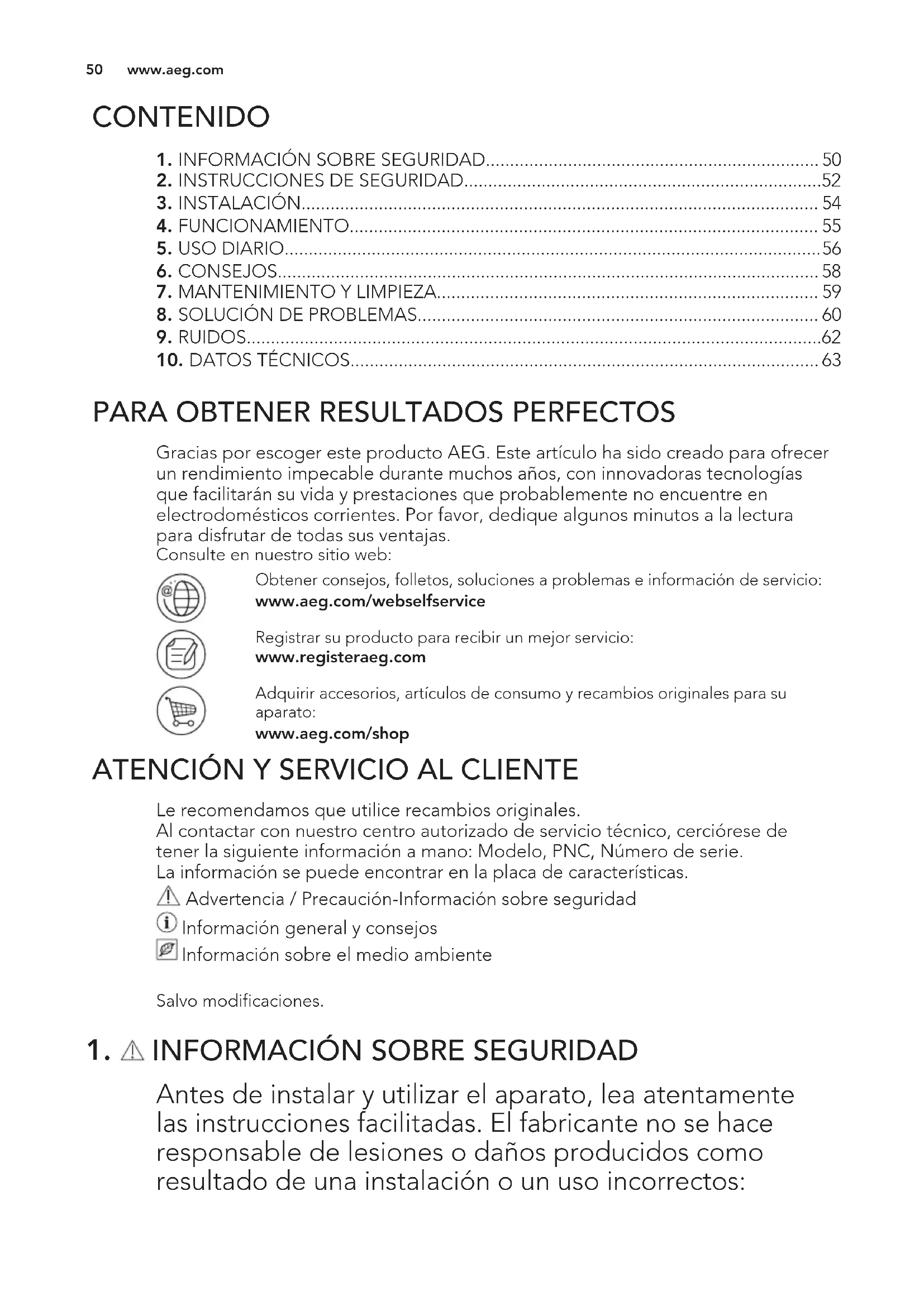 Antes de instalar y utilizar el aparato, lea atentamente las instrucciones facilitadas. El fabricante no se hace responsable de lesiones o daños producidos como resultado de una instalación o un uso incorrectos: www.aeg.com 50Conserve siempre estas instrucciones en lugar seguro y accesible para futuras consultas.