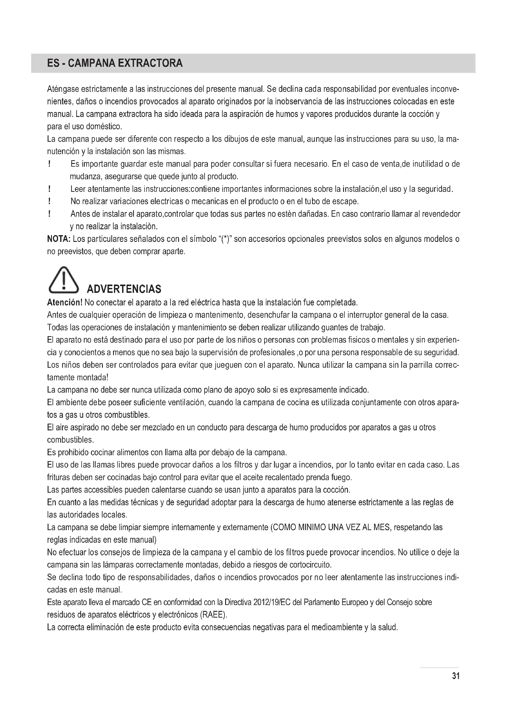 Aténgase estrictamente a las instrucciones del presente manual. Se declina cada responsabilidad por eventuales inconve- nientes, daños o incendios provocados al aparato originados por la inobservancia de las instrucciones colocadas en este manual. La campana extractora ha sido ideada para la aspiración de humos y vapores producidos durante la cocción y para el uso doméstico. La campana puede ser diferente con respecto a los dibujos de este manual, aunque las instrucciones para su uso, la ma- nutención y la instalación son las mismas. ! Es importante guardar este manual para poder consultar si fuera necesario. En el caso de venta,de inutilidad o de mudanza, asegurarse que quede junto al producto. ! Leer atentamente las instrucciones:contiene importantes informaciones sobre la instalación,el uso y la seguridad. ! No realizar variaciones electricas o mecanicas en el producto o en el tubo de escape. ! Antes de instalar el aparato,controlar que todas sus partes no estèn dañadas. En caso contrario llamar al revendedor y no realizar la instalaciòn. NOTA: Los particulares señalados con el símbolo “(*)” son accesorios opcionales preevistos solos en algunos modelos o no preevistos, que deben comprar aparte. ADVERTENCIAS Atención! No conectar el aparato a la red eléctrica hasta que la instalación fue completada. Antes de cualquier operación de limpieza o mantenimento, desenchufar la campana o el interruptor general de la casa. Todas las operaciones de instalación y mantenimiento se deben realizar utilizando guantes de trabajo. El aparato no está destinado para el uso por parte de los niños o personas con problemas sicos o mentales y sin experien- cia y conocientos a menos que no sea bajo la supervisión de profesionales ,o por una persona responsable de su seguridad. Los niños deben ser controlados para evitar que jueguen con el aparato. Nunca utilizar la campana sin la parrilla correc- tamente montada! La campana no debe ser nunca utilizada como plano de apoyo solo si es expresamente indicado. El ambiente debe poseer suciente ventilación, cuando la campana de cocina es utilizada conjuntamente con otros apara- tos a gas u otros combustibles. El aire aspirado no debe ser mezclado en un conducto para descarga de humo producidos por aparatos a gas u otros combustibles. Es prohibido cocinar alimentos con llama alta por debajo de la campana. El uso de las llamas libres puede provocar daños a los ltros y dar lugar a incendios, por lo tanto evitar en cada caso. Las frituras deben ser cocinadas bajo control para evitar que el aceite recalentado prenda fuego. Las partes accessibles pueden calentarse cuando se usan junto a aparatos para la cocción. En cuanto a las medidas técnicas y de seguridad adoptar para la descarga de humo atenerse estrictamente a las reglas de las autoridades locales. La campana se debe limpiar siempre internamente y externamente (COMO MINIMO UNA VEZ AL MES, respetando las reglas indicadas en este manual) No efectuar los consejos de limpieza de la campana y el cambio de los ltros puede provocar incendios. No utilice o deje la campana sin las lámparas correctamente montadas, debido a riesgos de cortocircuito. Se declina todo tipo de responsabilidades, daños o incendios provocados por no leer atentamente las instrucciones indi- cadas en este manual. Este aparato lleva el marcado CE en conformidad con la Directiva 2012/19/EC del Parlamento Europeo y del Consejo sobre residuos de aparatos eléctricos y electrónicos (RAEE). La correcta eliminación de este producto evita consecuencias negativas para el medioambiente y la salud.32 E l s í m b o l o en el producto o en los documentos que se incluyen con el producto, indica que no se puede tratar como residuo doméstico. Es necesario entregarlo en un punto de recogida para reciclar aparatos eléctricos y electrónicos. Deséchelo con arreglo a las normas medioambientales para eliminación de residuos. Para obtener información más detallada sobre el tratamiento, recuperación y reciclaje de este producto, póngase en contac- to con el ayuntamiento, con el servicio de eliminación de residuos urbanos o la tienda donde adquirió el producto. Aparato diseñado, probado y fabricado de acuerdo con:
