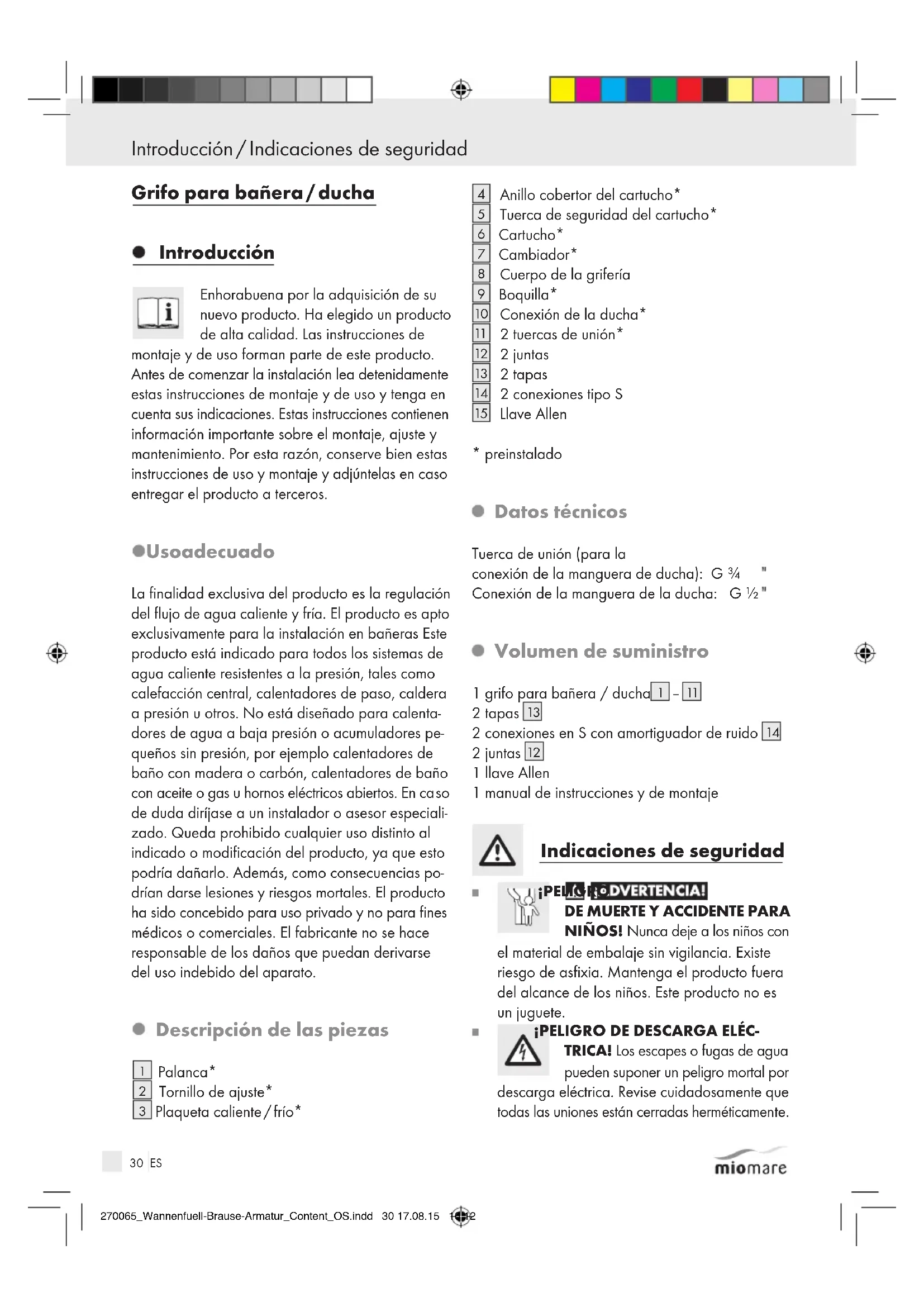 TRICA! Los escapes o fugas de agua pueden suponer un peligro mortal por descarga eléctrica. Revise cuidadosamente que todas las uniones están cerradas herméticamen te. 270065_Wannenfuell-Brause-Armatur_Content_OS.indd 30 17.08.15 16:1231 ES Indicaciones de seguridad / Montaje Introducción / Indicaciones de seguridad Además, asegúrese de que todas las conduccio- nes de los aparatos eléctricos están instaladas correctamente y de manera segura. ¡CUIDADO! ¡PELIGRO DE LESIONES! Asegúrese de que todas las piezas están mon- tadas correctamente y de la forma debida. Si el producto no se monta tal y como se indica en las instrucciones podrían producirse lesiones. Por favor, tenga presente que todas las juntas son piezas de desgaste y de tanto en tanto de- ben ser reemplazadas. Las piezas dañadas pueden mermar la seguridad y el funcionamien- to del producto. Observe que todas las juntas estén en el lugar correcto. ¡PELIGRO DE QUEMADURAS! Al ajustar la temperatura del agua caliente, asegúrese de que el agua no esté demasiado caliente. ¡CUIDADO! Asegúrese de que la plaqueta caliente / frío