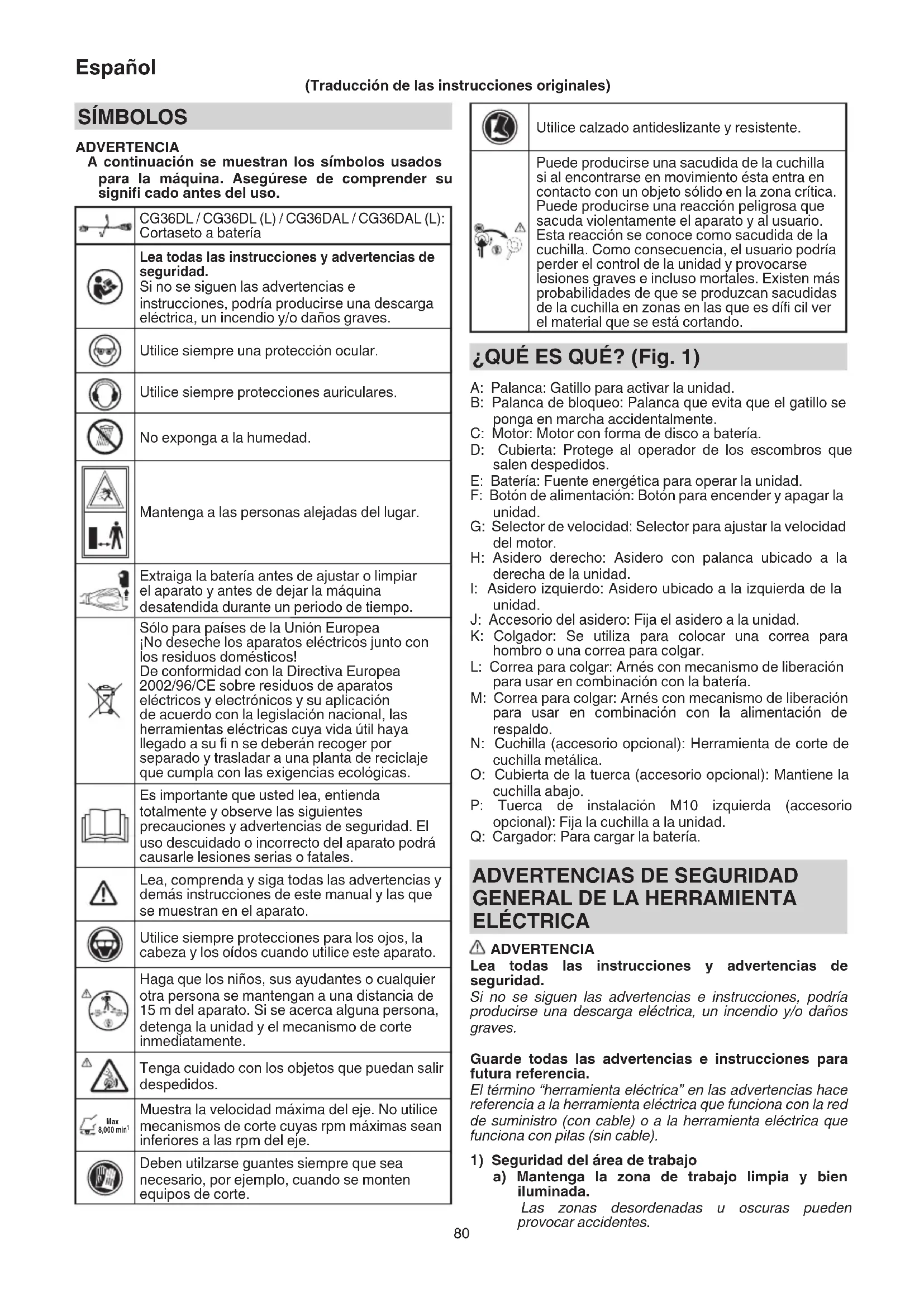 De totale bepaalde trillingswaarde is gemeten in overeenstemming met een standaardtestmethode en is bruikbaar om meerdere gereedschappen met elkaar te vergelijken. U kunt dit ook als beoordeling vooraf aan de blootstelling gebruiken. WAARSCHUWING ○ De trillingsemissiewaarde tijdens het feitelijke gebruik van het elektrisch gereedschap kan afwijken van de opgegeven totale waarde afhankelijk van de manieren waarop het gereedschap wordt gebruikt. ○ Neem kennis van de veiligheidsmaatregelen voor de bescherming van de gebruiker die gebaseerd zijn op een schatting van blootstelling onder feitelijke gebruiksomstandigheden (rekening houdend met alle onderdelen van de gebruikscyclus, zoals de tijd dat het gereedschap is uitgeschakeld en wanneer dit onbelast draait inclusief de triggertijd). 000BookCG36DL.indb79000BookCG36DL.indb79 2016/03/0110:25:392016/03/0110:25:3980 Español Utilice calzado antideslizante y resistente. Puede producirse una sacudida de la cuchilla si al encontrarse en movimiento ésta entra en contacto con un objeto sólido en la zona crítica. Puede producirse una reacción peligrosa que sacuda violentamente el aparato y al usuario. Esta reacción se conoce como sacudida de la cuchilla. Como consecuencia, el usuario podría perder el control de la unidad y provocarse lesiones graves e incluso mortales. Existen más probabilidades de que se produzcan sacudidas de la cuchilla en zonas en las que es dífi cil ver el material que se está cortando. ¿QUÉ ES QUÉ? (Fig. 1) A: Palanca: Gatillo para activar la unidad. B: Palanca de bloqueo: Palanca que evita que el gatillo se ponga en marcha accidentalmente. C: Motor: Motor con forma de disco a batería. D: Cubierta: Protege al operador de los escombros que salen despedidos. E: Batería: Fuente energética para operar la unidad. F: Botón de alimentación: Botón para encender y apagar la unidad. G: Selector de velocidad: Selector para ajustar la velocidad del motor. H: Asidero derecho: Asidero con palanca ubicado a la derecha de la unidad. I: Asidero izquierdo: Asidero ubicado a la izquierda de la unidad. J: Accesorio del asidero: Fija el asidero a la unidad. K: Colgador: Se utiliza para colocar una correa para hombro o una correa para colgar. L: Correa para colgar: Arnés con mecanismo de liberación para usar en combinación con la batería. M: Correa para colgar: Arnés con mecanismo de liberación para usar en combinación con la alimentación de respaldo. N: Cuchilla (accesorio opcional): Herramienta de corte de cuchilla metálica. O: Cubierta de la tuerca (accesorio opcional): Mantiene la cuchilla abajo. P: Tuerca de instalación M10 izquierda (accesorio opcional): Fija la cuchilla a la unidad. Q: Cargador: Para cargar la batería.