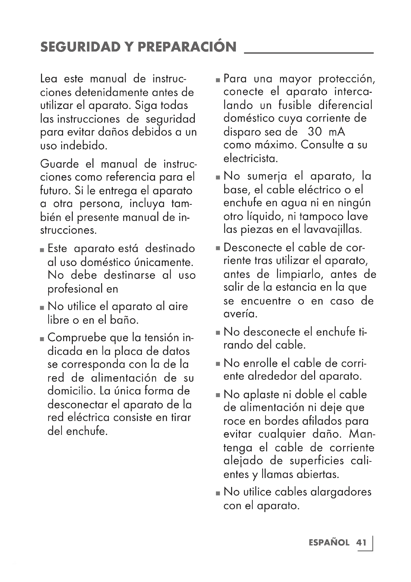 Lea este manual de instruc- ciones detenidamente antes de utilizar el aparato. Siga todas las instrucciones de seguridad para evitar daños debidos a un uso indebido. Guarde el manual de instruc- ciones como referencia para el futuro. Si le entrega el aparato a otra persona, incluya tam- bién el presente manual de in- strucciones.