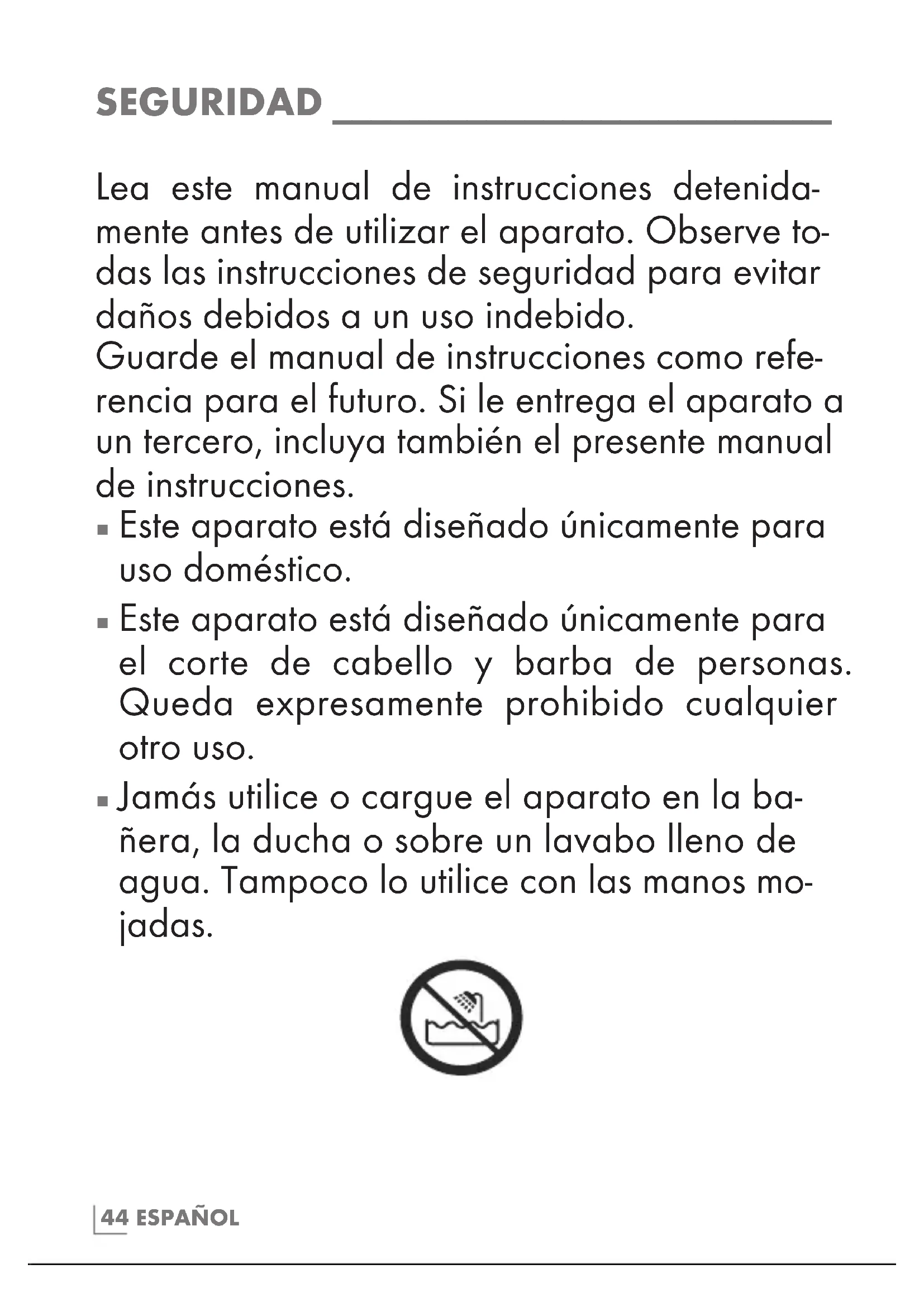 Este aparato está diseñado únicamente para el corte de cabello y barba de personas. Queda expresamente prohibido cualquier otro uso.