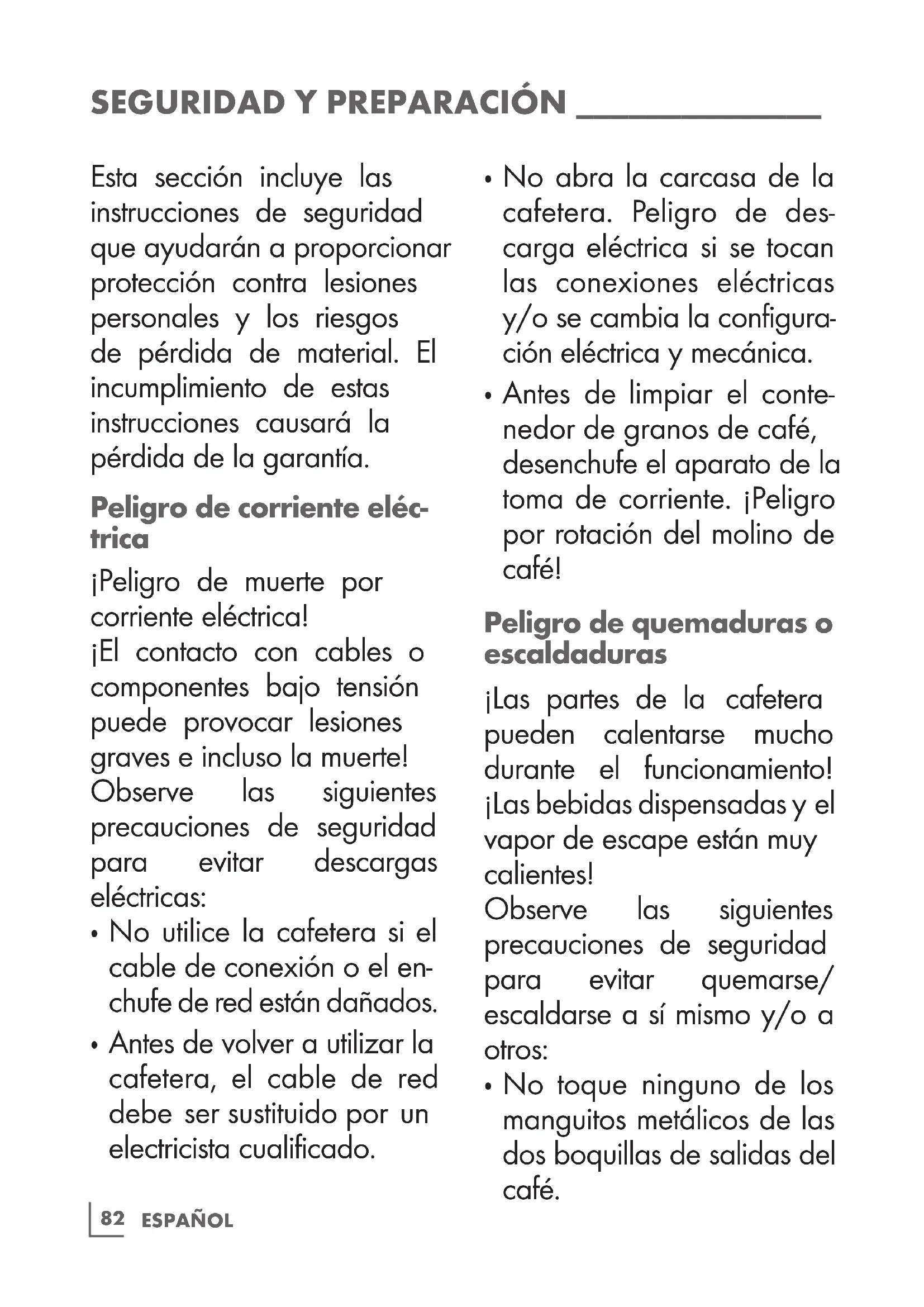 Evitar el contacto directo de la piel con el vapor de es- cape o el agua caliente de lavado, limpieza y descalci- ficación. Precauciones básicas de seguridad Observe las siguientes precauciones de seguridad para garantizar una manipulación segura de la cafetera: