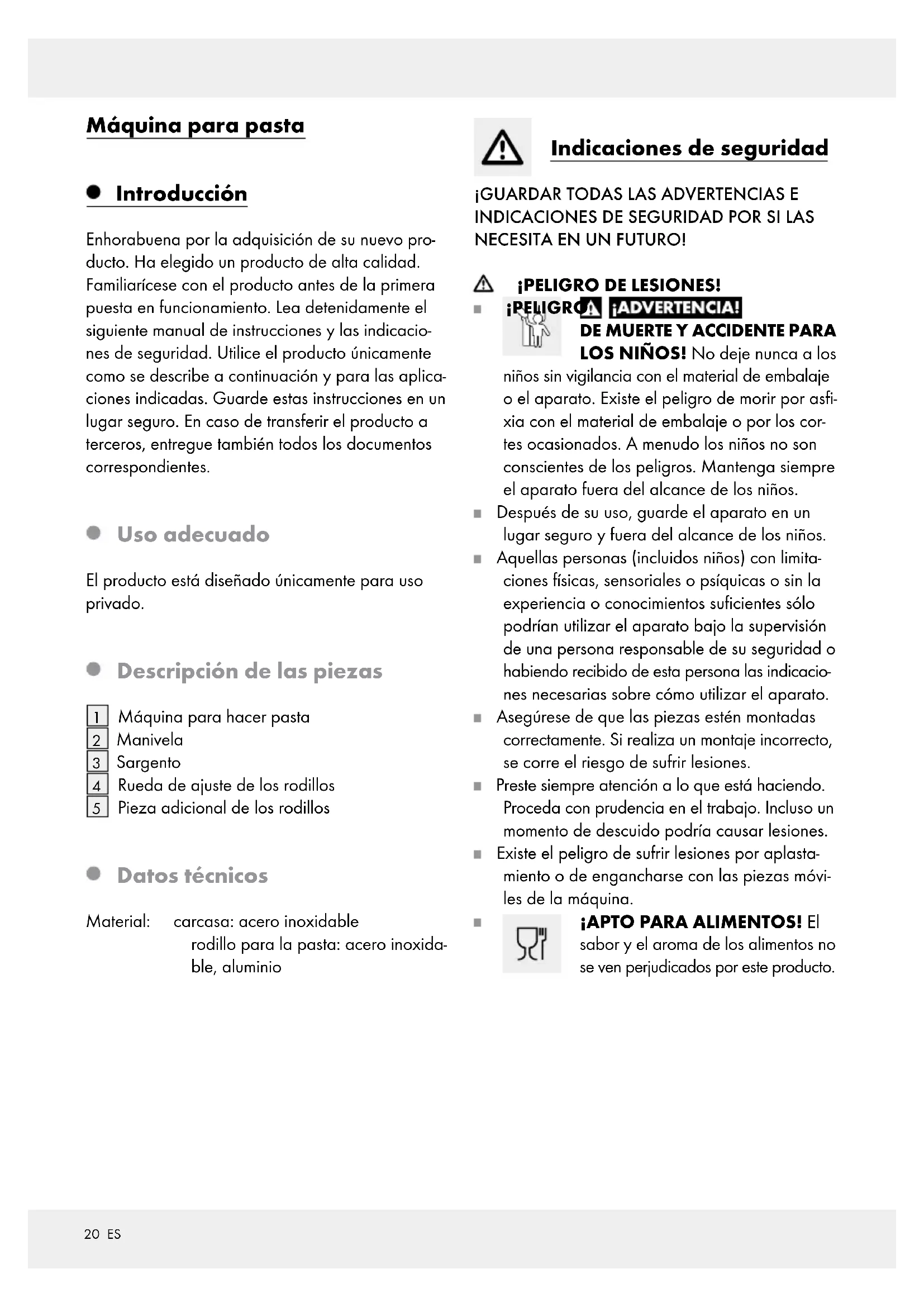 LOS NIÑOS! No deje nunca a los niños sin vigilancia con el material de embalaje o el aparato. Existe el peligro de morir por asfi- xia con el material de embalaje o por los cor- tes ocasionados. A menudo los niños no son conscientes de los peligros. Mantenga siempre el aparato fuera del alcance de los niños. Después de su uso, guarde el aparato en un lugar seguro y fuera del alcance de los niños. Aquellas personas (incluidos niños) con limita- ciones físicas, sensoriales o psíquicas o sin la experiencia o conocimientos suficientes sólo podrían utilizar el aparato bajo la supervisión de una persona responsable de su seguridad o habiendo recibido de esta persona las indicacio- nes necesarias sobre cómo utilizar el aparato. Asegúrese de que las piezas estén montadas correctamente. Si realiza un montaje incorrecto, se corre el riesgo de sufrir lesiones. Preste siempre atención a lo que está haciendo. Proceda con prudencia en el trabajo. Incluso un momento de descuido podría causar lesiones. Existe el peligro de sufrir lesiones por aplasta- miento o de engancharse con las piezas móvi- les de la máquina. ¡APTO PARA ALIMENTOS! El sabor y el aroma de los alimentos no se ven perjudicados por este producto.21 ES Preparación Receta básica para preparar una masa de pasta italiana Ingredientes 300 g de harina (preferiblemente de sémola de trigo duro) 130 ml de agua mineral natural ½ cucharadita de sal