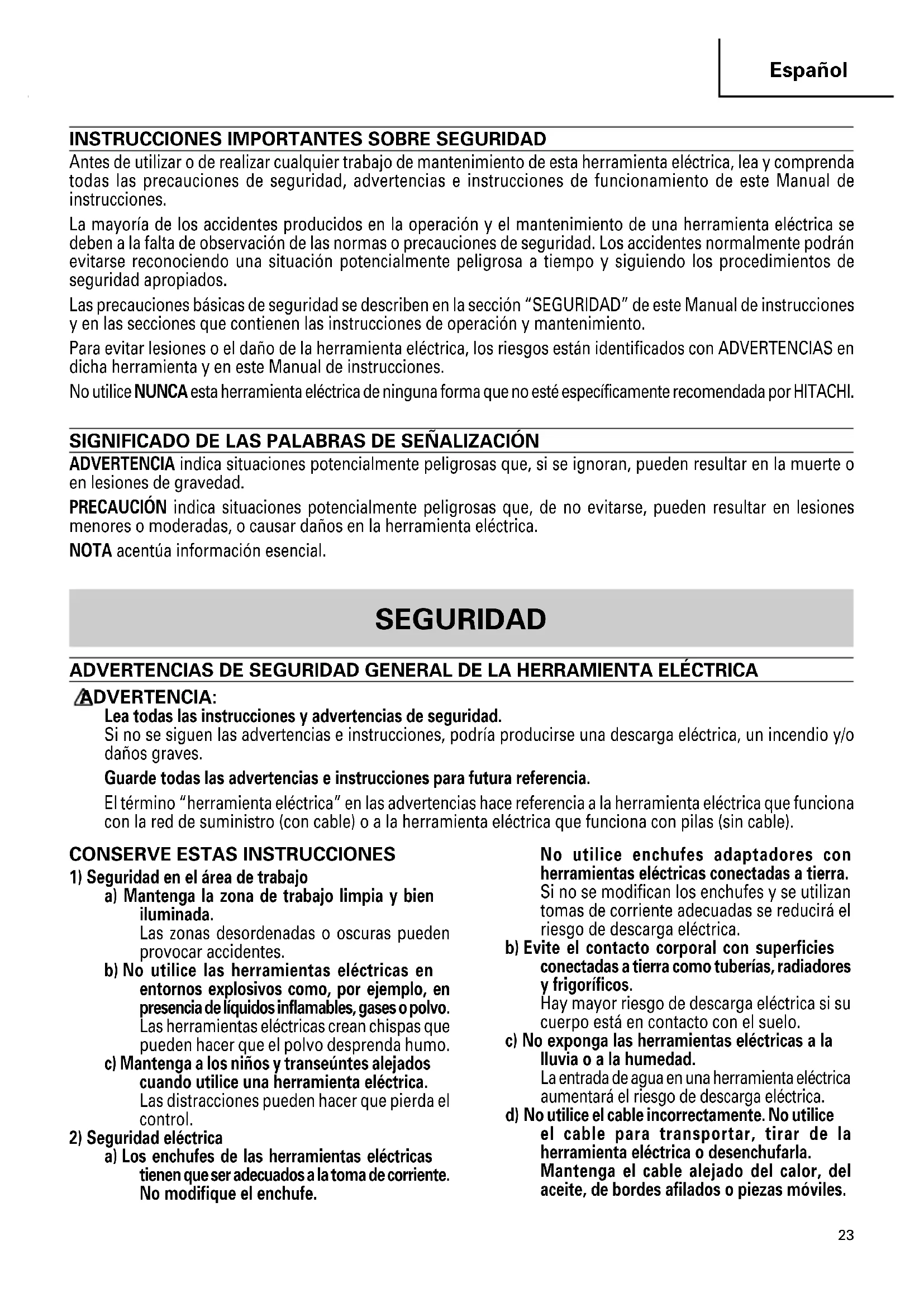 Antes de utilizar o de realizar cualquier trabajo de mantenimiento de esta herramienta eléctrica, lea y comprenda todas las precauciones de seguridad, advertencias e instrucciones de funcionamiento de este Manual de instrucciones. La mayoría de los accidentes producidos en la operación y el mantenimiento de una herramienta eléctrica se deben a la falta de observación de las normas o precauciones de seguridad. Los accidentes normalmente podrán evitarse reconociendo una situación potencialmente peligrosa a tiempo y siguiendo los procedimientos de seguridad apropiados. Las precauciones básicas de seguridad se describen en la sección “SEGURIDAD” de este Manual de instrucciones y en las secciones que contienen las instrucciones de operación y mantenimiento. Para evitar lesiones o el daño de la herramienta eléctrica, los riesgos están identificados con ADVERTENCIAS en dicha herramienta y en este Manual de instrucciones. No utilice NUNCA esta herramienta eléctrica de ninguna forma que no esté específicamente recomendada por HITACHI. SIGNIFICADO DE LAS PALABRAS DE SEÑALIZACIÓN ADVERTENCIA indica situaciones potencialmente peligrosas que, si se ignoran, pueden resultar en la muerte o en lesiones de gravedad. PRECAUCIÓN indica situaciones potencialmente peligrosas que, de no evitarse, pueden resultar en lesiones menores o moderadas, o causar daños en la herramienta eléctrica. NOTA acentúa información esencial. SEGURIDAD ADVERTENCIAS DE SEGURIDAD GENERAL DE LA HERRAMIENTA ELÉCTRICA ADVERTENCIA: Lea todas las instrucciones y advertencias de seguridad. Si no se siguen las advertencias e instrucciones, podría producirse una descarga eléctrica, un incendio y/o daños graves. Guarde todas las advertencias e instrucciones para futura referencia. El término “herramienta eléctrica” en las advertencias hace referencia a la herramienta eléctrica que funciona con la red de suministro (con cable) o a la herramienta eléctrica que funciona con pilas (sin cable).