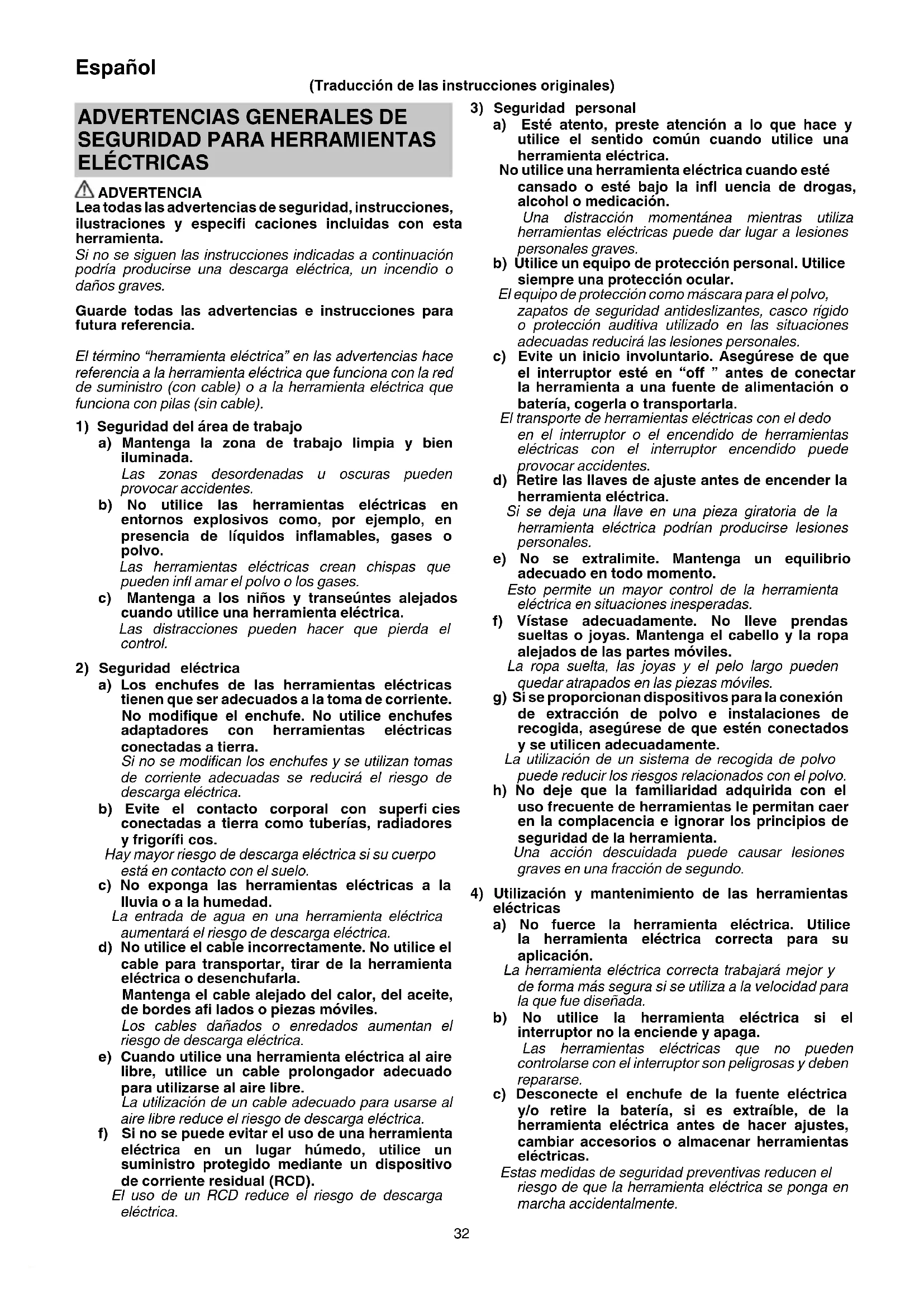 a) Los enchufes de las herramientas eléctricas tienen que ser adecuados a la toma de corriente. No modifi que el enchufe. No utilice enchufes adaptadores con herramientas eléctricas conectadas a tierra. Si no se modifi can los enchufes y se utilizan tomas de corriente adecuadas se reducirá el riesgo de descarga eléctrica. b) Evite el contacto corporal con superfi cies conectadas a tierra como tuberías, radiadores y frigorífi cos. Hay mayor riesgo de descarga eléctrica si su cuerpo está en contacto con el suelo. c) No exponga las herramientas eléctricas a la lluvia o a la humedad. La entrada de agua en una herramienta eléctrica aumentará el riesgo de descarga eléctrica. d) No utilice el cable incorrectamente. No utilice el cable para transportar, tirar de la herramienta eléctrica o desenchufarla. Mantenga el cable alejado del calor, del aceite, de bordes afi lados o piezas móviles. Los cables dañados o enredados aumentan el riesgo de descarga eléctrica. e) Cuando utilice una herramienta eléctrica al aire libre, utilice un cable prolongador adecuado para utilizarse al aire libre. La utilización de un cable adecuado para usarse al aire libre reduce el riesgo de descarga eléctrica. f) Si no se puede evitar el uso de una herramienta eléctrica en un lugar húmedo, utilice un suministro protegido mediante un dispositivo de corriente residual (RCD). El uso de un RCD reduce el riesgo de descarga eléctrica. (Traducción de las instrucciones originales) 0000BookDH28PEC.indb320000BookDH28PEC.indb32 2022/12/0714:01:182022/12/0714:01:1833 Español d) Guarde las herramientas eléctricas que no se utilicen fuera del alcance de los niños, y no permita que utilicen las herramientas eléctricas personas no familiarizadas con las mismas o con estas instrucciones. Las herramientas eléctricas son peligrosas si son utilizadas por usuarios sin formación. e) Realice el mantenimiento de las herramientas eléctricas y accesorios. Compruebe si las piezas móviles están mal alineadas o unidas, si hay alguna pieza rota u otra condición que pudiera afectar al funcionamiento de las herramientas eléctricas. Si la herramienta eléctrica está dañada, llévela a reparar antes de utilizarla. Se producen muchos accidentes por no realizar un mantenimiento correcto de las herramientas eléctricas. f) Mantenga las herramientas de corte afi ladas y limpias. Las herramientas de corte correctamente mantenidas con los bordes de corte afi lados son más fáciles de controlar, y existe menor riesgo de que se atasquen. g) Utilice la herramienta eléctrica, los accesorios y las brocas de la herramienta, etc. de acuerdo con estas instrucciones, teniendo en cuenta las condiciones de trabajo y el trabajo que se va a realizar. La utilización de la herramienta eléctrica para operaciones diferentes a las previstas podría dar lugar a una situación peligrosa. h) Mantenga los mangos y las superfi cies de agarre secas, limpias y libres de aceite y grasa. Los mangos y las superfi cies de agarre resbaladizos no permiten el manejo y el control seguros de la herramienta en situaciones inesperadas.
