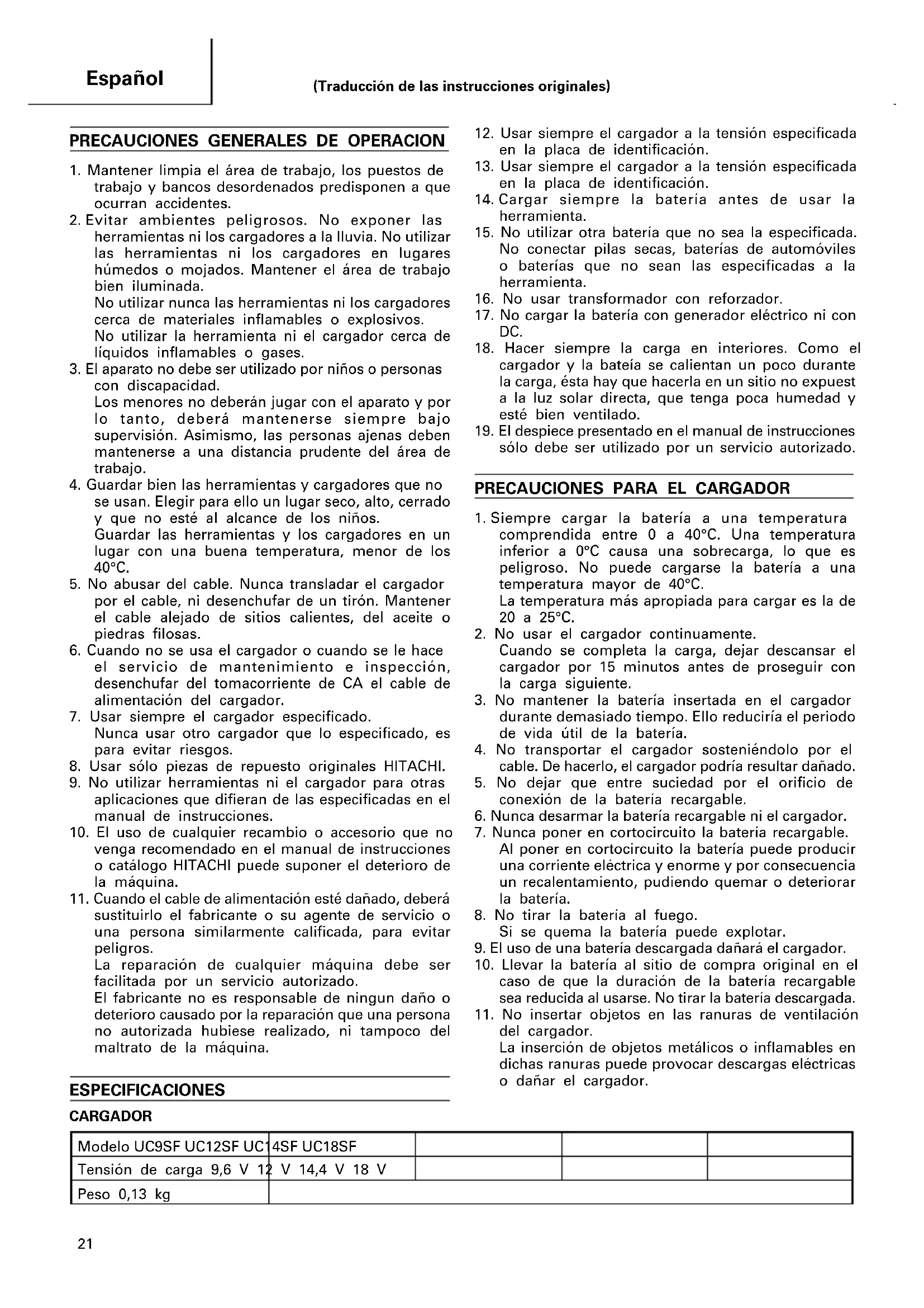 Descarga las instrucciones para tu Cargador de batería en formato PDF gratis! Encuentra tus instrucciones UC 9SF - HITACHI y toma tu dispositivo electrónico nuevamente en la mano. En esta página están publicados todos los documentos necesarios para el uso de su dispositivo. UC 9SF de la marca HITACHI.