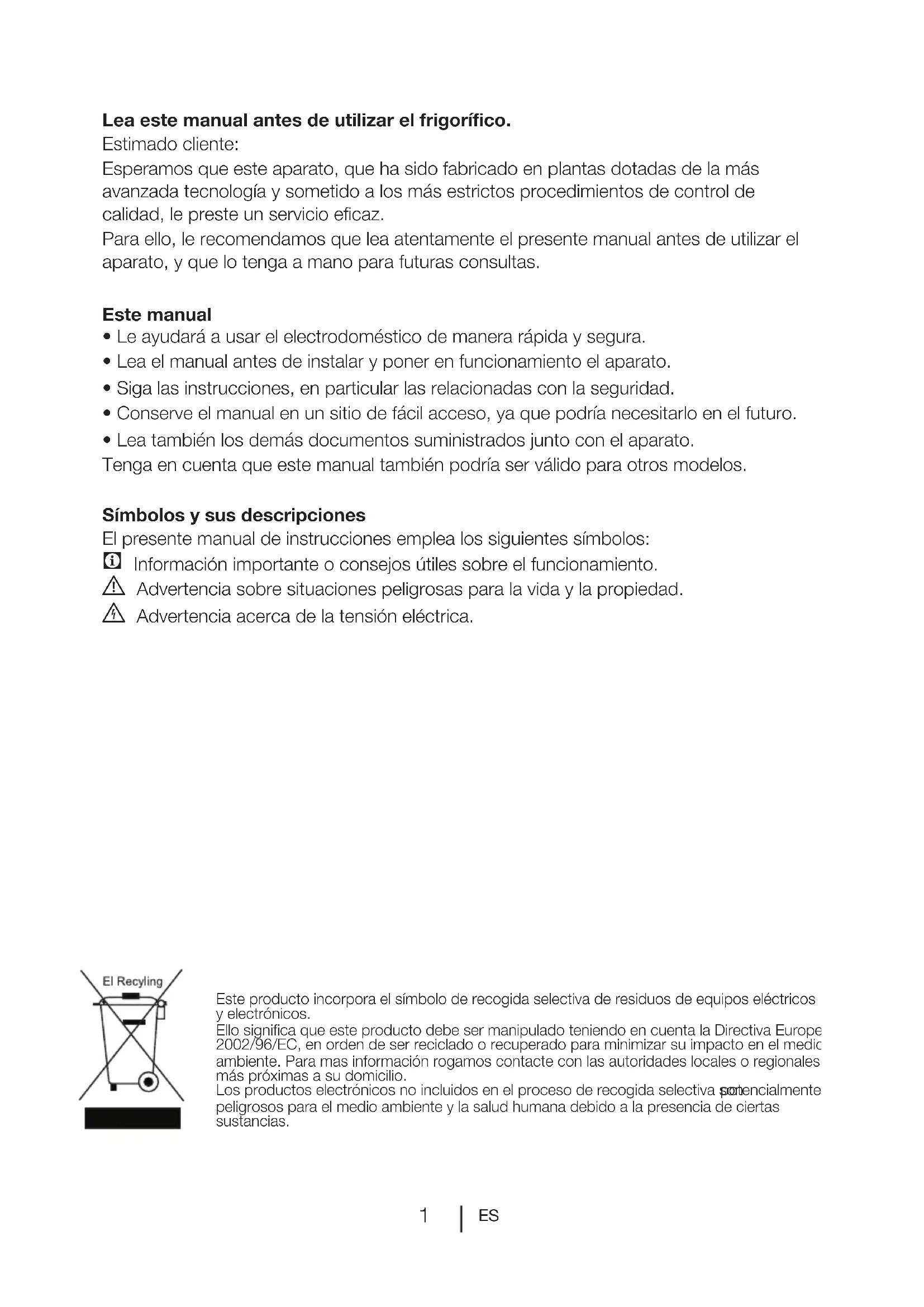 Lea este manual antes de utilizar el frigorífico. Estimado cliente: Esperamos que este aparato, que ha sido fabricado en plantas dotadas de la más avanzada tecnología y sometido a los más estrictos procedimientos de control de calidad, le preste un servicio eficaz. Para ello, le recomendamos que lea atentamente el presente manual antes de utilizar el aparato, y que lo tenga a mano para futuras consultas. Este manual
