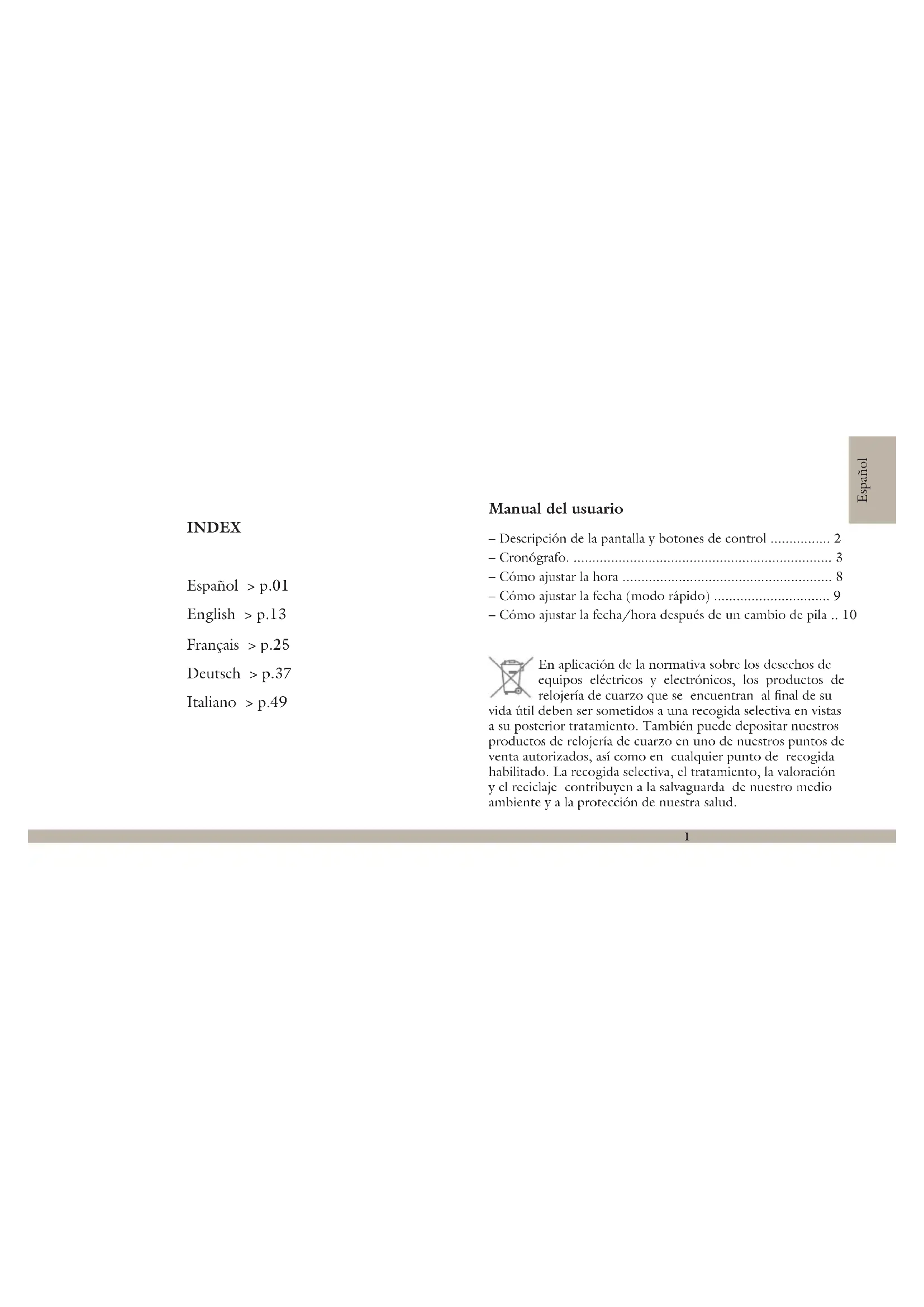 - – Cómo ajustar la fecha/hora después de un cambio de pila En aplicación de la normativa sobre los desechos de equipos eléctricos y electrónicos, los productos de relojería de cuarzo que se encuentran al final de su vida útil deben ser sometidos a una recogida selectiva en vistas a su posterior tratamiento. También puede depositar nuestros productos de relojería de cuarzo en uno de nuestros puntos de venta autorizados, así como en cualquier punto de recogida habilitado. La recogida selectiva, el tratamiento, la valoración y el reciclaje contribuyen a la salvaguarda de nuestro medio ambiente y a la protección de nuestra salud.2 p. 10