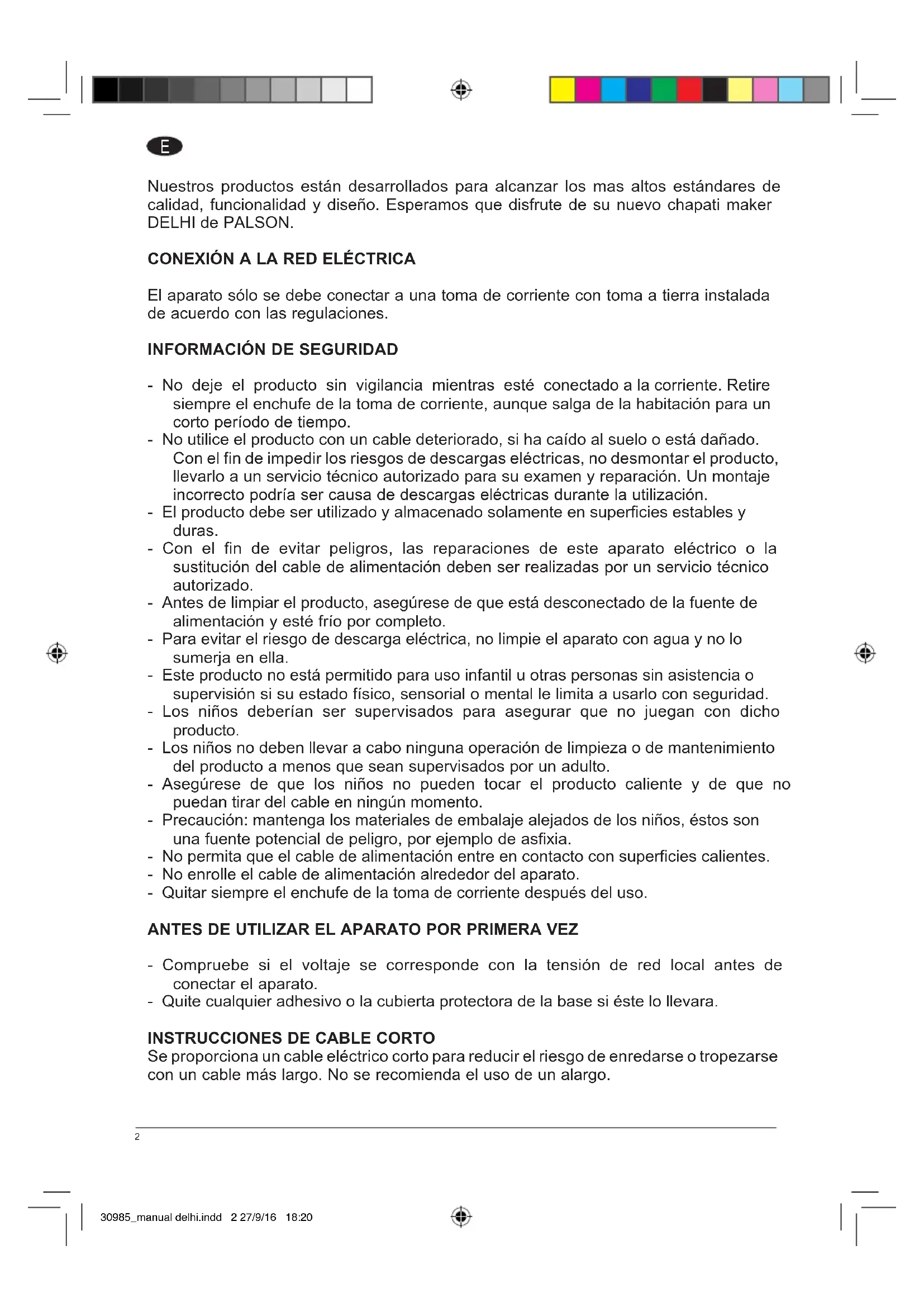 30985_manual delhi.indd 1 27/9/16 18:202 Nuestros productos están desarrollados para alcanzar los mas altos estándares de calidad, funcionalidad y diseño. Esperamos que disfrute de su nuevo chapati maker DELHI de PALSON. CONEXIÓN A LA RED ELÉCTRICA El aparato sólo se debe conectar a una toma de corriente con toma a tierra instalada de acuerdo con las regulaciones.