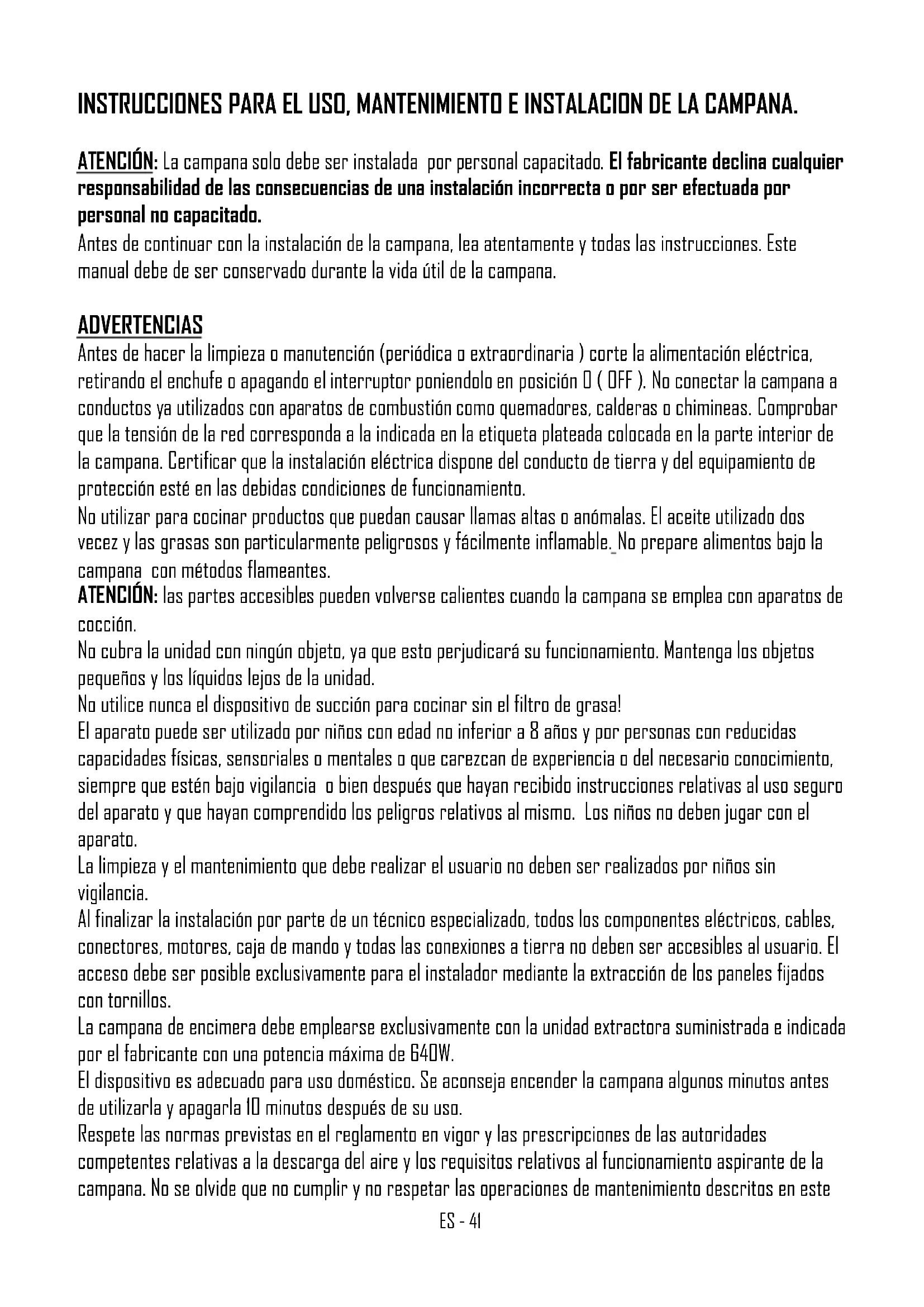 Nettoyage de la hotte Le nettoyage règulier des surfaces èvite l’accumulation de salutes tenaces difficiles à èliminer. Si la hotte est peinte ou cuivrée, utiliser un chiffon souple avec de l’eau tiède et un détergent neutre. Il est interdit de verser des liquides directement sur la hotte et d’utiliser des produits granuleux et/ou abrasifs. Ne pas utiliser de produits agressifs, dissolvants chimiques ou dérivés de distillats de pétrole qui pour- raient laisser des résidus huileux susceptibles d’oxydation et de polymérisation. La firme constructrice ne répond pas de dommages esthétiques causés par la non observation des indications énumérées ci-dessus. KFCPZES - 41 INSTRUCCIONES PARA EL USO, MANTENIMIENTO E INSTALACION DE LA CAMPANA. ATENCIÓN: La campana solo debe ser instalada por personal capacitado. El fabricante declina cualquier responsabilidad de las consecuencias de una instalación incorrecta o por ser efectuada por personal no capacitado. Antes de continuar con la instalación de la campana, lea atentamente y todas las instrucciones. Este manual debe de ser conservado durante la vida útil de la campana. ADVERTENCIAS Antes de hacer la limpieza o manutención (periódica o extraordinaria ) corte la alimentación eléctrica, retirando el enchufe o apagando el interruptor poniendolo en posición 0 ( OFF ). No conectar la campana a conductos ya utilizados con aparatos de combustión como quemadores, calderas o chimineas. Comprobar que la tensión de la red corresponda a la indicada en la etiqueta plateada colocada en la parte interior de la campana. Certificar que la instalación eléctrica dispone del conducto de tierra y del equipamiento de protección esté en las debidas condiciones de funcionamiento. No utilizar para cocinar productos que puedan causar llamas altas o anómalas. El aceite utilizado dos vecez y las grasas son particularmente peligrosos y fácilmente inflamable. No prepare alimentos bajo la campana con métodos flameantes. ATENCIÓN: las partes accesibles pueden volverse calientes cuando la campana se emplea con aparatos de cocción. No cubra la unidad con ningún objeto, ya que esto perjudicará su funcionamiento. Mantenga los objetos pequeños y los líquidos lejos de la unidad. No utilice nunca el dispositivo de succión para cocinar sin el filtro de grasa! El aparato puede ser utilizado por niños con edad no inferior a 8 años y por personas con reducidas capacidades físicas, sensoriales o mentales o que carezcan de experiencia o del necesario conocimiento, siempre que estén bajo vigilancia o bien después que hayan recibido instrucciones relativas al uso seguro del aparato y que hayan comprendido los peligros relativos al mismo. Los niños no deben jugar con el aparato. La limpieza y el mantenimiento que debe realizar el usuario no deben ser realizados por niños sin vigilancia. Al finalizar la instalación por parte de un técnico especializado, todos los componentes eléctricos, cables, conectores, motores, caja de mando y todas las conexiones a tierra no deben ser accesibles al usuario. El acceso debe ser posible exclusivamente para el instalador mediante la extracción de los paneles fijados con tornillos. La campana de encimera debe emplearse exclusivamente con la unidad extractora suministrada e indicada por el fabricante con una potencia máxima de 640W. El dispositivo es adecuado para uso doméstico. Se aconseja encender la campana algunos minutos antes de utilizarla y apagarla 10 minutos después de su uso. Respete las normas previstas en el reglamento en vigor y las prescripciones de las autoridades competentes relativas a la descarga del aire y los requisitos relativos al funcionamiento aspirante de la campana. No se olvide que no cumplir y no respetar las operaciones de mantenimiento descritos en esteES - 42 manual puede producir un riesgo de incendio. Los textos, imágenes y datos técnicos corresponden al estado de la unidad en el momento de la impresión. Está sujeto a cambios de acuerdo con el desarrollo del producto. INSTALACIÓN La campana debe ser combinado con palcas lineales (inducción o vitrocerámicas), la campana y la placa de cocción deben ser adherentes. No se permite y queda expresamente prohibido el uso con placas de coc- ción de gas. Al finalizar la instalación por parte de un técnico especializado, todos los componentes eléctricos, cables, conectores, motores, caja de mando y todas las conexiones a tierra no deben ser accesibles al usuario. El acceso debe ser posible exclusivamente para el instalador mediante la extracción de los paneles fijados con tornillos. La campana permite dos modos de funcionamiento: filtrante y aspirante. En el modo filtrante, o sea con reciclaje de aire es necesario montar los filtros de carbón ( ver el párrafo sobre los FILTROS DE CARBÓN ). En el modo aspirante o sea el aire es expulso hacia el exterior, es necesario la instalación de un conducto de gases propio y de un sistema de compensación adecuado y dimensionado de acuerdo con las normas en vigor. El tubo de expulsión de gases debe tener el área de sección igual o superior a la salida de la campana. El local donde està instalada la campana, debe disponer de un sistema de compensación que asegure suficiente ventilación, de igual manera cuando son utilizados simultáneamente otros aparatos que usen gas u otros combustibles.