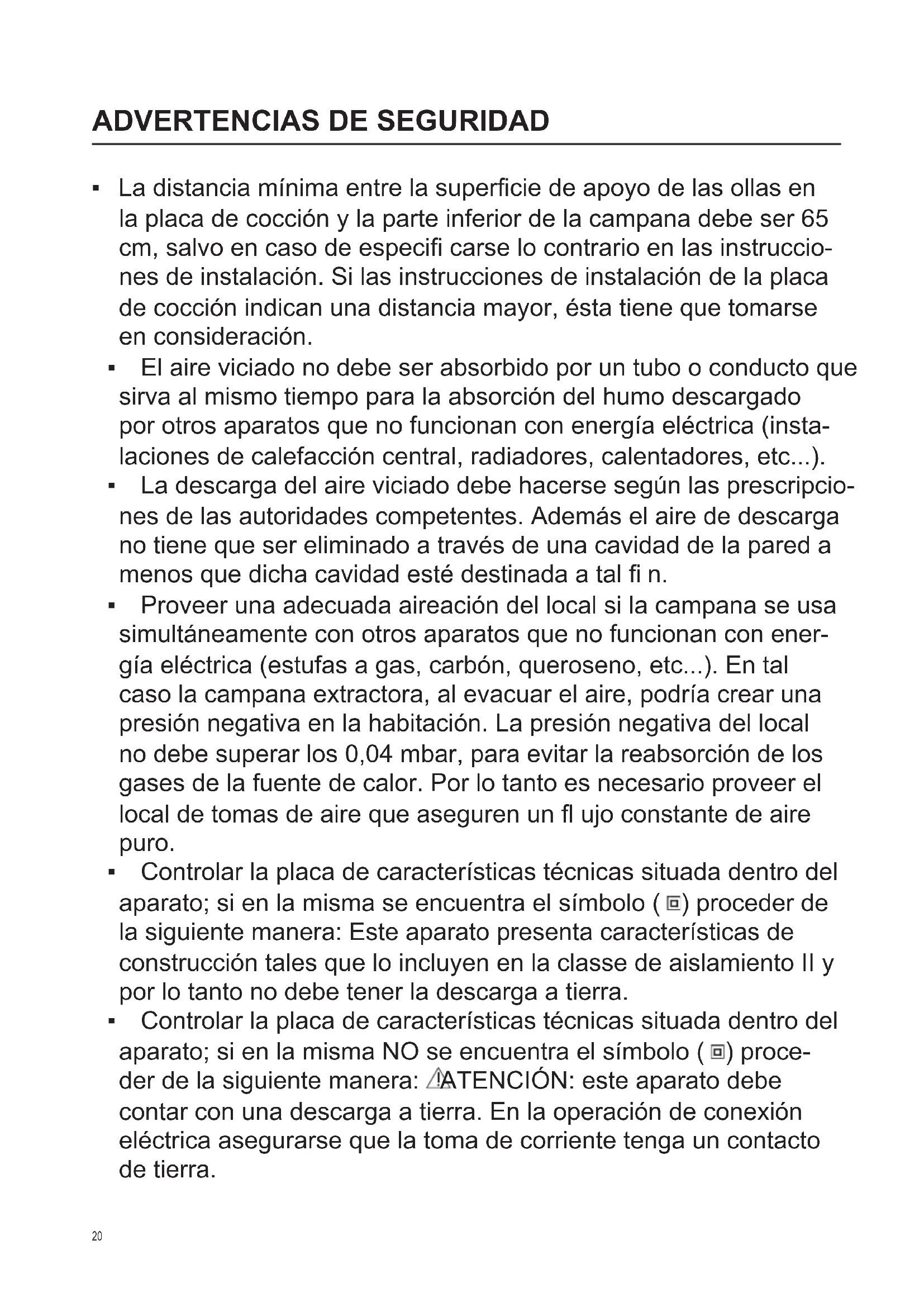 - Proveer una adecuada aireación del local si la campana se usa simultáneamente con otros aparatos que no funcionan con ener- gía eléctrica (estufas a gas, carbón, queroseno, etc...). En tal caso la campana extractora, al evacuar el aire, podría crear una presión negativa en la habitación. La presión negativa del local no debe superar los 0,04 mbar, para evitar la reabsorción de los gases de la fuente de calor. Por lo tanto es necesario proveer el local de tomas de aire que aseguren un fl ujo constante de aire puro.