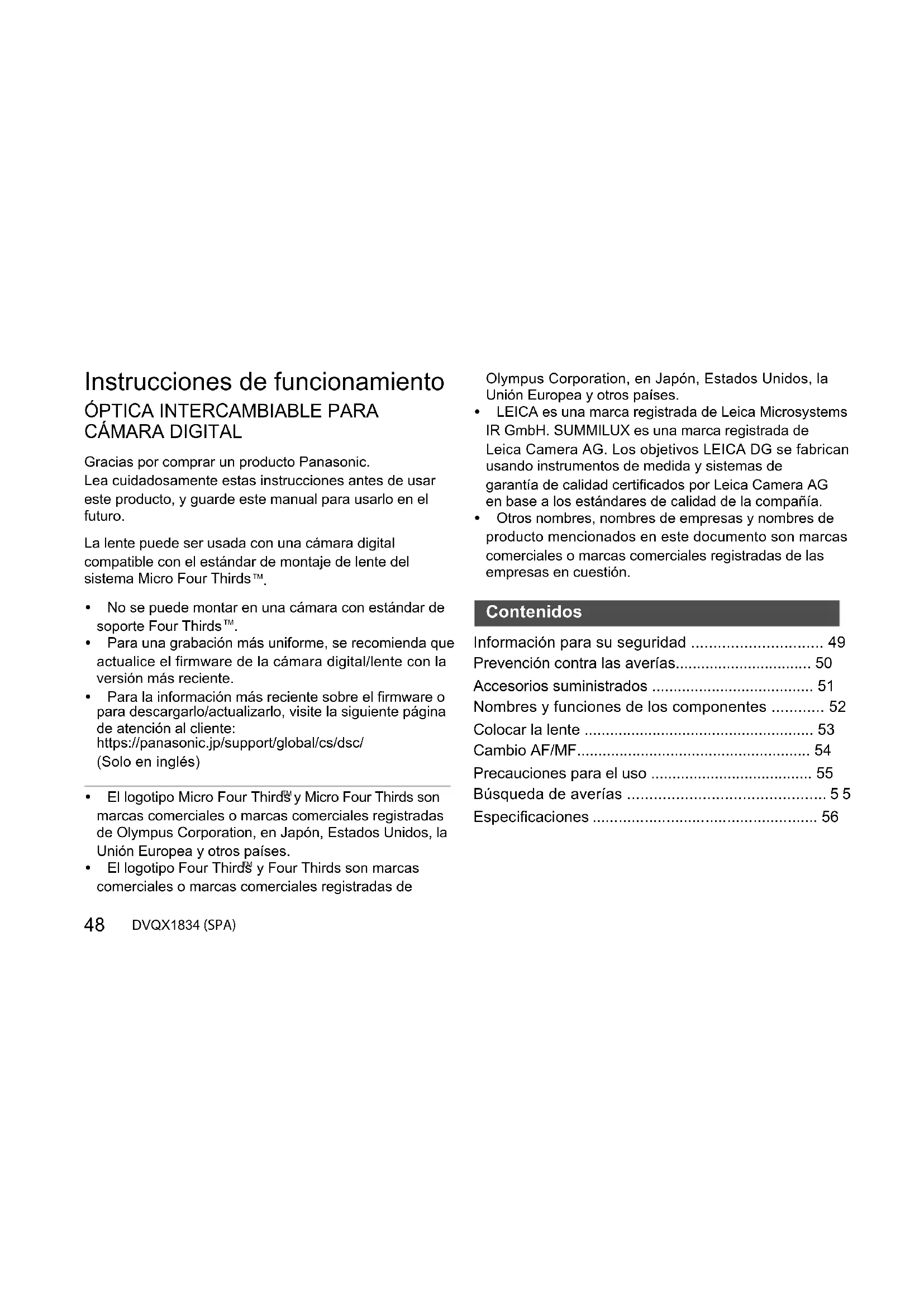 - y Four Thirds son marcas comerciales o marcas comerciales registradas de Olympus Corporation, en Japón, Estados Unidos, la Unión Europea y otros países. 0 LEICA es una marca registrada de Leica Microsystems IR GmbH. SUMMILUX es una marca registrada de Leica Camera AG. Los objetivos LEICA DG se fabrican usando instrumentos de medida y sistemas de garantía de calidad certificados por Leica Camera AG en base a los estándares de calidad de la compañía. 0 Otros nombres, nombres de empresas y nombres de producto mencionados en este documento son marcas comerciales o marcas comerciales registradas de las empresas en cuestión. Información para su seguridad p. 49