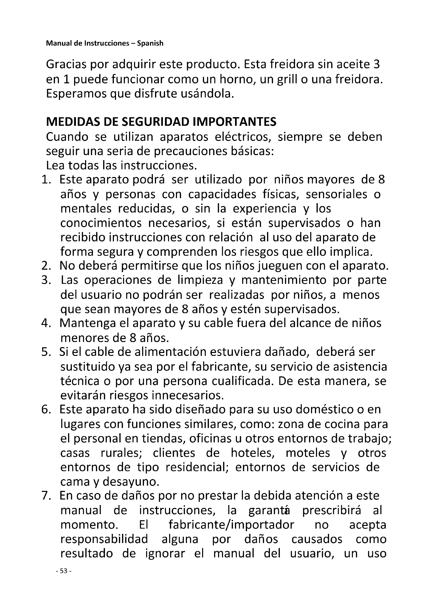 manual de instrucciones, la garantía prescribirá al momento. El fabricante/importador no acepta responsabilidad alguna por daños causados como resultado de ignorar el manual del usuario, un uso- 54 - negligente o un uso contrario a las instrucciones de este manual.