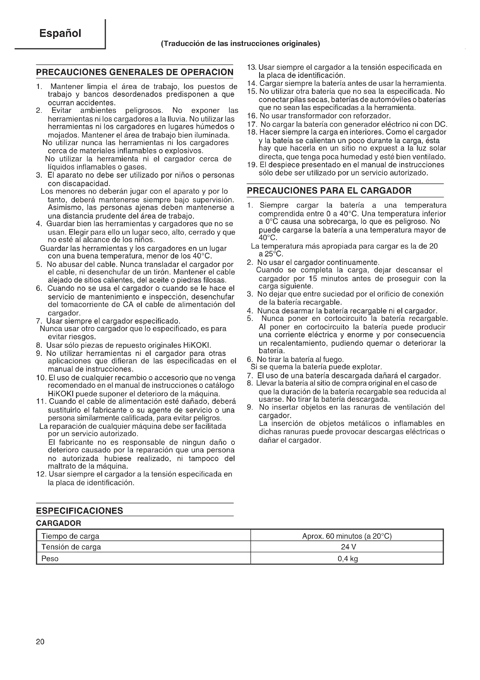 cargador. La inserción de objetos metálicos o inamables en dichas ranuras puede provocar descargas eléctricas o dañar el cargador. (Traducción de las instrucciones originales) ESPECIFICACIONES CARGADOR Tiempo de carga Aprox. 60 minutos (a 20°C) Tensión de carga 24 V Peso 0,4 kg 0000Book_UC24SGH_WE_NE.indb 20 2019/05/24 14:57:3121 Español