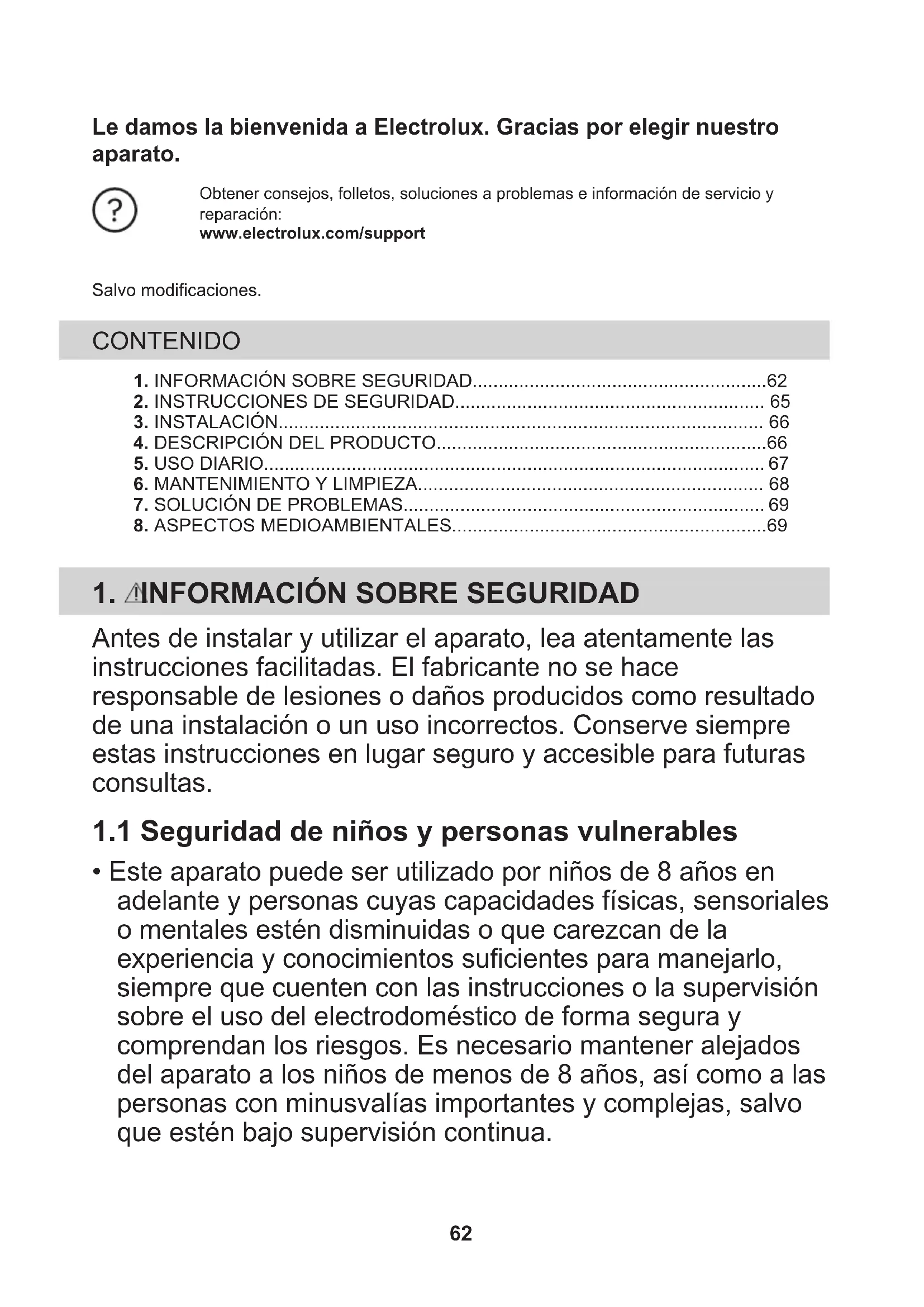 - Este aparato puede ser utilizado por niños de 8 años en adelante y personas cuyas capacidades físicas, sensoriales o mentales estén disminuidas o que carezcan de la experiencia y conocimientos suficientes para manejarlo, siempre que cuenten con las instrucciones o la supervisión sobre el uso del electrodoméstico de forma segura y comprendan los riesgos. Es necesario mantener alejados del aparato a los niños de menos de 8 años, así como a las personas con minusvalías importantes y complejas, salvo que estén bajo supervisión continua. 62• Es necesario vigilar a los niños para que no jueguen con el aparato.