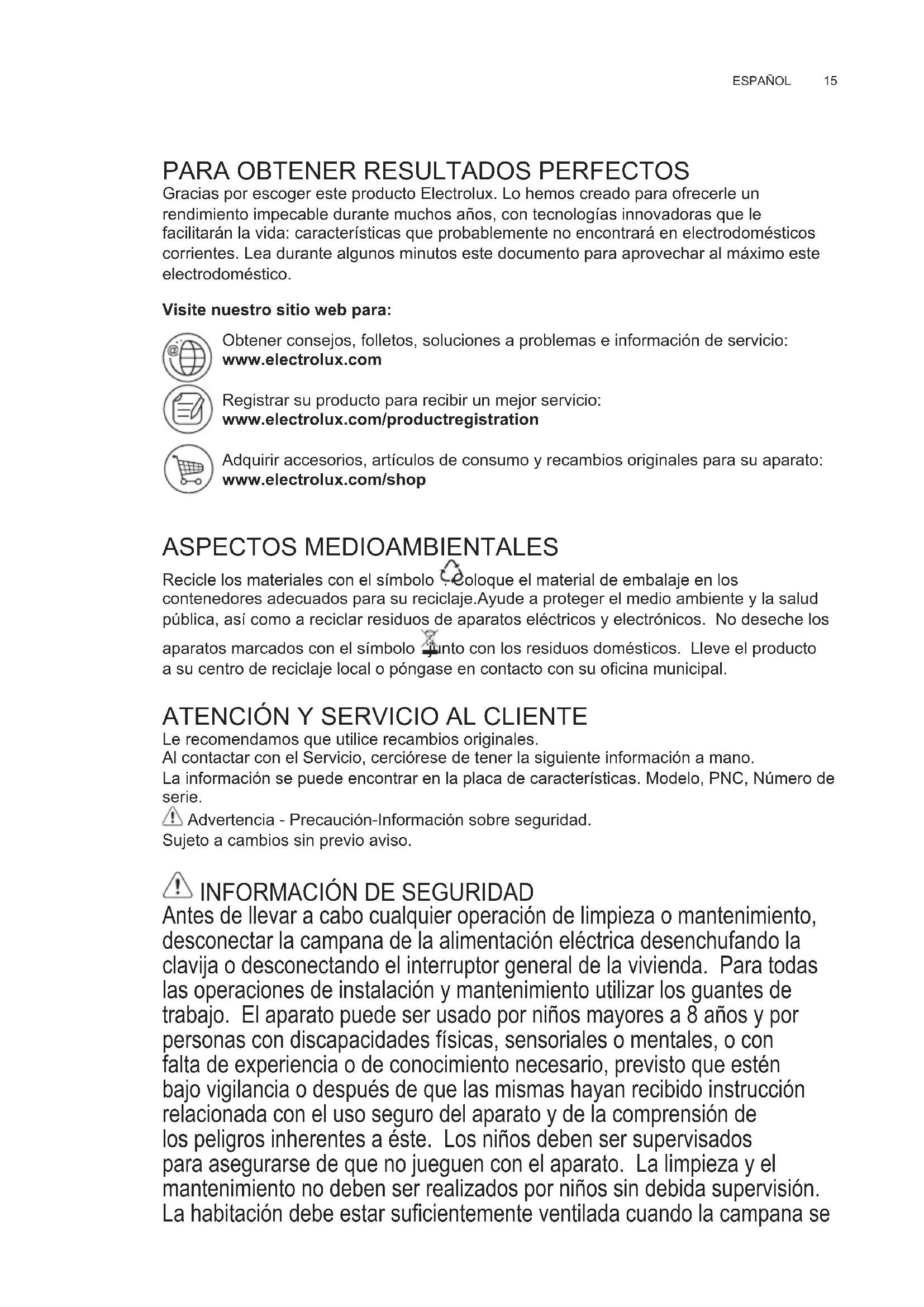 Gracias por escoger este producto Electrolux Lo hemos creado para ofrecerle un rendimiento impecable durante muchos años, con tecnologías innovadoras que le facilitarán la vida: características que probablemente no encontrará en electrodomésticos corrientes Lea durante algunos minutos este documento para aprovechar al máximo este electrodoméstico Visite nuestro sitio web para: Obtener consejos, folletos, soluciones a problemas e información de servicio: www.electrolux.com Registrar su producto para recibir un mejor servicio: www.electrolux.com/productregistration Adquirir accesorios, artículos de consumo y recambios originales para su aparato: www.electrolux.com/shop ASPECTOS MEDIOAMBIENTALES Recicle los materiales con el símbolo Coloque el material de embalaje en los contenedores adecuados para su reciclajeAyude a proteger el medio ambiente y la salud pública, así como a reciclar residuos de aparatos eléctricos y electrónicos No deseche los aparatos marcados con el símbolo junto con los residuos domésticos Lleve el producto a su centro de reciclaje local o póngase en contacto con su ocina municipal.