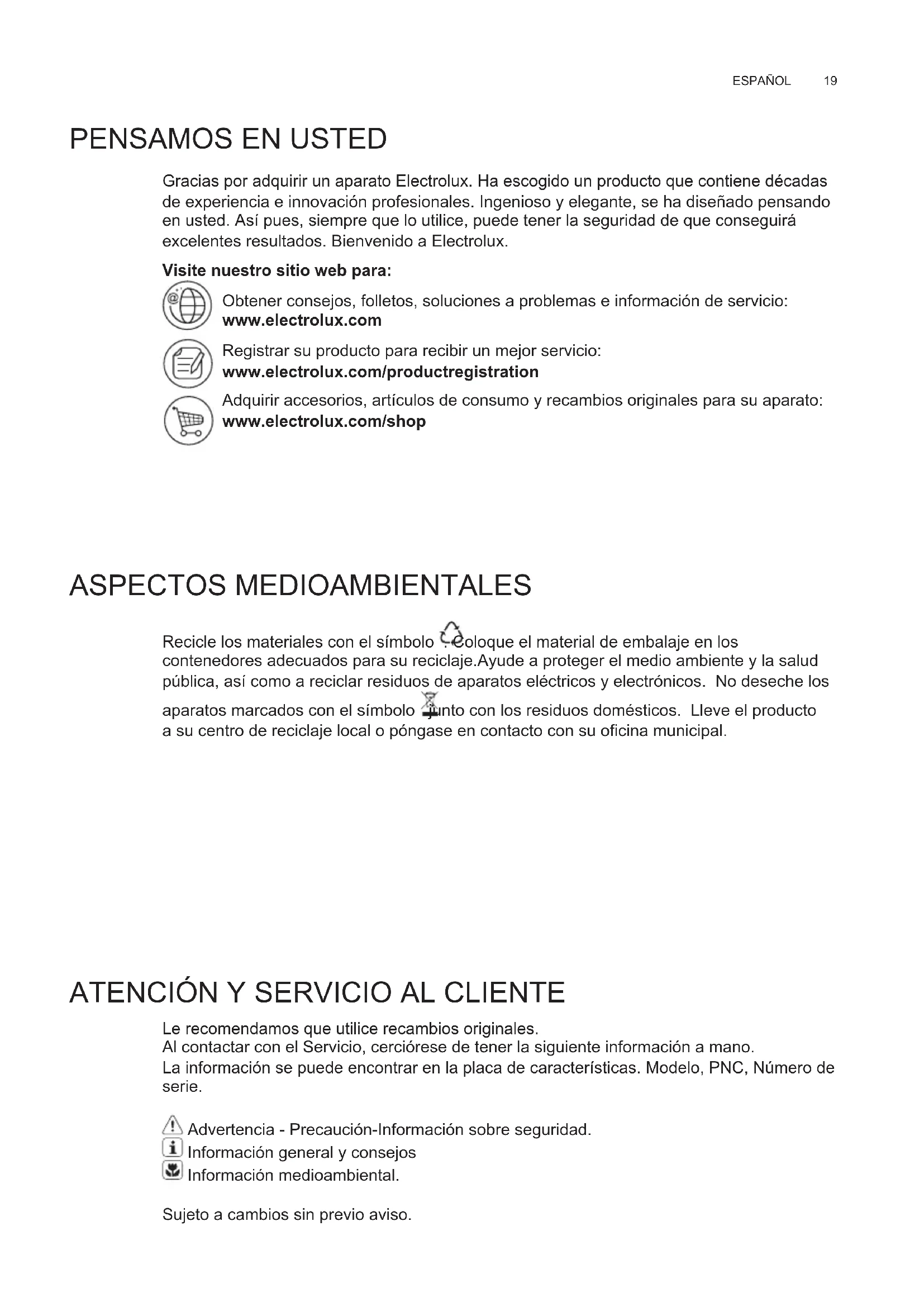 Le recomendamos que utilice recambios originales. Al contactar con el Servicio, cerciórese de tener la siguiente información a mano. La información se puede encontrar en la placa de características. Modelo, PNC, Número de serie. Advertencia - Precaución-Información sobre seguridad. Información general y consejos Información medioambiental. Sujeto a cambios sin previo aviso. ES MANUAL DE USOwww.electrolux.com