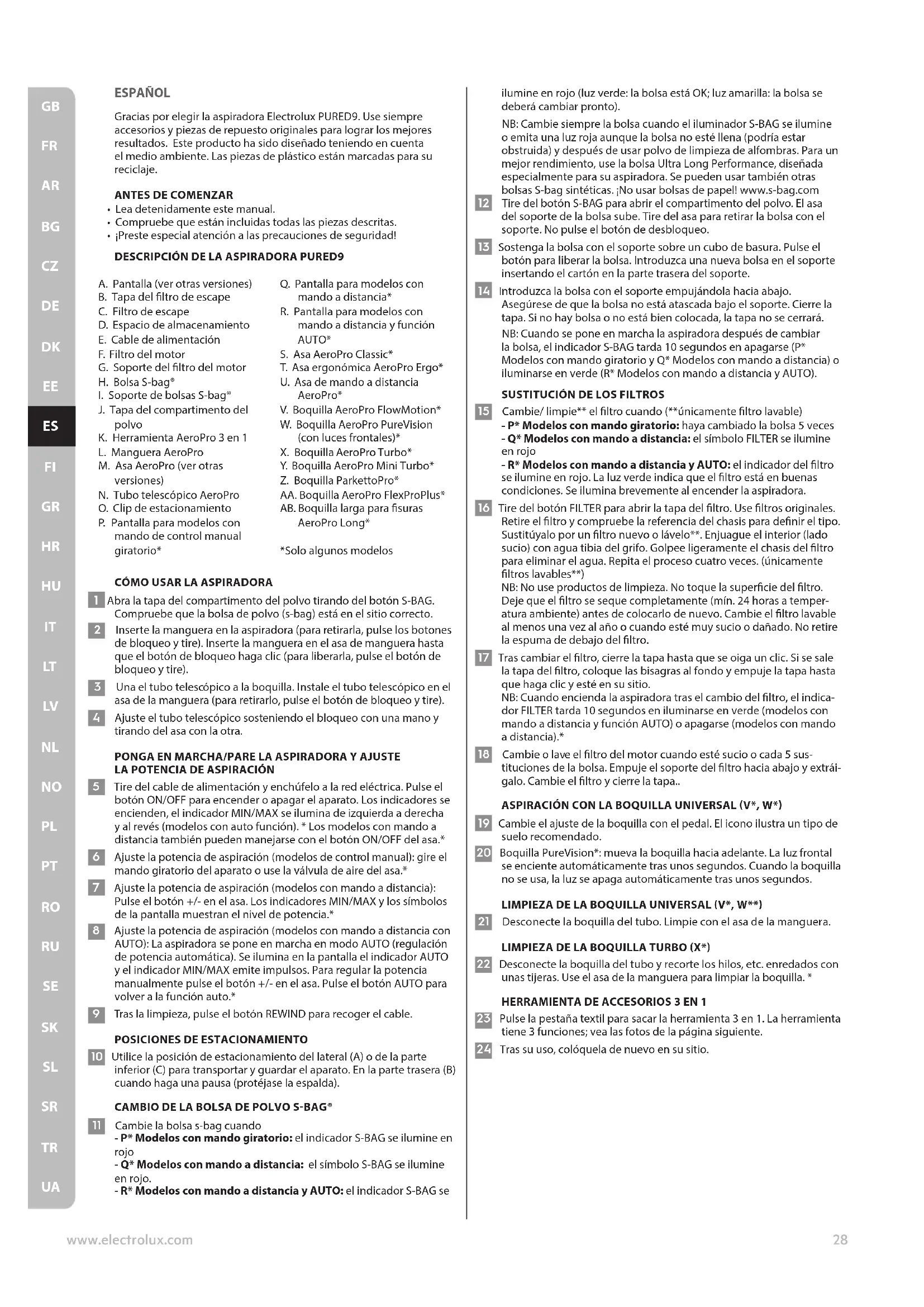 UAESPAÑOL Gracias por elegir la aspiradora Electrolux PURED9. Use siempre accesorios y piezas de repuesto originales para lograr los mejores resultados. Este producto ha sido diseñado teniendo en cuenta el medio ambiente. Las piezas de plástico están marcadas para su reciclaje.
