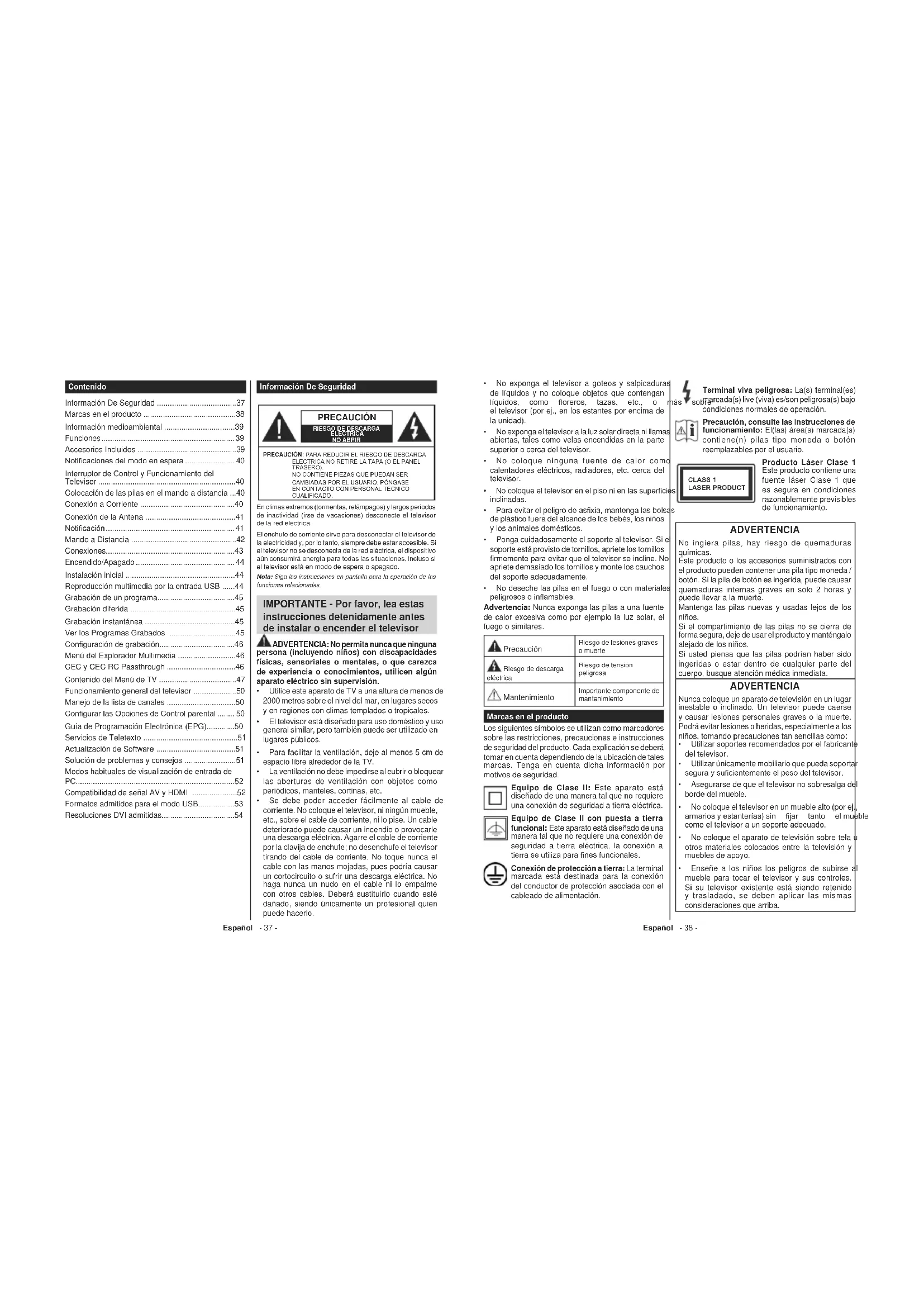 - Resoluciones DVI admitidas Información De Seguridad PRECAUCIÓN RIESGO DE DESCARGA ELÉCTRICANO ABRIRPRECAUCIÓN: 3$5$5('8&,5(/5,(6*2'('(6&$5*$(/e&75,&$125(7,5(/$7$3$2(/3$1(/75$6(52 12&217,(1(3,(=$648(38('$16(5&$0%,$'$6325(/868$5,23Ï1*$6((1&217$&72&213(5621$/7e&1,&2&8$/,),&$'2Nota: Siga las instrucciones en pantalla para la operación de las funciones relacionadas. En climas extremos (tormentas, relámpagos) y largos periodos de inactividad (irse de vacaciones) desconecte el televisor de la red eléctrica. El enchufe de corriente sirve para desconectar el televisor de la electricidad y, por lo tanto, siempre debe estar accesible. Si el televisor no se desconecta de la red eléctrica, el dispositivo aún consumirá energía para todas las situaciones, incluso si el televisor está en modo de espera o apagado. IMPORTANTE - Por favor, lea estas instrucciones detenidamente antes de instalar o encender el televisor ADVERTENCIA: No permita nunca que ninguna persona (incluyendo niños) con discapacidades físicas, sensoriales o mentales, o que carezca de experiencia o conocimientos, utilicen algún aparato eléctrico sin supervisión. Utilice este aparato de TV a una altura de menos de 2000 metros sobre el nivel del mar, en lugares secos y en regiones con climas templados o tropicales. El televisor está diseñado para uso doméstico y uso general similar, pero también puede ser utilizado en lugares públicos. Para facilitar la ventilación, deje al menos 5 cm de espacio libre alrededor de la TV. La ventilación no debe impedirse al cubrir o bloquear las aberturas de ventilación con objetos como periódicos, manteles, cortinas, etc. Se debe poder acceder fácilmente al cable de corriente. No coloque el televisor, ni ningún mueble, etc., sobre el cable de corriente, ni lo pise. Un cable deteriorado puede causar un incendio o provocarle una descarga eléctrica. Agarre el cable de corriente por la clavija de enchufe; no desenchufe el televisor tirando del cable de corriente. No toque nunca el cable con las manos mojadas, pues podría causar un cortocircuito o sufrir una descarga eléctrica. No haga nunca un nudo en el cable ni lo empalme con otros cables. Deberá sustituirlo cuando esté dañado, siendo únicamente un profesional quien puede hacerlo. Español - 38 - No exponga el televisor a goteos y salpicaduras de líquidos y no coloque objetos que contengan OtTXLGRV FRPR ÀRUHURV WD]DV HWF R PiV VREUH el televisor (por ej., en los estantes por encima de la unidad). No exponga el televisor a la luz solar directa ni llamas abiertas, tales como velas encendidas en la parte superior o cerca del televisor. No coloque ninguna fuente de calor como calentadores eléctricos, radiadores, etc. cerca del televisor. 1RFRORTXHHOWHOHYLVRUHQHOSLVRQLHQODVVXSHU¿FLHV inclinadas. 3DUDHYLWDUHOSHOLJURGHDV¿[LDPDQWHQJDODVEROVDV de plástico fuera del alcance de los bebés, los niños y los animales domésticos. Ponga cuidadosamente el soporte al televisor. Si el soporte está provisto de tornillos, apriete los tornillos ¿UPHPHQWHSDUDHYLWDUTXHHOWHOHYLVRUVHLQFOLQH1R apriete demasiado los tornillos y monte los cauchos del soporte adecuadamente. No deseche las pilas en el fuego o con materiales SHOLJURVRVRLQÀDPDEOHV Advertencia: Nunca exponga las pilas a una fuente de calor excesiva como por ejemplo la luz solar, el fuego o similares. Precaución Riesgo de lesiones graves o muerte Riesgo de descarga eléctrica Riesgo de tensión peligrosa Mantenimiento Importante componente de mantenimiento Marcas en el producto Los siguientes símbolos se utilizan como marcadores sobre las restricciones, precauciones e instrucciones de seguridad del producto. Cada explicación se deberá tomar en cuenta dependiendo de la ubicación de tales marcas. Tenga en cuenta dicha información por motivos de seguridad. Equipo de Clase II: Este aparato está diseñado de una manera tal que no requiere una conexión de seguridad a tierra eléctrica. Equipo de Clase II con puesta a tierra funcional: Este aparato está diseñado de una manera tal que no requiere una conexión de seguridad a tierra eléctrica, la conexión a p. 54