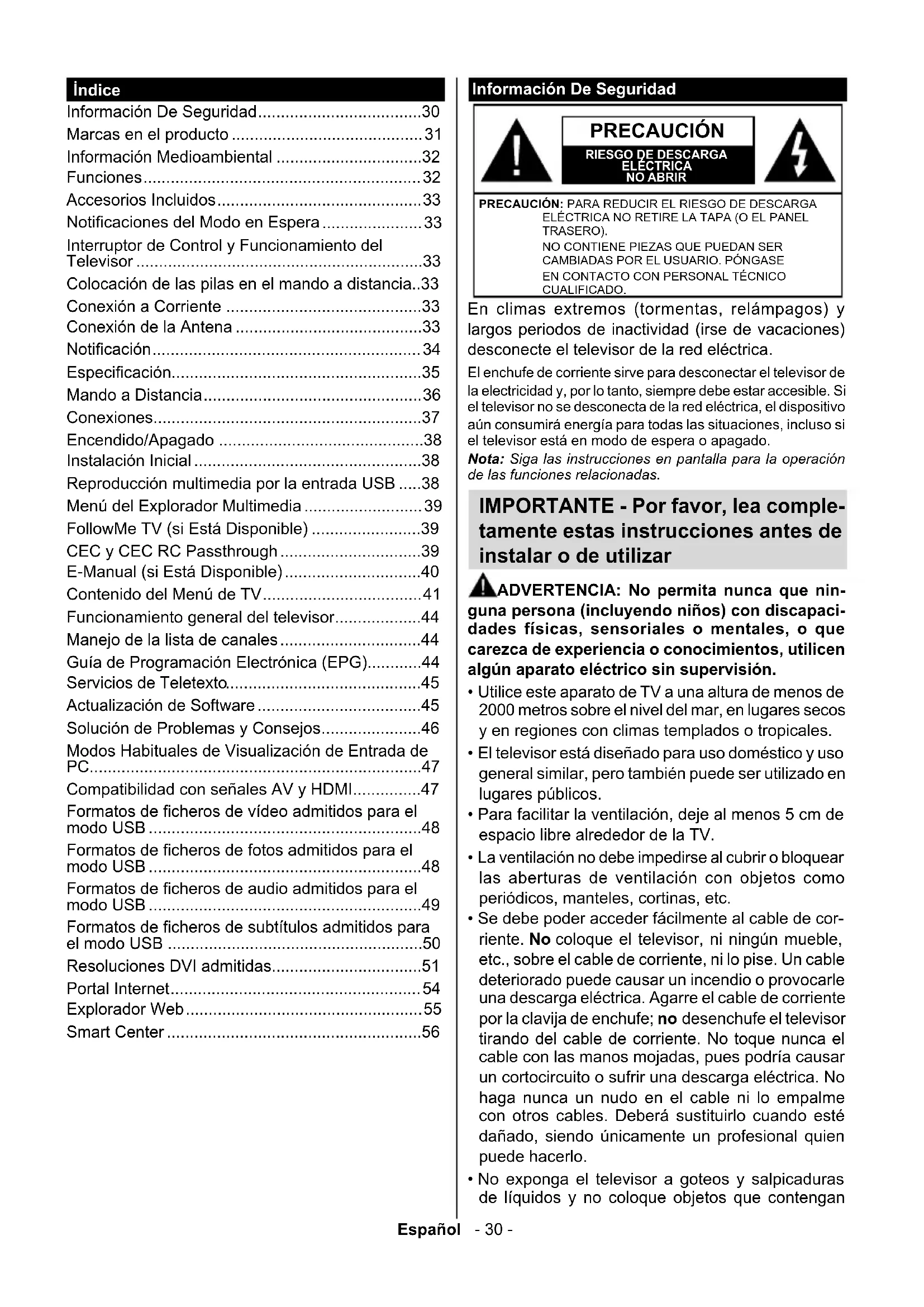 - Se debe poder acceder fácilmente al cable de corriente. No coloque el television, ni ningún mueble, etc., sobre el cable de corriente, ni lo pise. Un cable deteriorado puede causar un incendio o provocarle una descarga electrica. Agarre el cable de corriente por la clavija de enchufe; no desenchufe el television tirando del cable de corriente. No toque nunca el cable con las manos mojadas, puis podra causar un cortocircuito o sufir una descarga electrica. No haga nunca un nudo en el cable ni lo empalme conthers cables. Debera sustituirlo cuando estedanado, sido unicamente un profesional quien pueda hacerlo.
