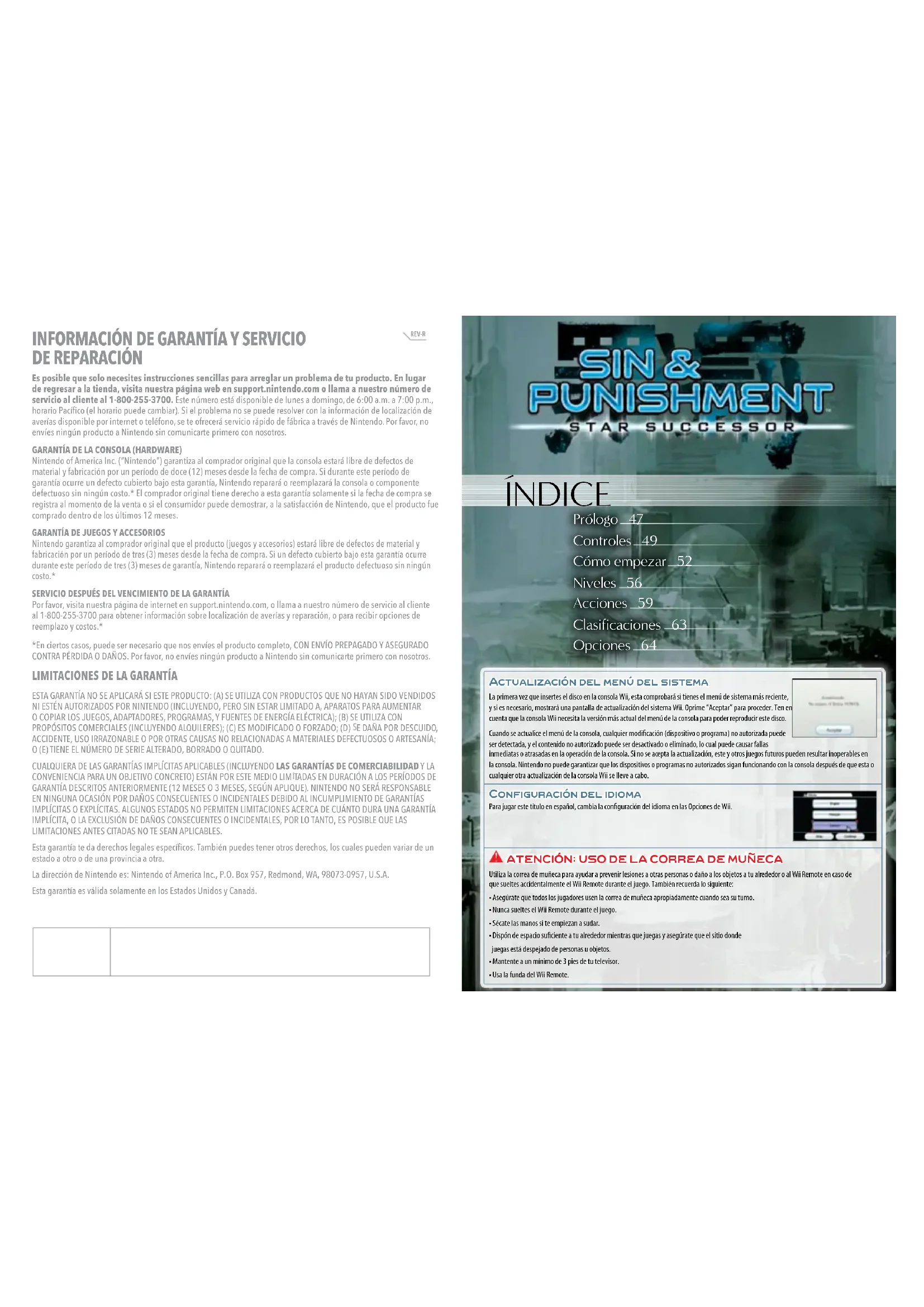 IMPLÍCITA,OLAEXCLUSIÓNDEDAÑOSCONSECUENTESOINCIDENTALES,PORLOTANTO,ESPOSIBLEQUELAS LIMITACIONESANTESCITADASNOTESEANAPLICABLES. Esta garantía te da derechos legales específicos. También puedes tener otros derechos, los cuales pueden variar de un estado a otro o de una provincia a otra. LadireccióndeNintendoes:NintendoofAmericaInc.,P.O.Box957,Redmond,WA,98073-0957,U.S.A. Esta garantía es válida solamente en los Estados Unidos y Canadá. ÍNDICE Prólogo 47 Controles 49 Cómo empezar 52 Niveles 56 Acciones 59 Clasicaciones 63 Opciones 64 Actualización del menú del sistema La primera vez que insertes el disco en la consola Wii, esta comprobará si tienes el menú de sistema más reciente, y si es necesario, mostrará una pantalla de actualización del sistema Wii. Oprime “Aceptar” para proceder. Ten en cuenta que la consola Wii necesita la versión más actual del menú de la consola para poder reproducir este disco.Cuando se actualice el menú de la consola, cualquier modicación (dispositivo o programa) no autorizada puede ser detectada, y el contenido no autorizado puede ser desactivado o eliminado, lo cual puede causar fallas inmediatas o atrasadas en la operación de la consola. Si no se acepta la actualización, este y otros juegos futuros pueden resultar inoperables en la consola. Nintendo no puede garantizar que los dispositivos o programas no autorizados sigan funcionando con la consola después de que esta o cualquier otra actualización de la consola Wii se lleve a cabo. Conguración del idioma Para jugar este título en español, cambia la conguración del idioma en las Opciones de Wii. ATENCIÓN: USO DE LA CORREA DE MUÑECA Utiliza la correa de muñeca para ayudar a prevenir lesiones a otras personas o daño a los objetos a tu alrededor o al Wii Remote en caso de que sueltes accidentalmente el Wii Remote durante el juego. También recuerda lo siguiente:• Asegúrate que todos los jugadores usen la correa de muñeca apropiadamente cuando sea su turno.• Nunca sueltes el Wii Remote durante el juego. • Sécate las manos si te empiezan a sudar.• Dispón de espacio suciente a tu alrededor mientras que juegas y asegúrate que el sitio donde juegas está despejado de personas u objetos.• Mantente a un mínimo de 3 pies de tu televisor.• Usa la funda del Wii Remote. 70043A_Wii_Sin Punishment_SS_manual.indd 45-46 5/12/10 12:51:47 PMSIN & PUNISHMENT PRÓLOGO