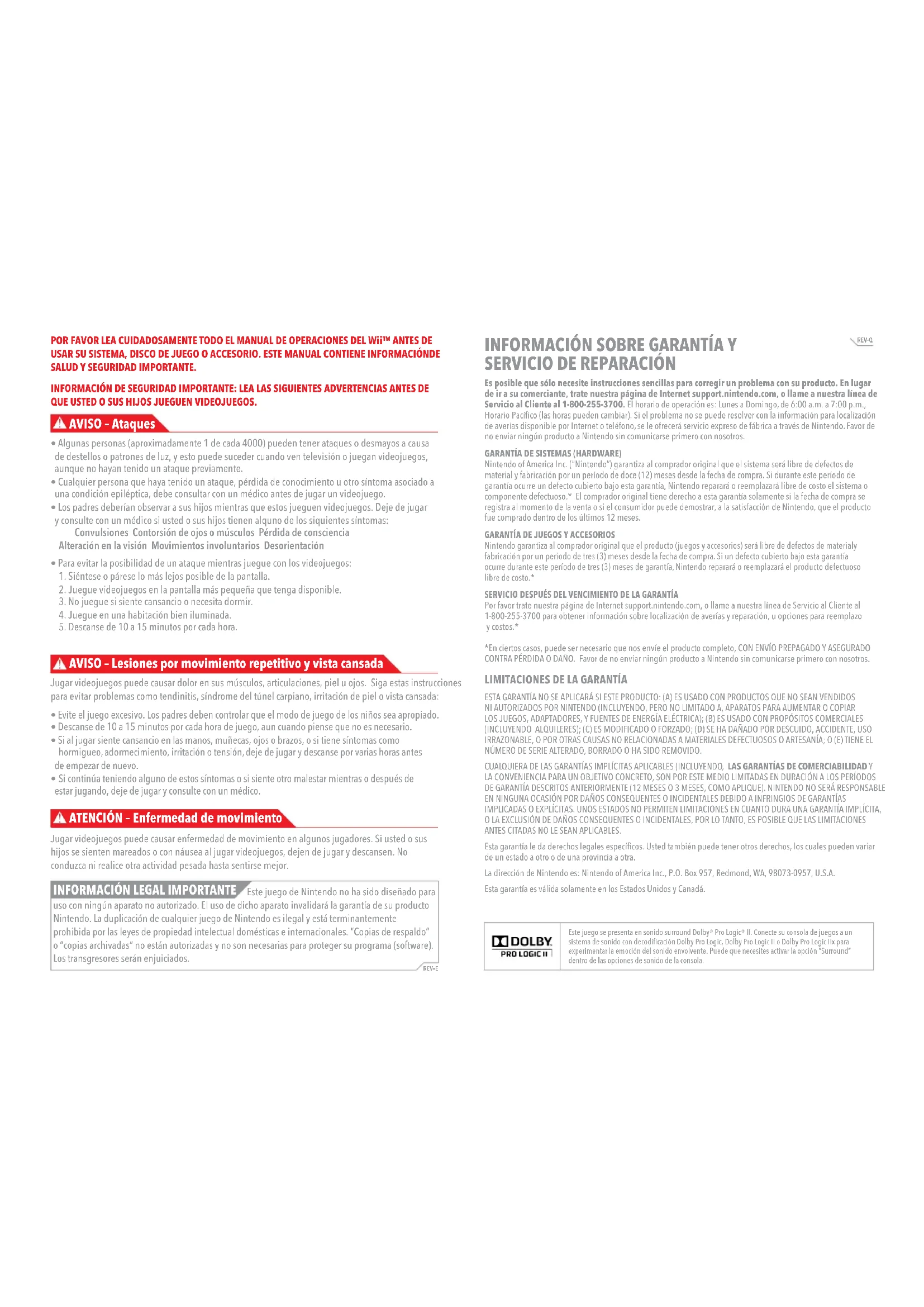 Es posible que sólo necesite instrucciones sencillas para corregir un problema con su producto. En lugar de ir a su comerciante, trate nuestra página de Internet support.nintendo.com, o llame a nuestra línea de Servicio al Cliente al 1-800-255-3700. El horario de operación es: Lunes a Domingo, de 6:00 a.m. a 7:00 p.m., Horario Pacífico (las horas pueden cambiar). Si el problema no se puede resolver con la información para localización de averías disponible por Internet o teléfono, se le ofrecerá servicio expreso de fábrica a través de Nintendo. Favor de no enviar ningún producto a Nintendo sin comunicarse primero con nosotros. GARANTÍA DE SISTEMAS (HARDWARE) Nintendo of America Inc. (“Nintendo”) garantiza al comprador original que el sistema será libre de defectos de material y fabricación por un período de doce (12) meses desde la fecha de compra. Si durante este período de garantía ocurre un defecto cubierto bajo esta garantía, Nintendo reparará o reemplazará libre de costo el sistema o componente defectuoso.* El comprador original tiene derecho a esta garantía solamente si la fecha de compra se registra al momento de la venta o si el consumidor puede demostrar, a la satisfacción de Nintendo, que el producto fue comprado dentro de los últimos 12 meses.
