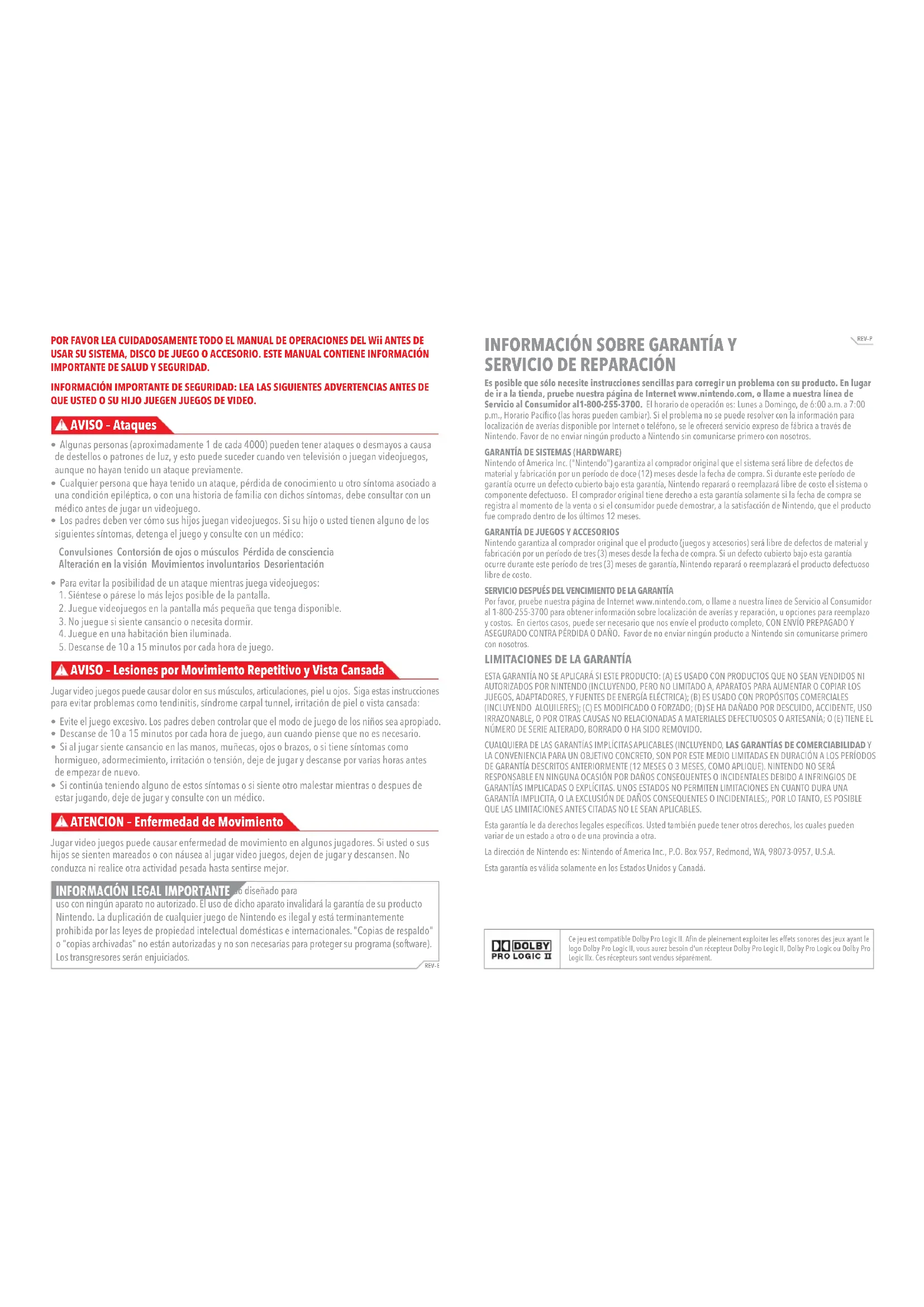 REV–P POR FAVOR LEA CUIDADOSAMENTE TODO EL MANUAL DE OPERACIONES DEL Wii ANTES DE USAR SU SISTEMA, DISCO DE JUEGO O ACCESORIO. ESTE MANUAL CONTIENE INFORMACIÓN IMPORTANTE DE SALUD Y SEGURIDAD. INFORMACIÓN IMPORTANTE DE SEGURIDAD: LEA LAS SIGUIENTES ADVERTENCIAS ANTES DE QUE USTED O SU HIJO JUEGEN JUEGOS DE VIDEO. AVISO – Ataques
