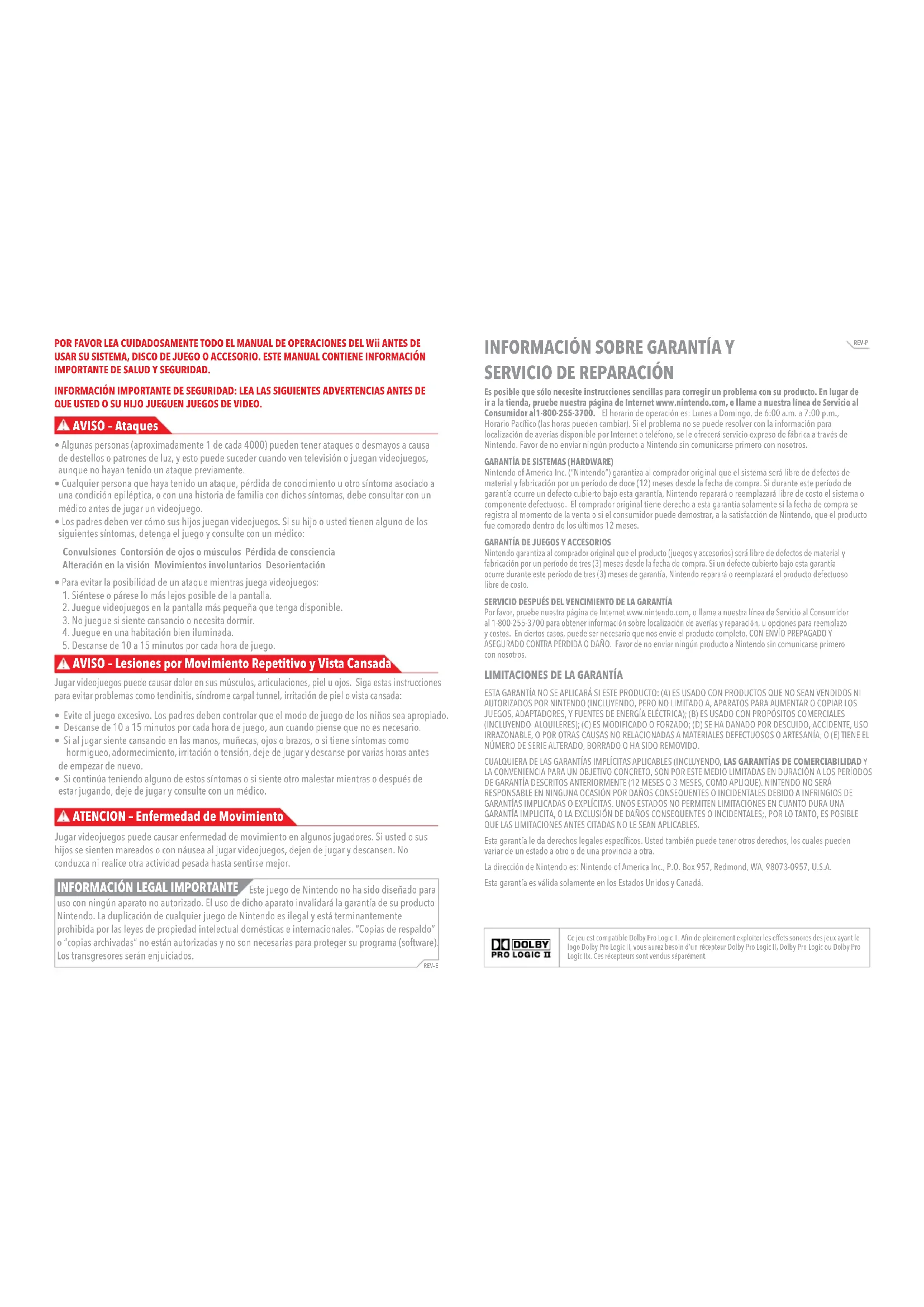 ESTA GARANTÍA NO SE APLICARÁ SI ESTE PRODUCTO: (A) ES USADO CON PRODUCTOS QUE NO SEAN VENDIDOS NI AUTORIZADOS POR NINTENDO (INCLUYENDO, PERO NO LIMITADO A, APARATOS PARA AUMENTAR O COPIAR LOS JUEGOS, ADAPTADORES, Y FUENTES DE ENERGÍA ELÉCTRICA); (B) ES USADO CON PROPÓSITOS COMERCIALES (INCLUYENDO ALQUILERES); (C) ES MODIFICADO O FORZADO; (D) SE HA DAÑADO POR DESCUIDO, ACCIDENTE, USO IRRAZONABLE, O POR OTRAS CAUSAS NO RELACIONADAS A MATERIALES DEFECTUOSOS O ARTESANÍA; O (E) TIENE EL NÚMERO DE SERIE ALTERADO, BORRADO O HA SIDO REMOVIDO. CUALQUIERA DE LAS GARANTÍAS IMPLÍCITAS APLICABLES (INCLUYENDO, LAS GARANTÍAS DE COMERCIABILIDAD Y LA CONVENIENCIA PARA UN OBJETIVO CONCRETO, SON POR ESTE MEDIO LIMITADAS EN DURACIÓN A LOS PERÍODOS DE GARANTÍA DESCRITOS ANTERIORMENTE (12 MESES O 3 MESES, COMO APLIQUE). NINTENDO NO SERÁ RESPONSABLE EN NINGUNA OCASIÓN POR DAÑOS CONSEQUENTES O INCIDENTALES DEBIDO A INFRINGIOS DE GARANTÍAS IMPLICADAS O EXPLÍCITAS. UNOS ESTADOS NO PERMITEN LIMITACIONES EN CUANTO DURA UNA GARANTÍA IMPLICITA, O LA EXCLUSIÓN DE DAÑOS CONSEQUENTES O INCIDENTALES;, POR LO TANTO, ES POSIBLE QUE LAS LIMITACIONES ANTES CITADAS NO LE SEAN APLICABLES. Esta garantía le da derechos legales específicos. Usted también puede tener otros derechos, los cuales pueden variar de un estado a otro o de una provincia a otra. La dirección de Nintendo es: Nintendo of America Inc., P.O. Box 957, Redmond, WA, 98073-0957, U.S.A. Esta garantía es válida solamente en los Estados Unidos y Canadá. Ce jeu est compatible Dolby Pro Logic II. Afin de pleinement exploiter les effets sonores des jeux ayant le logo Dolby Pro Logic II, vous aurez besoin d’un récepteur Dolby Pro Logic II, Dolby Pro Logic ou Dolby Pro Logic IIx. Ces récepteurs sont vendus séparément. POR FAVOR LEA CUIDADOSAMENTE TODO EL MANUAL DE OPERACIONES DEL Wii ANTES DE USAR SU SISTEMA, DISCO DE JUEGO O ACCESORIO. ESTE MANUAL CONTIENE INFORMACIÓN IMPORTANTE DE SALUD Y SEGURIDAD. INFORMACIÓN IMPORTANTE DE SEGURIDAD: LEA LAS SIGUIENTES ADVERTENCIAS ANTES DE QUE USTED O SU HIJO JUEGUEN JUEGOS DE VIDEO.