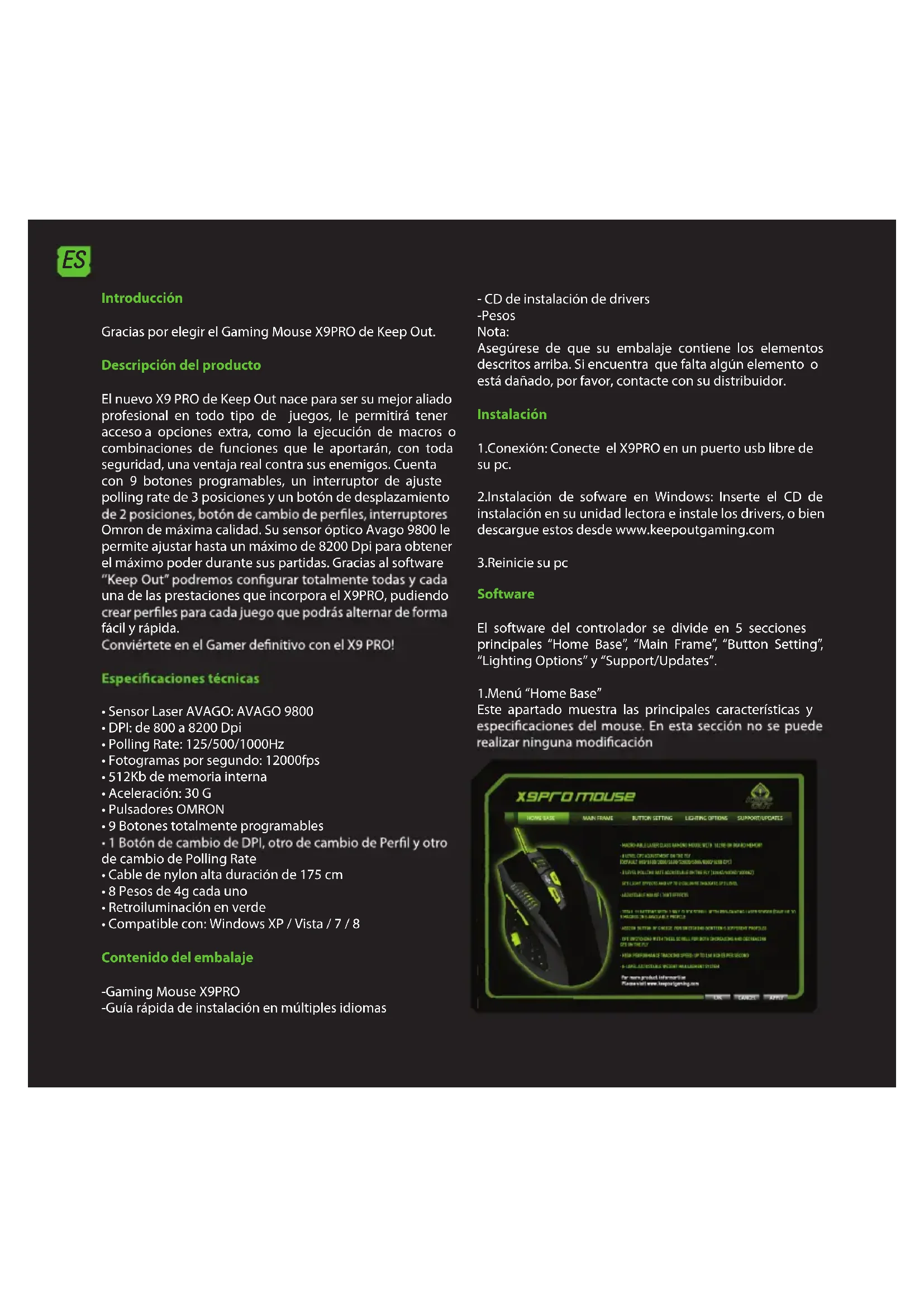 Here we cannot congure anything, you can visit our website where you can download the latest drivers or consult if you have any queries. Technical Support For more information on installing and conguring this product go to our website www.keepoutgaming.com or write an email to the following address: support@keep- out.euES Introducción Gracias por elegir el Gaming Mouse X9PRO de Keep Out. Descripción del producto El nuevo X9 PRO de Keep Out nace para ser su mejor aliado profesional en todo tipo de juegos, le permitirá tener acceso a opciones extra, como la ejecución de macros o combinaciones de funciones que le aportarán, con toda seguridad, una ventaja real contra sus enemigos. Cuenta con 9 botones programables, un interruptor de ajuste polling rate de 3 posiciones y un botón de desplazamiento Omron de máxima calidad. Su sensor óptico Avago 9800 le permite ajustar hasta un máximo de 8200 Dpi para obtener el máximo poder durante sus partidas. Gracias al software una de las prestaciones que incorpora el X9PRO, pudiendo fácil y rápida.