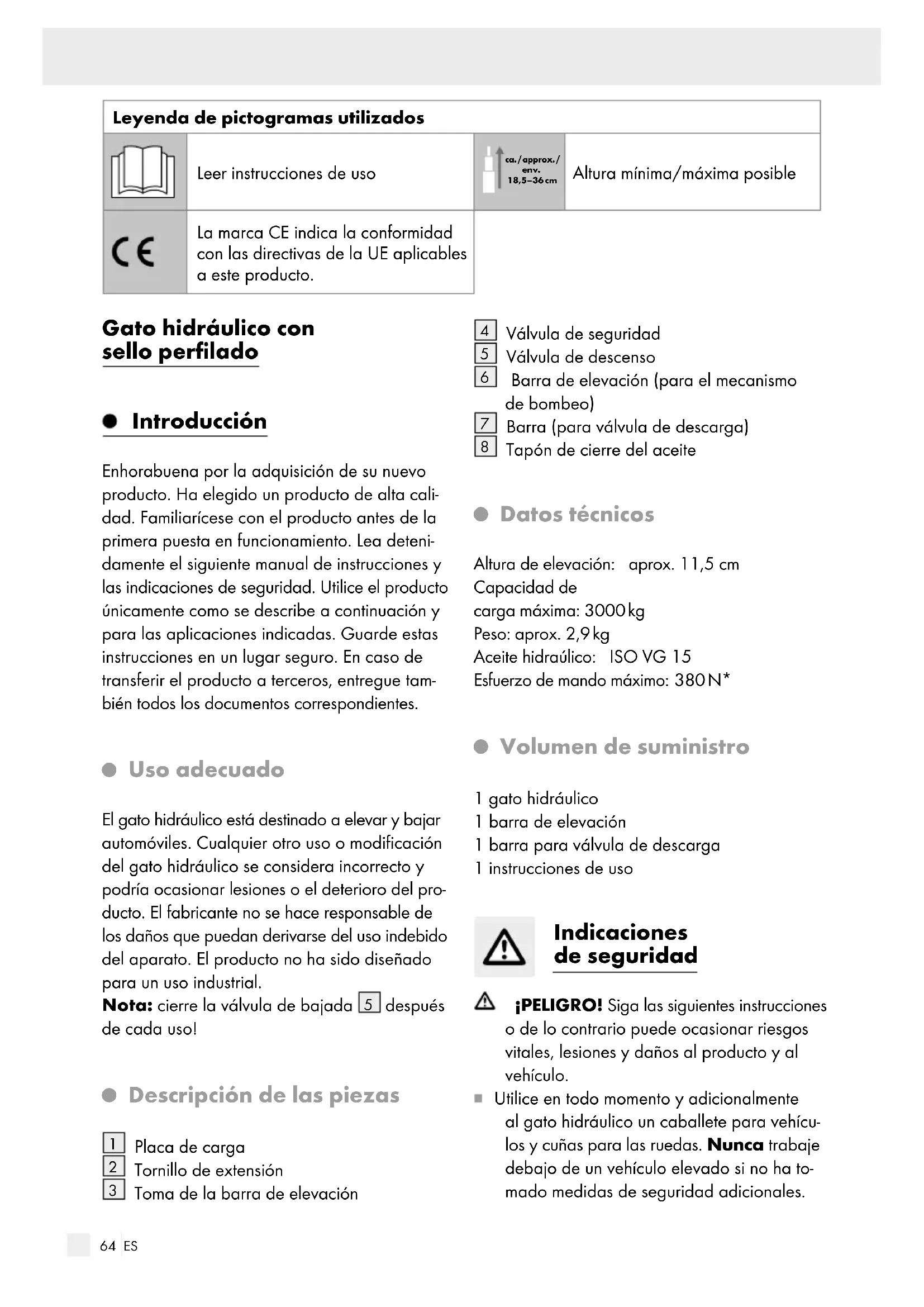 Uso adecuado El gato hidráulico está destinado a elevar y bajar automóviles. Cualquier otro uso o modificación del gato hidráulico se considera incorrecto y podría ocasionar lesiones o el deterioro del pro- ducto. El fabricante no se hace responsable de los daños que puedan derivarse del uso indebido del aparato. El producto no ha sido diseñado para un uso industrial. Nota: cierre la válvula de bajada