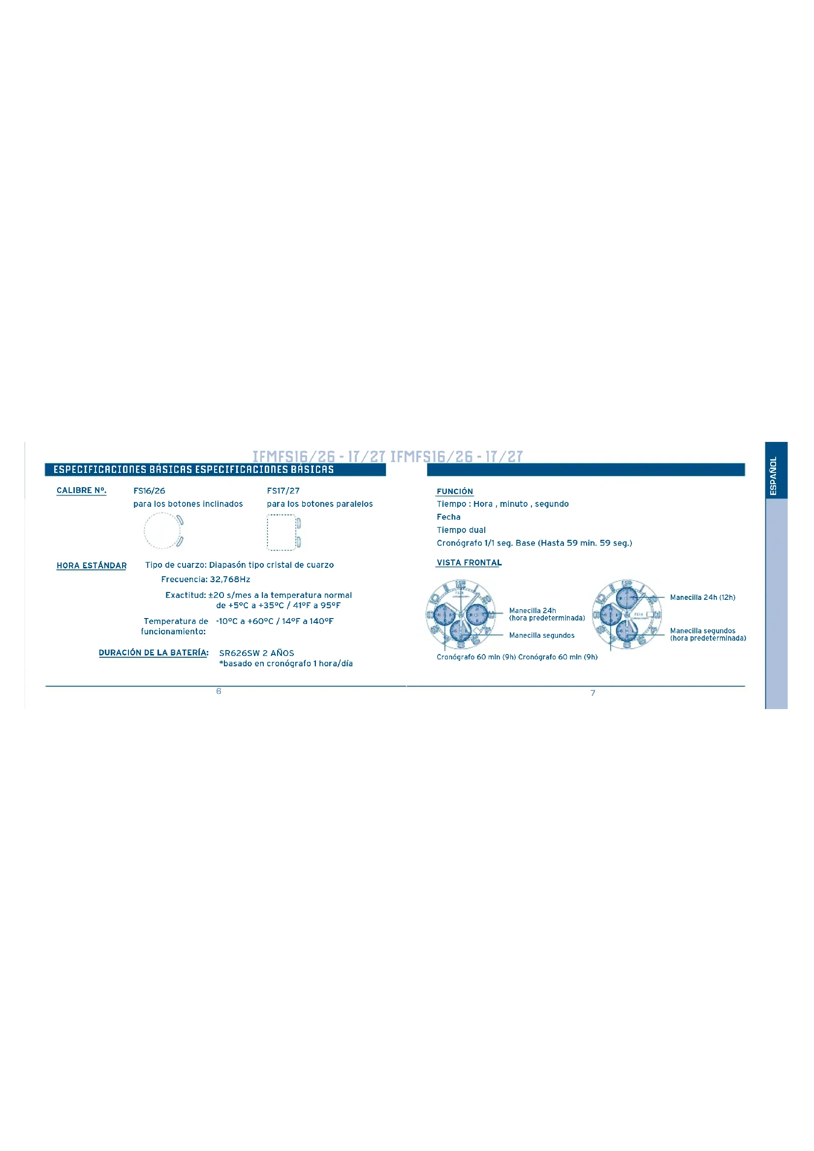 ENGLISH En aplicación de la normativa sobre los desechos de equipos eléctricos y electrónicos, los productos de relojería de cuarzo que se encuentran al final de su vida útil deben ser sometidos a una recogida selectiva en vistas a su posterior tratamiento. También puede depositar nuestros productos de relojería de cuarzo en uno de nuestros puntos de venta autorizados, así como en cualquier punto de recogida habilitado. La recogida selectiva, el tratamiento, la valoración y el reciclaje contribuyen a la salvaguarda de nuestro medio ambiente y a la protección de nuestra salud. IFMFS16/26 - 17/27 INSTRUCTION MANUAL DUAL TIME Basic specifications