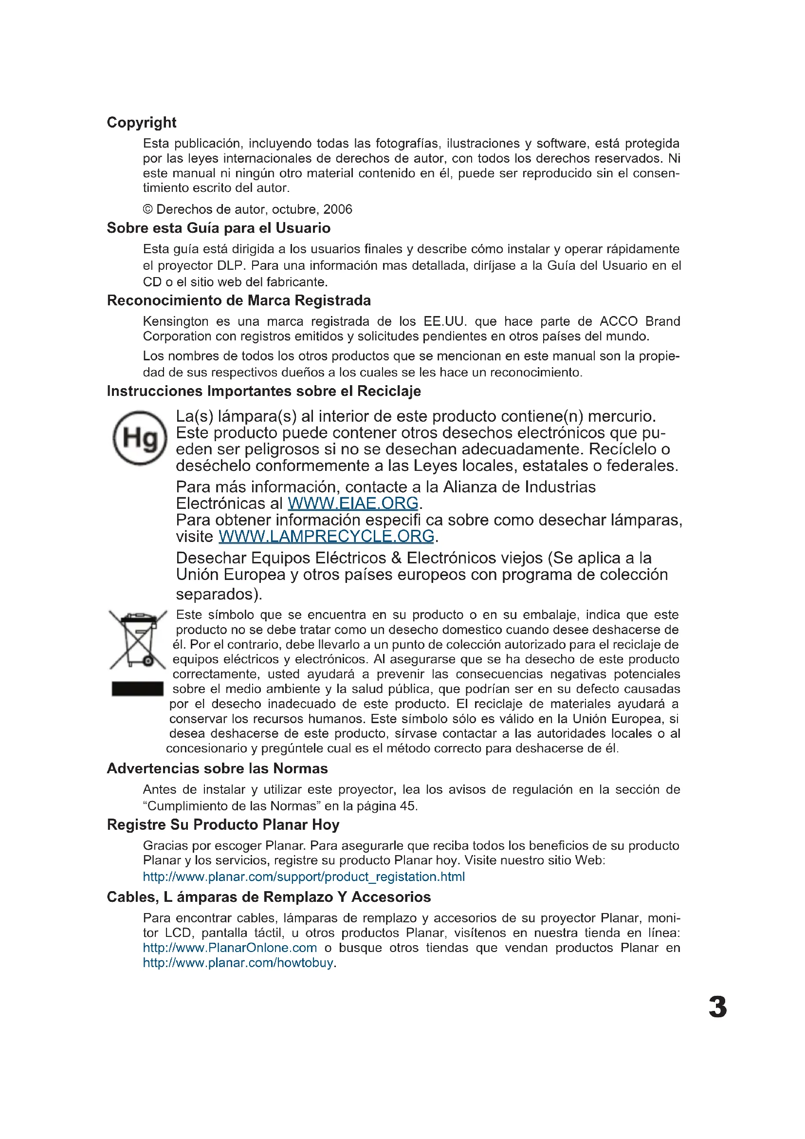Planar Systems, Inc. Корпоративный Штаб 1195 NW Compton Drive, USA Beaverton, OR 97006-1992 Planar Поддержка Клиента Телефон: США: 1-866-PLANAR1 (866) 752-6271 Внутри США: +1 (503) 748-5799 E-mail: PlanarSupport@planar.com Онлайн Техническая Библиотека: http://www.planar.com/support Часы: M-F, 8am - 8pm ET, 12pm - 12am GMT3 Copyright Esta publicación, incluyendo todas las fotografías, ilustraciones y software, está protegida por las leyes internacionales de derechos de autor, con todos los derechos reservados. Ni este manual ni ningún otro material contenido en él, puede ser reproducido sin el consen- timiento escrito del autor. © Derechos de autor, octubre, 2006 Sobre esta Guía para el Usuario Esta guía está dirigida a los usuarios fi nales y describe cómo instalar y operar rápidamente el proyector DLP. Para una información mas detallada, diríjase a la Guía del Usuario en el CD o el sitio web del fabricante. Reconocimiento de Marca Registrada Kensington es una marca registrada de los EE.UU. que hace parte de ACCO Brand Corporation con registros emitidos y solicitudes pendientes en otros países del mundo. Los nombres de todos los otros productos que se mencionan en este manual son la propie- dad de sus respectivos dueños a los cuales se les hace un reconocimiento. Instrucciones Importantes sobre el Reciclaje La(s) lámpara(s) al interior de este producto contiene(n) mercurio. Este producto puede contener otros desechos electrónicos que pu- eden ser peligrosos si no se desechan adecuadamente. Recíclelo o deséchelo conformemente a las Leyes locales, estatales o federales. Para más información, contacte a la Alianza de Industrias Electrónicas al WWW.EIAE.ORG. Para obtener información especifi ca sobre como desechar lámparas, visite WWW.LAMPRECYCLE.ORG. Desechar Equipos Eléctricos & Electrónicos viejos (Se aplica a la Unión Europea y otros países europeos con programa de colección separados). Este símbolo que se encuentra en su producto o en su embalaje, indica que este producto no se debe tratar como un desecho domestico cuando desee deshacerse de él. Por el contrario, debe llevarlo a un punto de colección autorizado para el reciclaje de equipos eléctricos y electrónicos. Al asegurarse que se ha desecho de este producto correctamente, usted ayudará a prevenir las consecuencias negativas potenciales sobre el medio ambiente y la salud pública, que podrían ser en su defecto causadas por el desecho inadecuado de este producto. El reciclaje de materiales ayudará a conservar los recursos humanos. Este símbolo sólo es válido en la Unión Europea, si desea deshacerse de este producto, sírvase contactar a las autoridades locales o al concesionario y pregúntele cual es el método correcto para deshacerse de él. Advertencias sobre las Normas Antes de instalar y utilizar este proyector, lea los avisos de regulación en la sección de “Cumplimiento de las Normas” en la página 45. Registre Su Producto Planar Hoy Gracias por escoger Planar. Para asegurarle que reciba todos los benefi cios de su producto Planar y los servicios, registre su producto Planar hoy. Visite nuestro sitio Web: http://www.planar.com/support/product_registation.html Cables, L ámparas de Remplazo Y Accesorios Para encontrar cables, lámparas de remplazo y accesorios de su proyector Planar, moni- tor LCD, pantalla táctil, u otros productos Planar, visítenos en nuestra tienda en línea: http://www.PlanarOnlone.com o busque otros tiendas que vendan productos Planar en http://www.planar.com/howtobuy.4