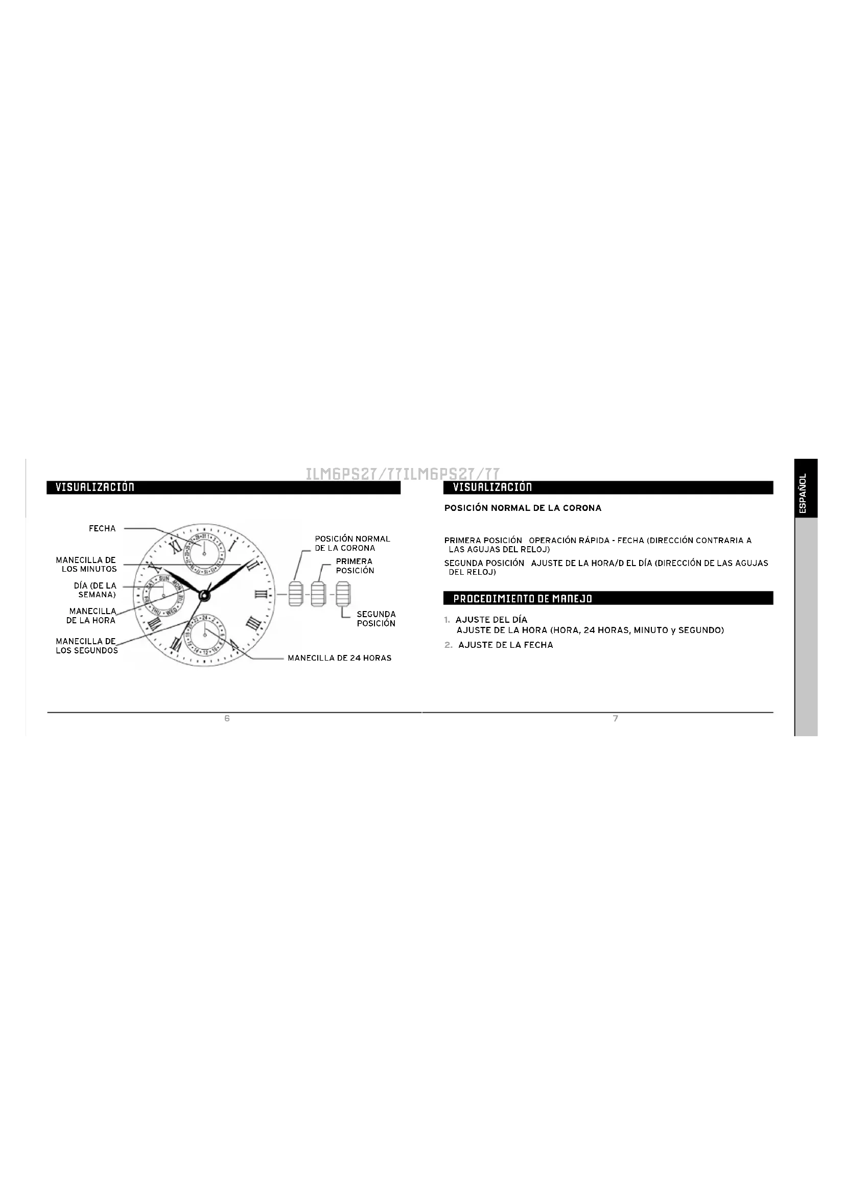 Gire la manecilla de la hora y de los Minutes en la direccion de las agujas del reloj para ajustar el día de lapellana.