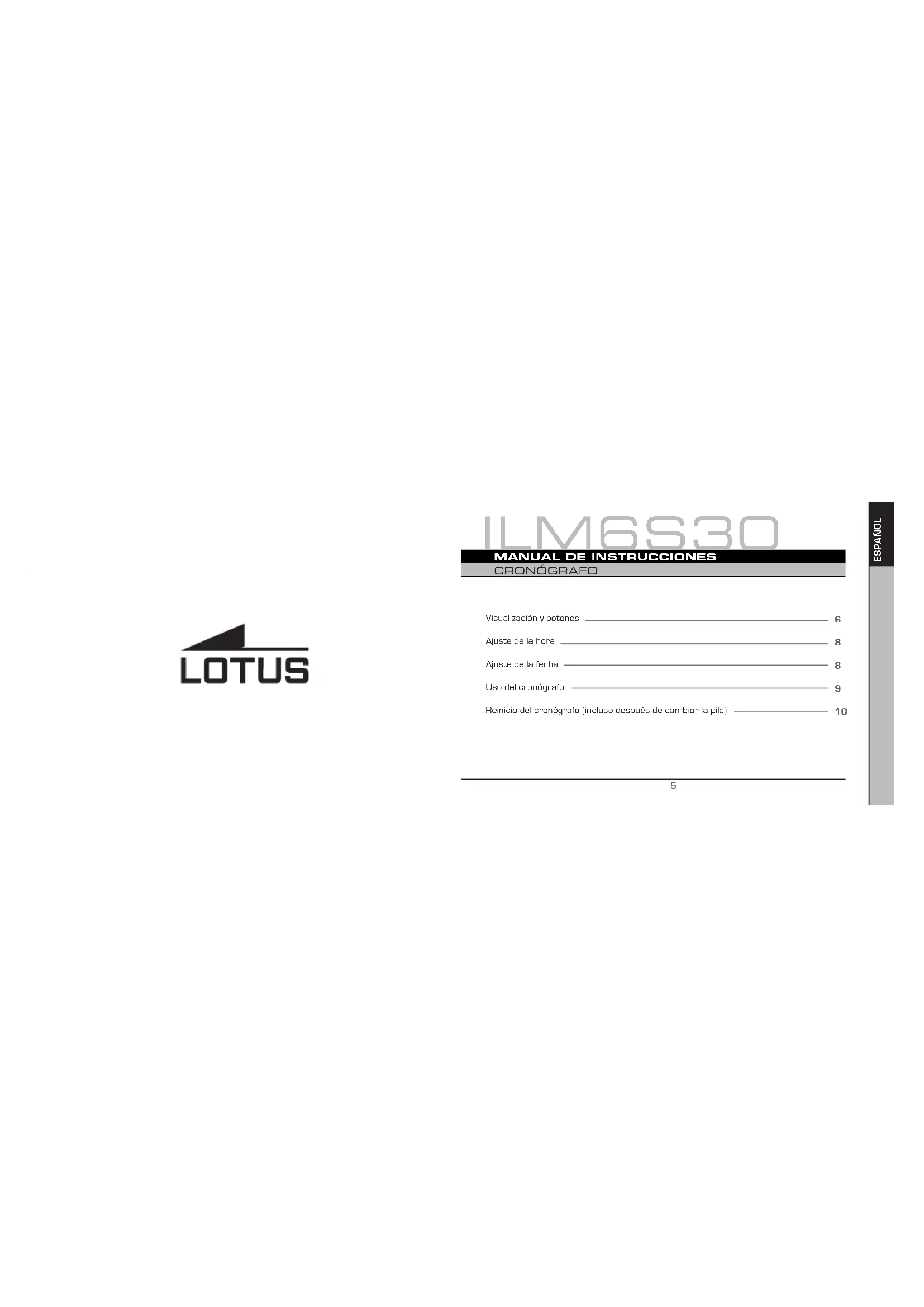 CRONÓGRAFO Español ILM6S30 Visualización y botones Ajuste de la hora Ajuste de la fecha Uso del cronógrafo Reinicio del cronógrafo (incluso después de cambior la pila)