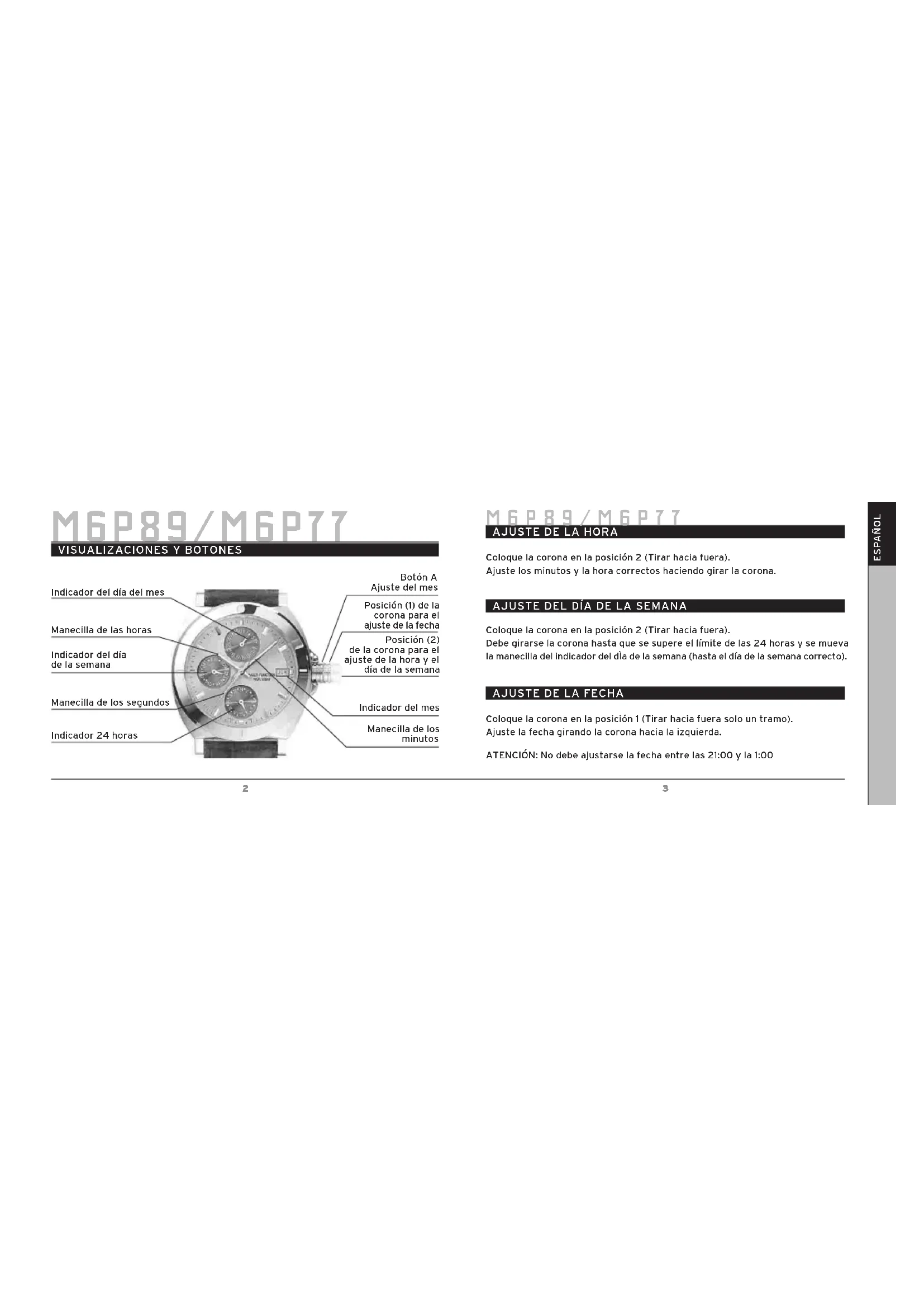 M6P89/M6P77 Indicador del día del mes Manecilla de las horas Indicador del día de la semana Botón A Ajuste del mes Indicador del mes Manecilla de los minutos M6P89/M6P77 Manecilla de los segundos Indicador 24 horas Posición (1) de la corona para el ajuste de la fecha Posición (2) de la corona para el ajuste de la hora y el día de la semana AJUSTE DEL DÍA DE LA SEMANA Coloque la corona en la posición 2 (Tirar hacia fuera). Debe girarse la corona hasta que se supere el límite de las 24 horas y se mueva la manecilla del indicador del dÌa de la semana (hasta el día de la semana correcto).