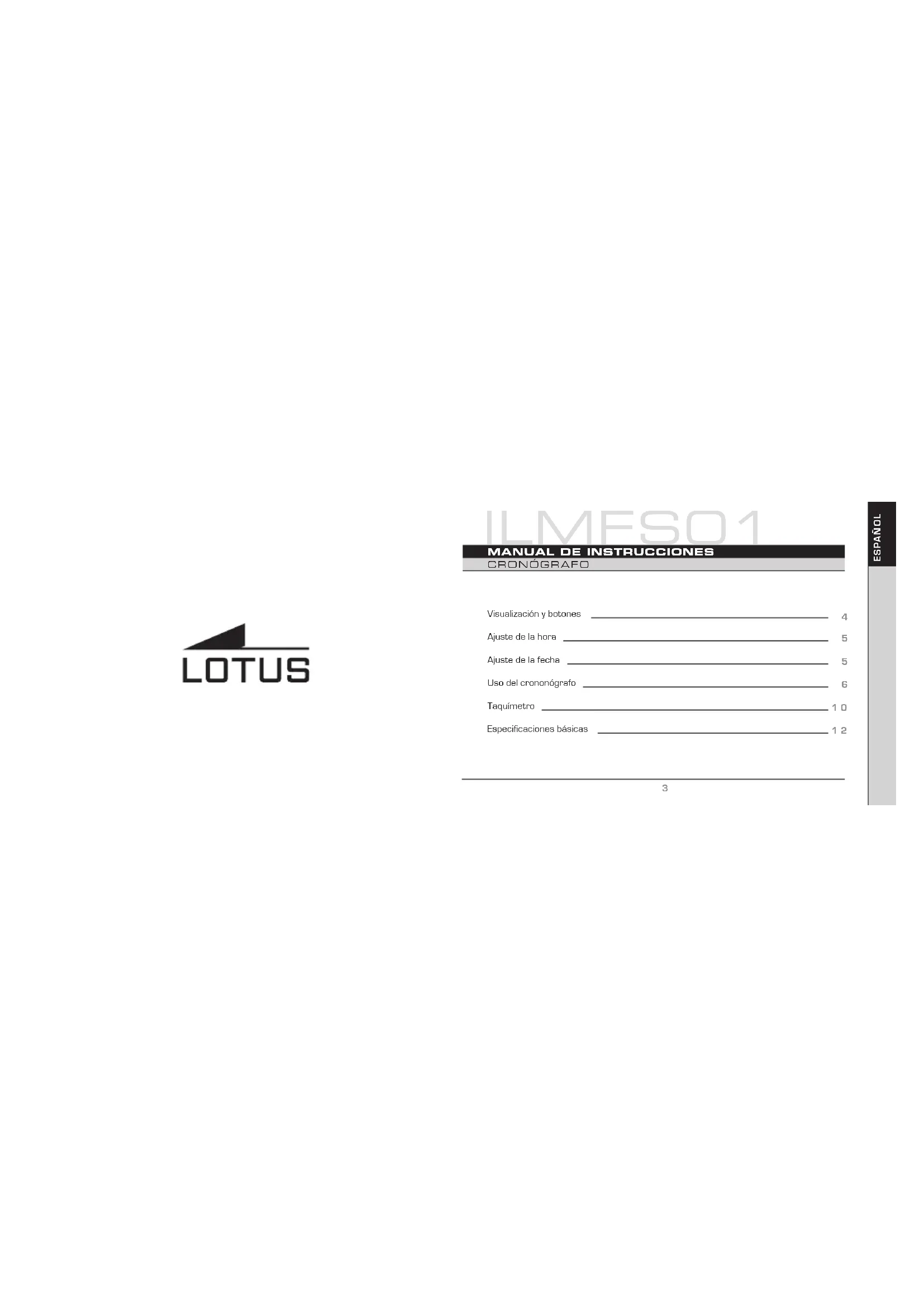 ILMFS01 En aplicación de la normativa sobre los desechos de equipos eléctricos y electrónicos, los productos de relojería de cuarzo que se encuentran al final de su vida útil deben ser sometidos a una recogida selectiva en vistas a su posterior tratamiento. También puede depositar nuestros productos de relojería de cuarzo en uno de nuestros puntos de venta autorizados, así como en cualquier punto de recogida habilitado. La recogida selectiva, el tratamiento, la valoración y el reciclaje contribuyen a la salvaguarda de nuestro medio ambiente y a la protección de nuestra salud. INSTRUCTION MANUAL Displays and buttons Setting the time Setting the date Using the chronograph Tachymeter Basic specifications