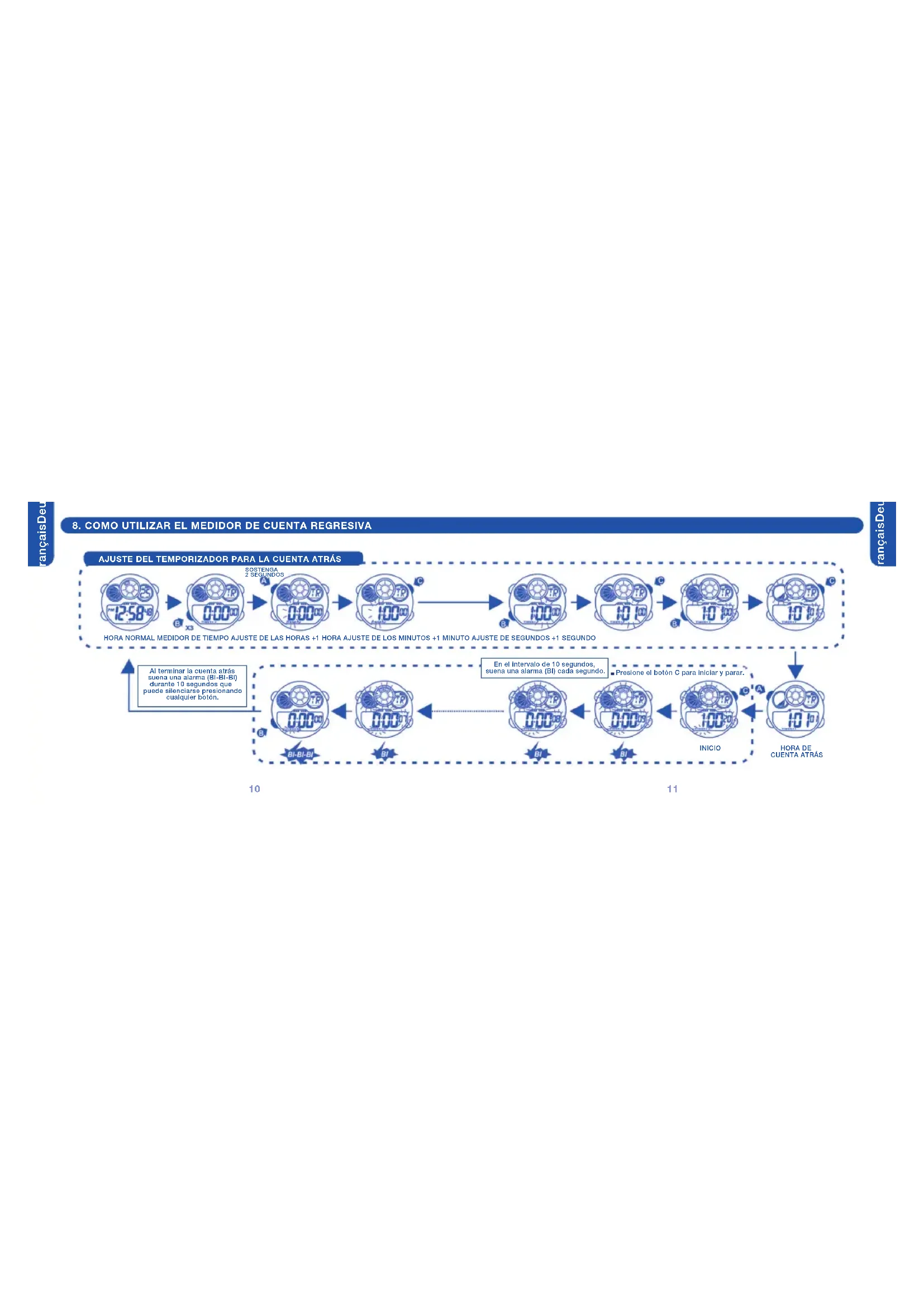 INICIO Presione el botón C para iniciar y parar. Al terminar la cuenta atrás suena una alarma (BI-BI-BI) durante 10 segundos que puede silenciarse presionando cualquier botón. AJUSTE DEL TEMPORIZADOR PARA LA CUENTA ATRÁS En el intervalo de 10 segundos, suena una alarma (BI) cada segundo. SOSTENGA 2 SEGUNDOS9. AJUSTE DE LA SEGUNDA ZONA HORARIA EnglishFrançaisDeutschItaliano Español