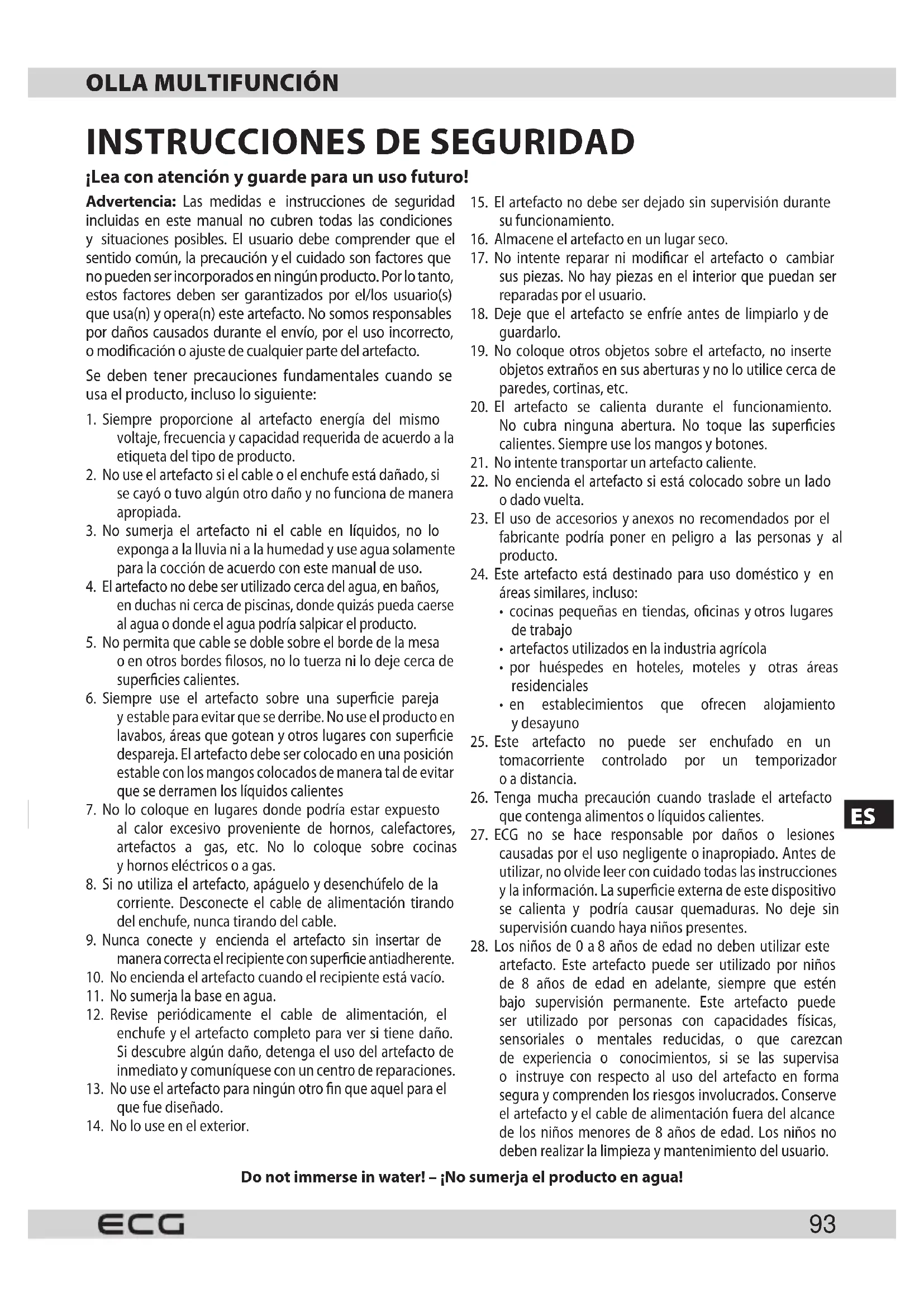 artefacto. Este artefacto puede ser utilizado por niños de 8 años de edad en adelante, siempre que estén bajo supervisión permanente. Este artefacto puede ser utilizado por personas con capacidades físicas, sensoriales o mentales reducidas, o que carezcan de experiencia o conocimientos, si se las supervisa o instruye con respecto al uso del artefacto en forma segura ycomprenden los riesgos involucrados. Conserve el artefacto yel cable de alimentación fuera del alcance de los niños menores de 8 años de edad. Los niños no deben realizar la limpieza ymantenimiento del usuario. Do not immerse in water! – ¡No sumerja el producto en agua!ES