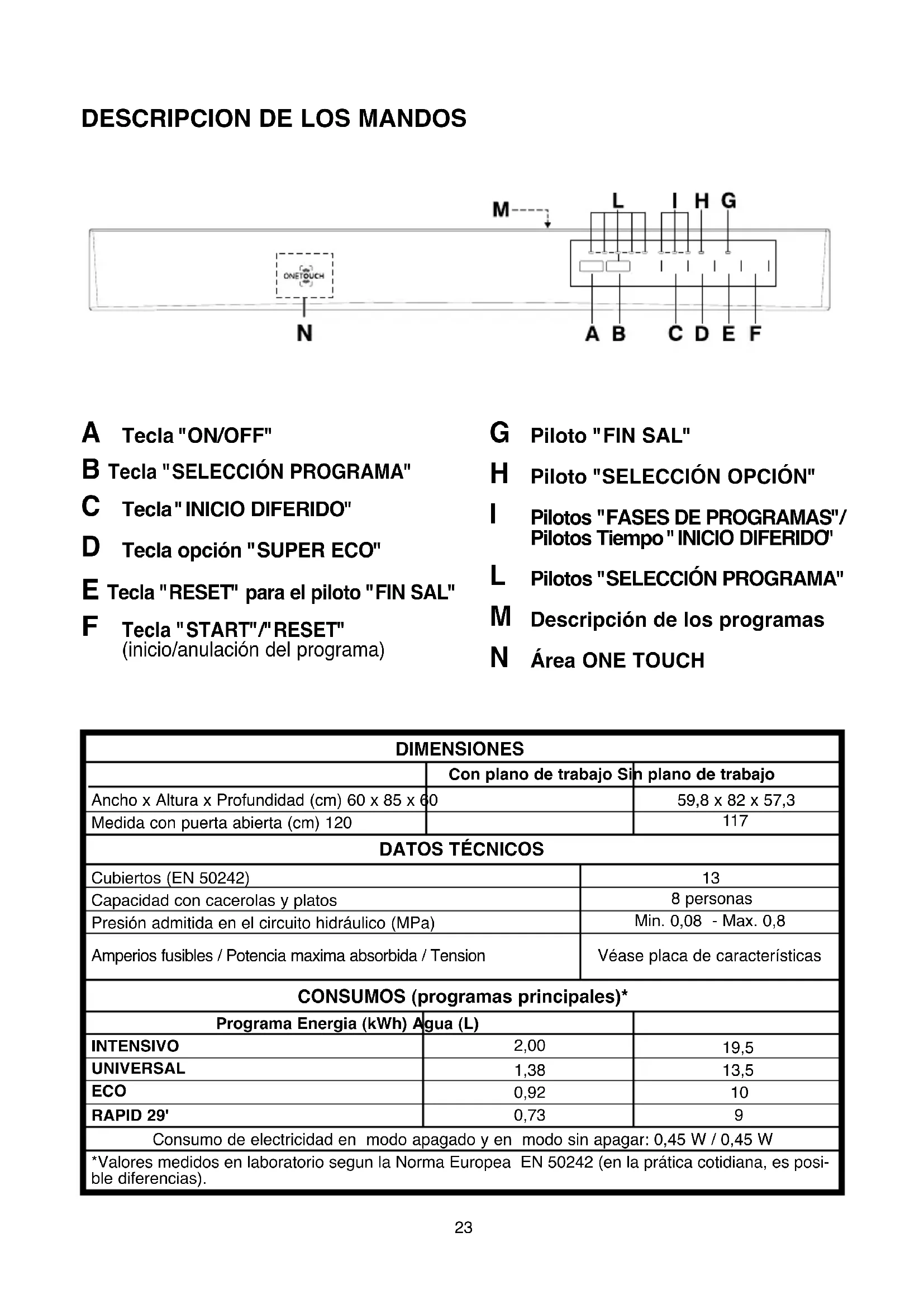 CONSUMOS (programas principales)* Programa Energia (kWh) Agua (L) INTENSIVO UNIVERSAL ECO RAPID 29' Ancho x Altura x Profundidad (cm) 60 x 85 x 60 Medida con puerta abierta (cm) 120 Cubiertos (EN 50242) Capacidad con cacerolas y platos Presión admitida en el circuito hidráulico (MPa) Amperios fusibles / Potencia maxima absorbida / Tension 8 personas Min. 0,08 - Max. 0,8 Véase placa de características Consumo de electricidad en modo apagado y en modo sin apagar: 0,45 W / 0,45 W *Valores medidos en laboratorio segun la Norma Europea EN 50242 (en la prática cotidiana, es posi- ble diferencias). 59,8 x 82 x 57,3
