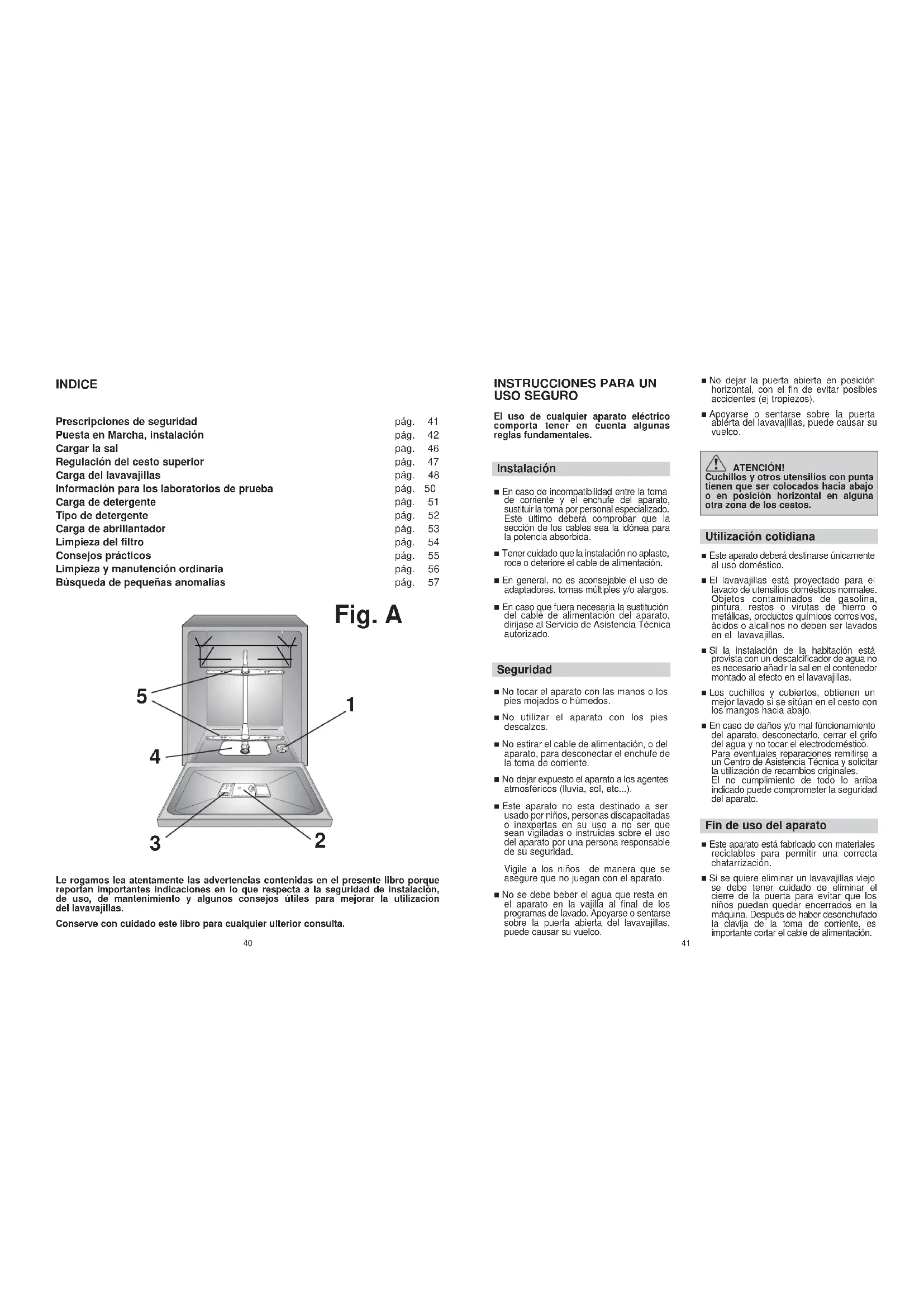 MANTENIMIENTO ■ Para limpiar el exterior del lavavajillas no se deben usar, ni disolventes (desengrasantes) ni abrasivos. Unicamente un paño de agua tíbia. ■ El lavavajillas no requiere ningún mantenimento especial, ya que la cuba de lavado es autolimpiante. ■ Periódicamente limpiar la guarnición de goma de la puerta, con un paño húmedo eliminando cuidadosamente cualquier resíduo de alimentos o abrillantador. ■ Para garantizar una mejor eliminación de pequeños depósitos calcáceros o de suciedad, se aconseja realizar periódicamente un lavado completo vertiendo previamente un vaso de vinagre en el interior del lavavajillas y hacer el programa delicado. ■ Si a pesar de la normal limpieza de placa y filtro, se notasen vajillas o cacerolas insuficientemente lavadas o aclaradas, se debe controlar que todos los rociadores de los brazos (fig. A “5”) estén libres de restos de suciedad. Si este no fuese el motivo, proceder a su limpieza de la siguiente forma: 1.Para extraer el brazo superior, es necesario girarlo hasta llevarlo a la posición de “tope” señalada por la flecha (fig. 1b). Empujarlo hacia arriba (fig. 1) y manteniéndolo apretado girar en sentido horario (para montarlo, repita la operación, pero girando en sentido contrario a las agujas del reloj). El aspersor inferior, se extrae simplemente estirando hacia arriba (fig. 2). 2.Lavar el aspersor bajo un chorro de agua eliminando de suciedad los inyectores obstruidos. 3.Al término de la operación, monte de nuevo los aspersores en la idéntica posición. ■ Tanto la cuba como el interior de la puerta son de acero inoxidable. Si se produjeran manchas de óxido, ello se debería únicamente a una fuerte presencia de sales de hierro en el agua. ■ Para quitar estas manchas se aconseja el uso de un abrasivo de grano fino. No utilizar nunca substancias con cloro, cepillos de acero, etc.59 INDICEConseils de sécuritéMise en marche, installationChargement du selRéglage du panier supérieurChargement de la vaisselleInformation pour les tests laboratoireChargement du produit de lavageTypes de produits de lavageChargement du produit de rinçageNettoyage des filtresQuelques conseils pratiquesEntretien et nettoyage courantsIdentification des anomalies mineuresLire attentivement les instructions contenues dans ce livret car elles donnentd'importantes indications sur la sécurité d'installation, d'utilisation et de maintenanceainsi que quelques conseils utiles pour mieux utiliser le lave-vaisselle.Conserver avec soin ce livret pour toute consultation ultérieure. Fig. A
