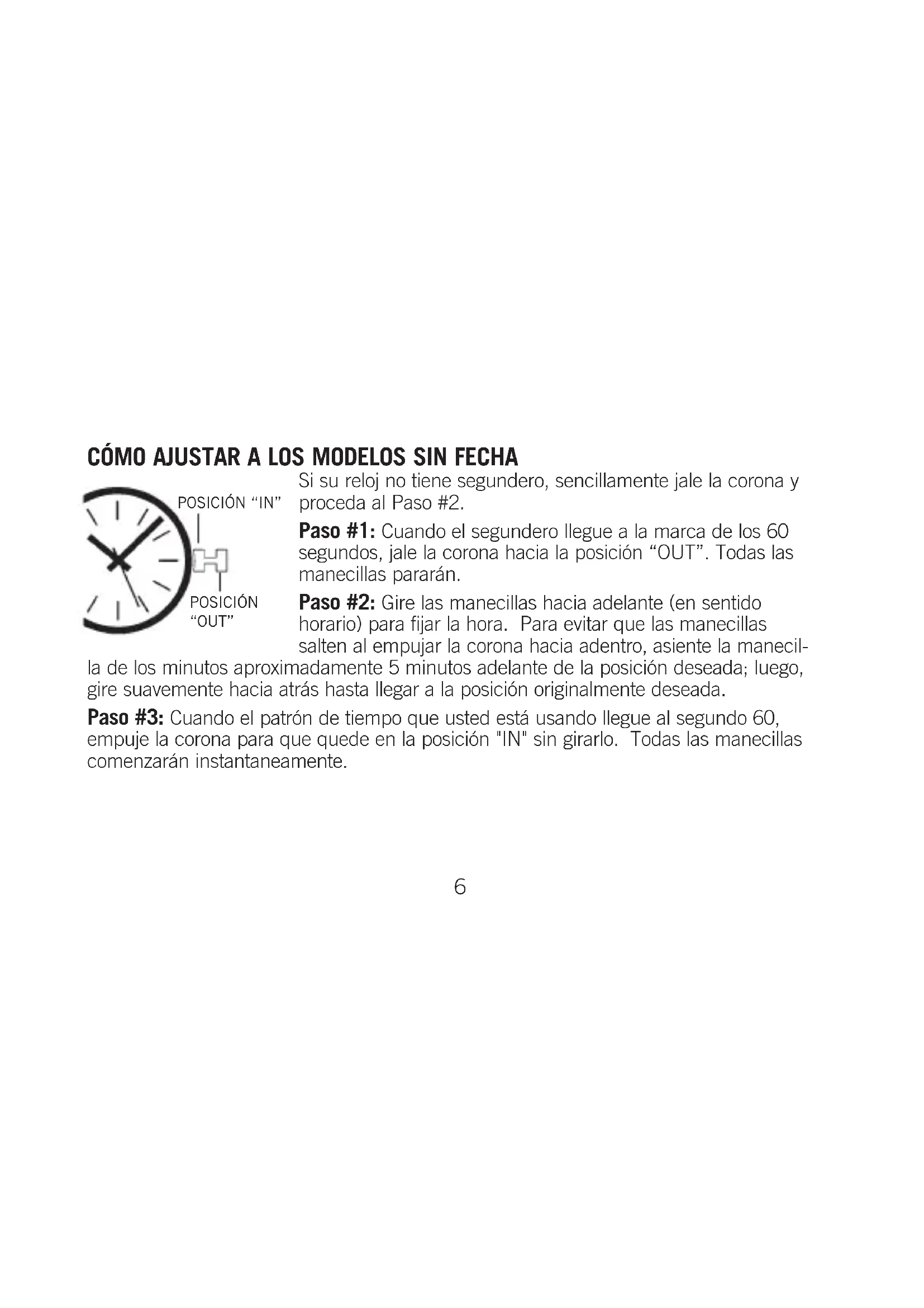CÓMO AJUSTAR A LOS MODELOS SIN FECHA Si su reloj no tiene segundero, sencillamente jale la corona y proceda al Paso #2. Paso #1: Cuando el segundero llegue a la marca de los 60 segundos, jale la corona hacia la posición “OUT”. Todas las manecillas pararán. Paso #2: Gire las manecillas hacia adelante (en sentido horario) para fijar la hora. Para evitar que las manecillas salten al empujar la corona hacia adentro, asiente la manecil- la de los minutos aproximadamente 5 minutos adelante de la posición deseada; luego, gire suavemente hacia atrás hasta llegar a la posición originalmente deseada. Paso #3: Cuando el patrón de tiempo que usted está usando llegue al segundo 60, empuje la corona para que quede en la posición "IN" sin girarlo. Todas las manecillas comenzarán instantaneamente.