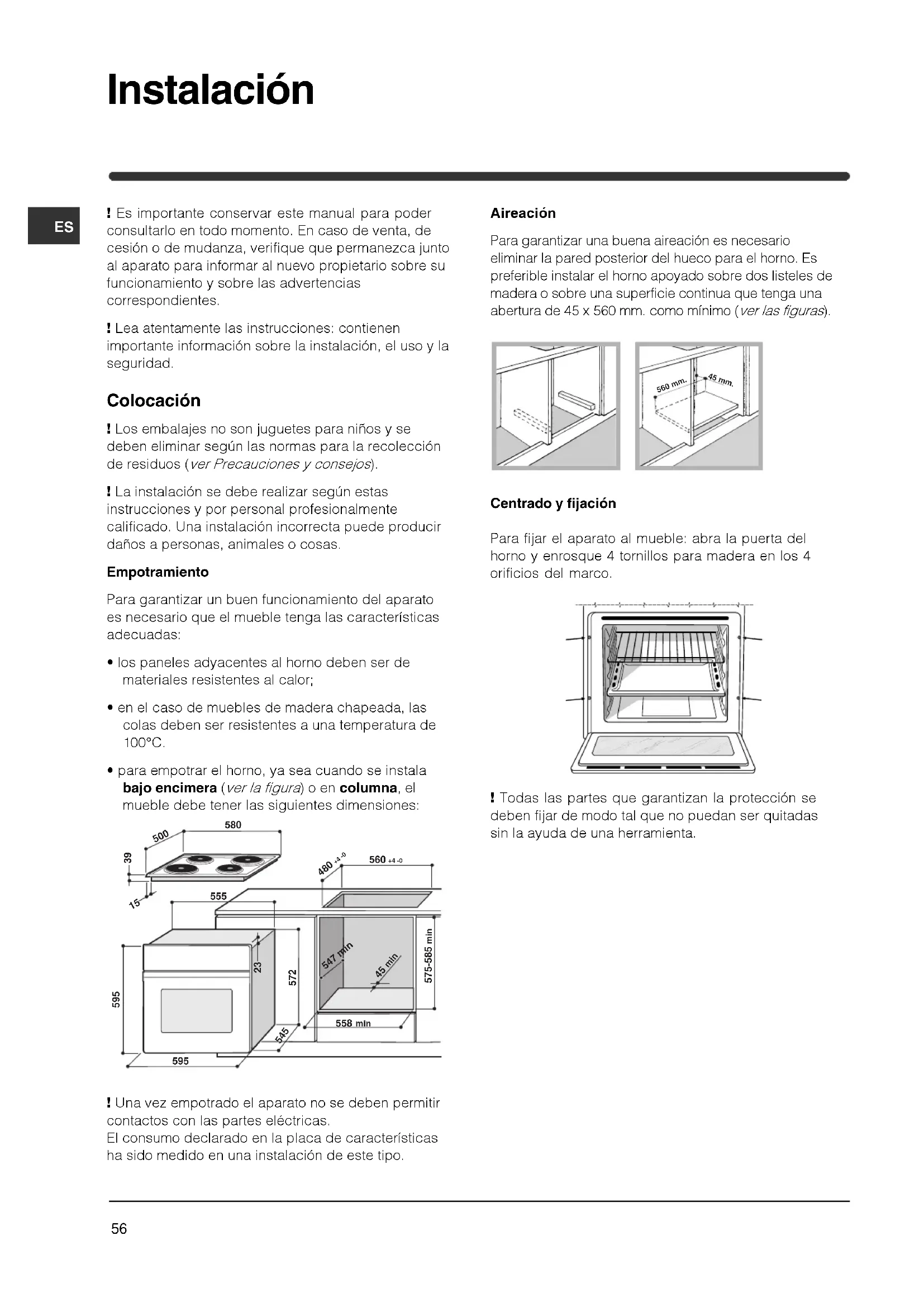 ! Μη χρησιμοποιείτε τη λυχνία φούρνου για το φωτισμό χώρων.ES ! Es importante conservar este manual para poder consultarlo en todo momento. En caso de venta, de cesión o de mudanza, verifique que permanezca junto al aparato para informar al nuevo propietario sobre su funcionamiento y sobre las advertencias correspondientes. ! Lea atentamente las instrucciones: contienen importante información sobre la instalación, el uso y la seguridad. Colocación ! Los embalajes no son juguetes para niños y se deben eliminar según las normas para la recolección de residuos (ver Precauciones y consejos). ! La instalación se debe realizar según estas instrucciones y por personal profesionalmente calificado. Una instalación incorrecta puede producir daños a personas, animales o cosas. Empotramiento Para garantizar un buen funcionamiento del aparato es necesario que el mueble tenga las características adecuadas: