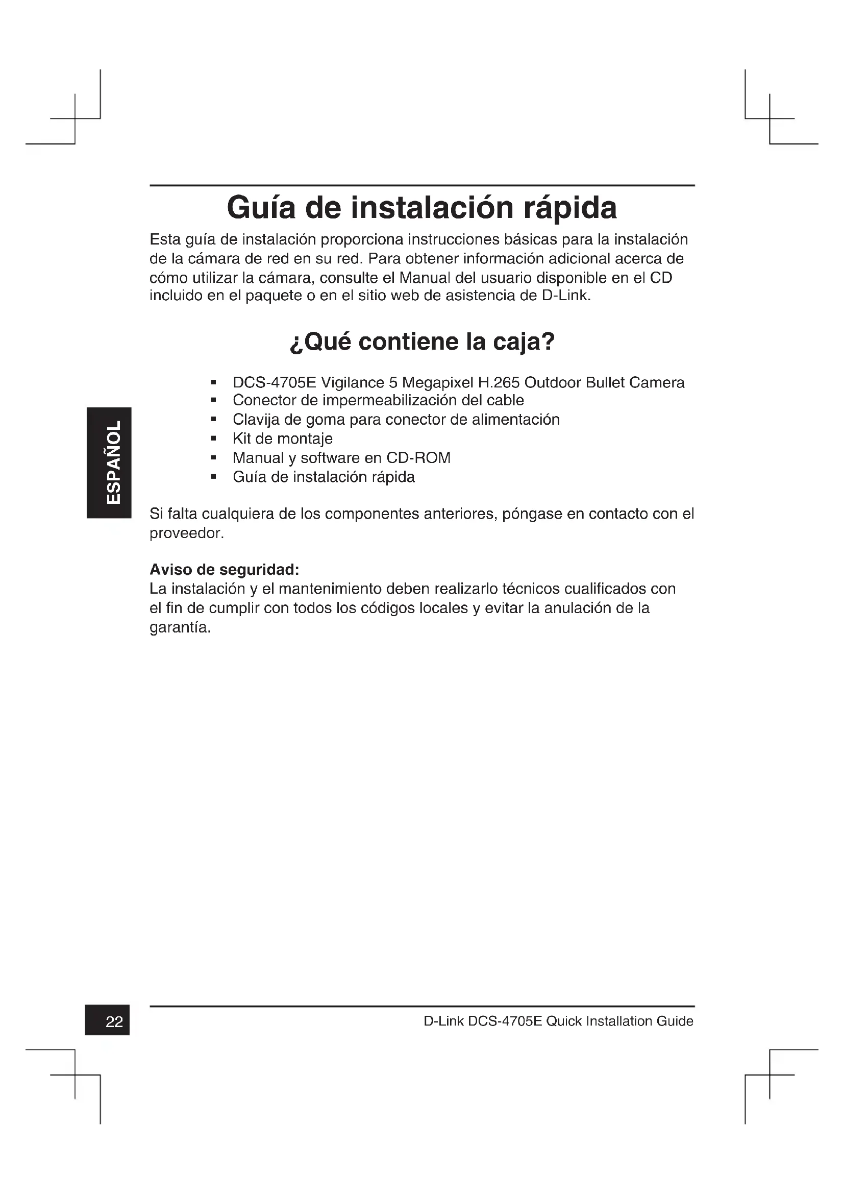 D-Link DCS-4705E Quick Installation Guide ESPAÑOL Guía de instalación rápida Esta guía de instalación proporciona instrucciones básicas para la instalación de la cámara de red en su red. Para obtener información adicional acerca de cómo utilizar la cámara, consulte el Manual del usuario disponible en el CD incluido en el paquete o en el sitio web de asistencia de D-Link. ¿Qué contiene la caja? DCS-4705E Vigilance 5 Megapixel H.265 Outdoor Bullet Camera Conector de impermeabilización del cable Clavija de goma para conector de alimentación Kit de montaje Manual y software en CD-ROM Guía de instalación rápida Si falta cualquiera de los componentes anteriores, póngase en contacto con el proveedor. Aviso de seguridad: La instalación y el mantenimiento deben realizarlo técnicos cualificados con el fin de cumplir con todos los códigos locales y evitar la anulación de la garantía.23