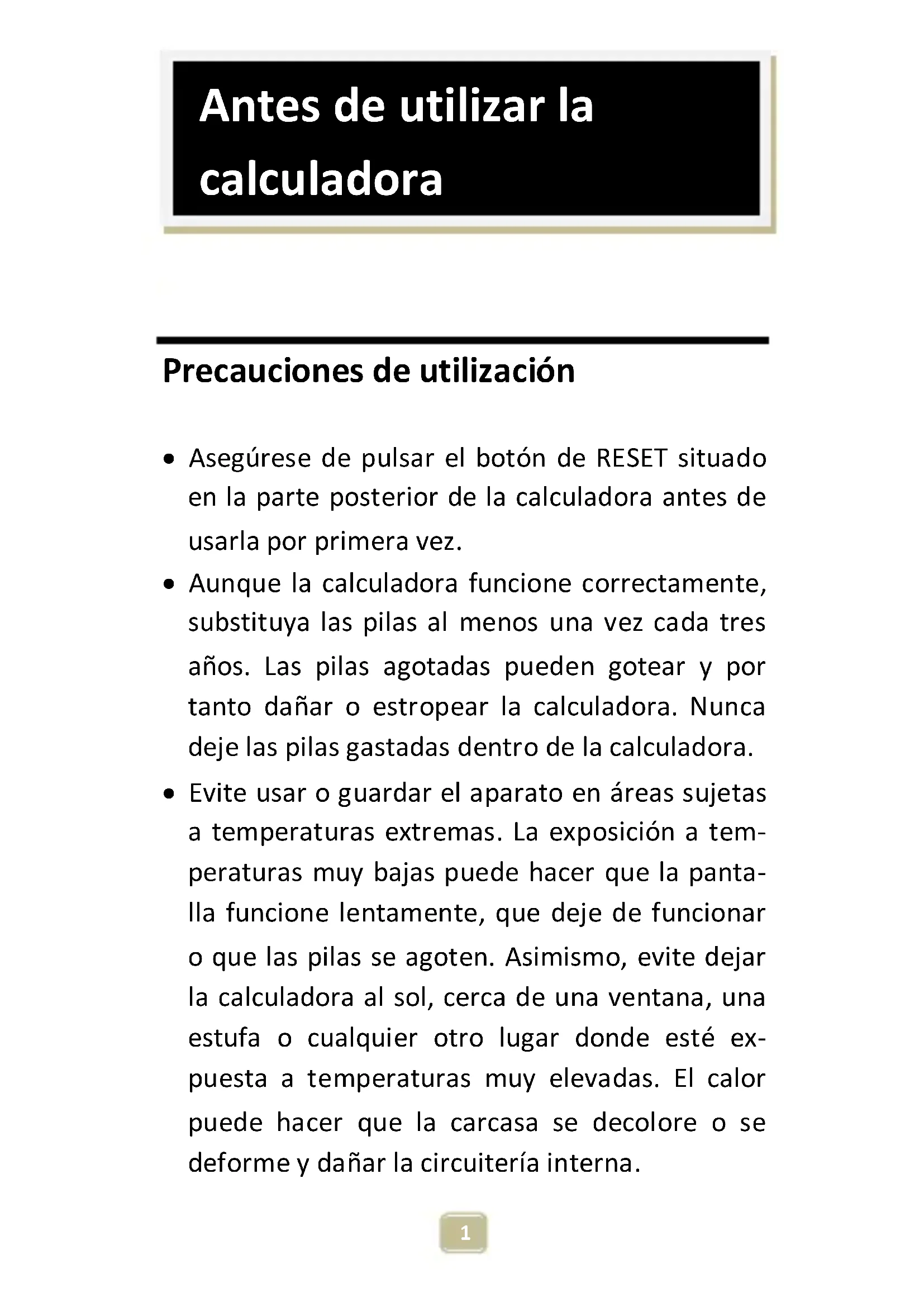 - Evite usar o guardar el aparato en lugares sometidos a la humedad y al polvo. Nunca deje la calculadora en lugares donde pueda salpi- carle agua o pueda estar expuesta a un grado elevado de humedad o polvo. Estos elementos podrían dañar sus circuitos internos.