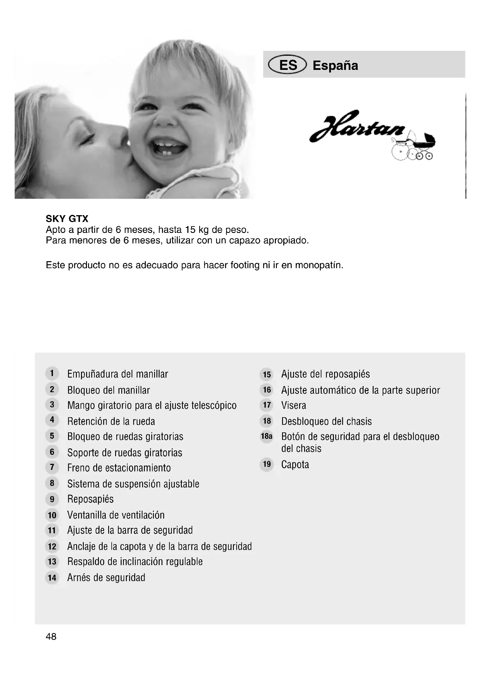 SKY GTX Apto a partir de 6 meses, hasta 15 kg de peso. Para menores de 6 meses, utilizar con un capazo apropiado. Este producto no es adecuado para hacer footing ni ir en monopatín.