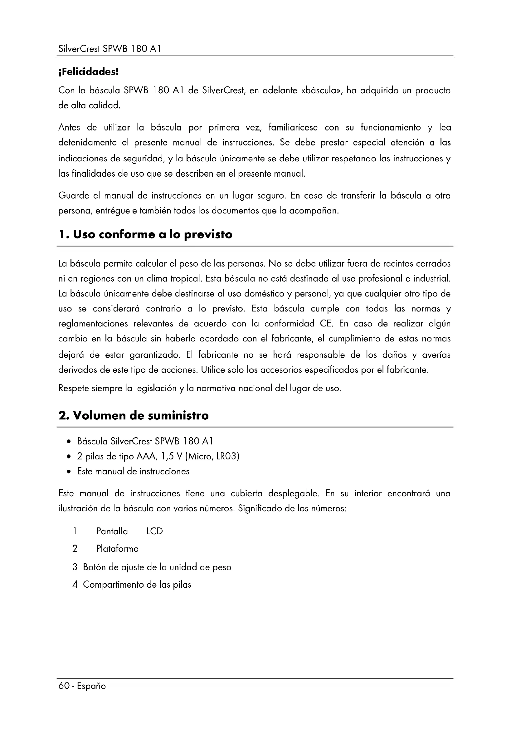 Báscula SilverCrest SPWB 180 A1 2 pilas de tipo AAA, 1,5 V (Micro, LR03) Este manual de instrucciones Este manual de instrucciones tiene una cubierta desplegable. En su interior encontrará una ilustración de la báscula con varios números. Significado de los números: 1 Pantalla LCD 2 Plataforma 3 Botón de ajuste de la unidad de peso 4 Compartimento de las pilasSilverCrest SPWB 180 A1 Español - 61
