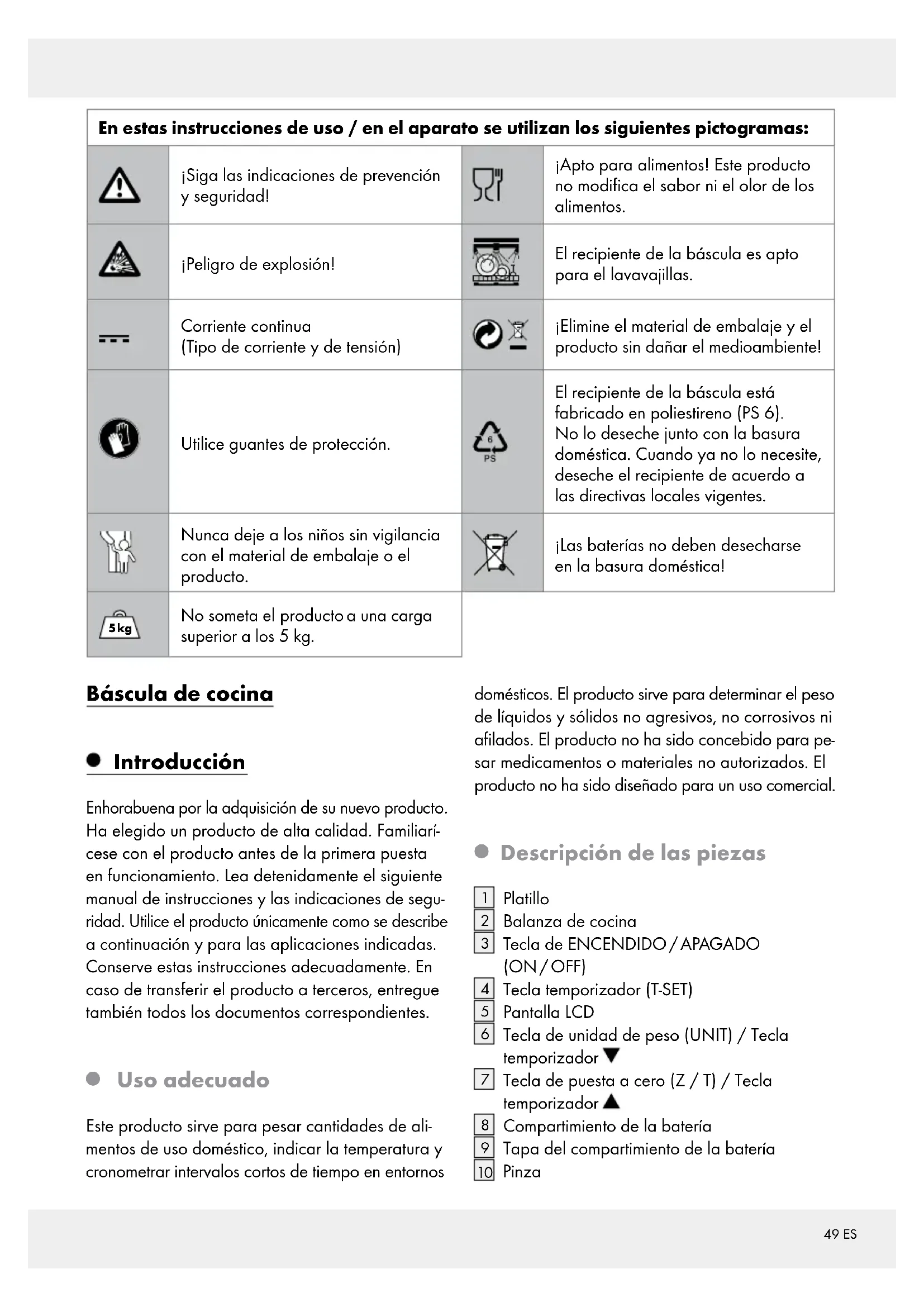Uso adecuado Este producto sirve para pesar cantidades de ali- mentos de uso doméstico, indicar la temperatura y cronometrar intervalos cortos de tiempo en entornos domésticos. El producto sirve para determinar el peso de líquidos y sólidos no agresivos, no corrosivos ni afilados. El producto no ha sido concebido para pe- sar medicamentos o materiales no autorizados. El producto no ha sido diseñado para un uso comercial.
