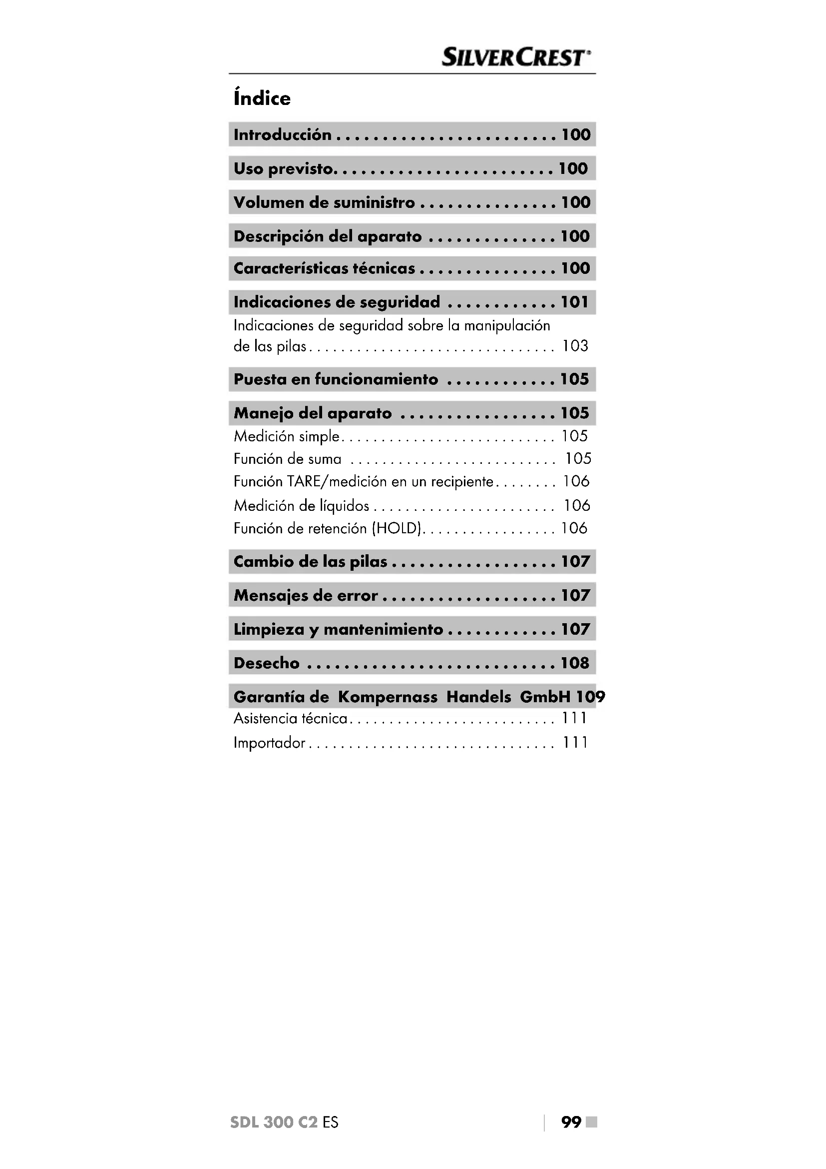 ES ADVERTENCIA: ¡PELIGRO DE LESIONES! ► Solo los talleres autorizados o el servicio de asistencia técnica pueden reparar el aparato. Una reparación inadecuada puede provocar riesgos considerables para el usuario. Además, se anulará la garantía. ATENCIÓN: ¡DAÑOS MATERIALES! ► Los componentes defectuosos de- ben sustituirse exclusivamente por recambios originales. Solo puede garantizarse el cumplimiento de los requisitos de seguridad con el uso de estos recambios. ► ¡No utilice la cuchara para medir alimentos/líquidos calientes! ► Proteja el aparato frente a la hume- dad y a la penetración de líquidos. ► No coloque objetos sobre la cu- chara cuando no esté en uso. ► Proteja la cuchara medidora frente a los golpes, la humedad, el polvo, las sustancias químicas, las osci- laciones fuertes de temperatura y la proximidad a fuentes de calor (hornos, calefactores). ► No presione los botones con fuerza ni con objetos puntiagudos.SDL 300 C2 ES